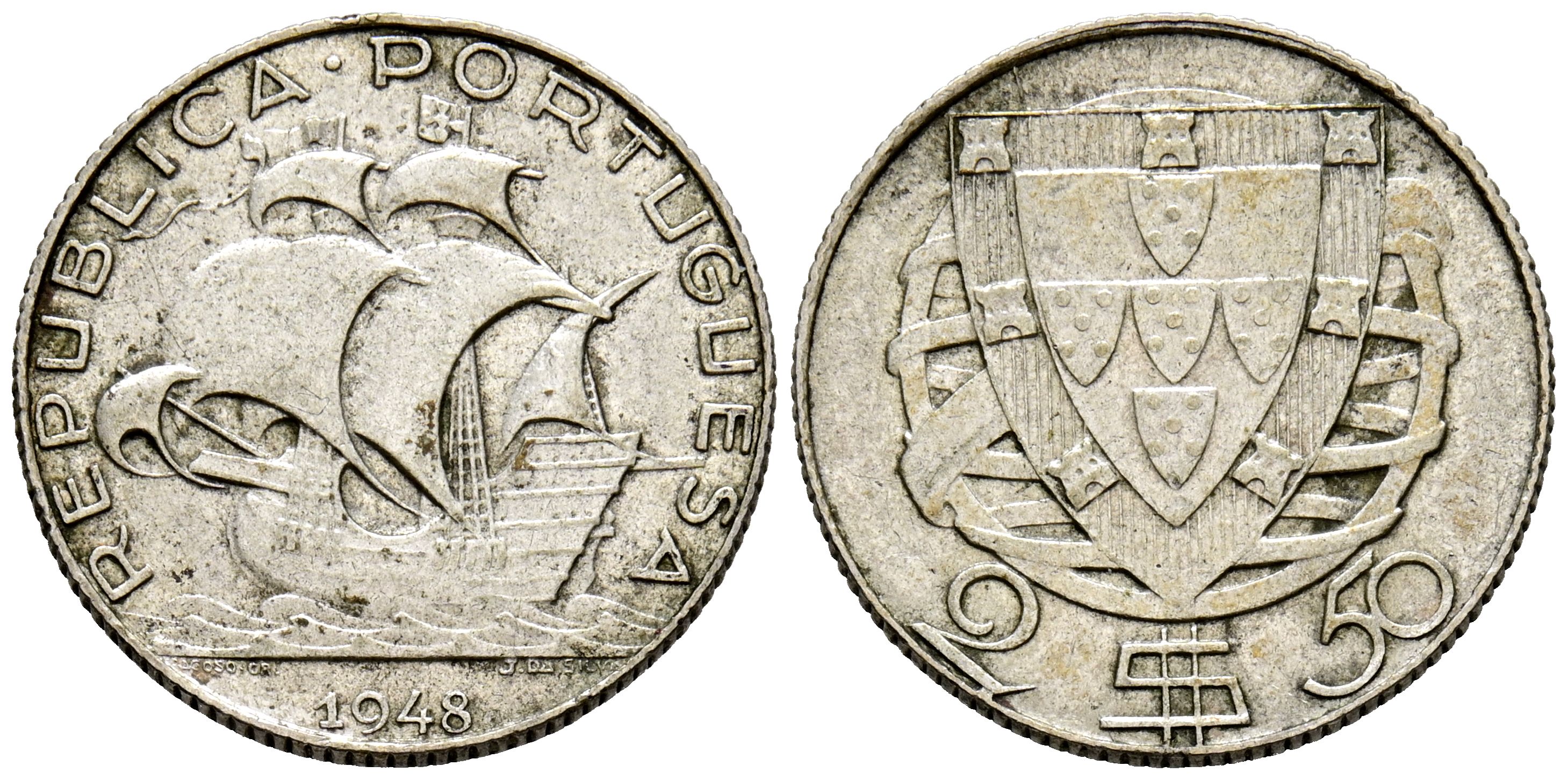PORTUGAL. 2,50 escudos. (Ar. 3,56g/20mm). 1948. (Km#580; Gomes 30.11). MBC+. Escasa.