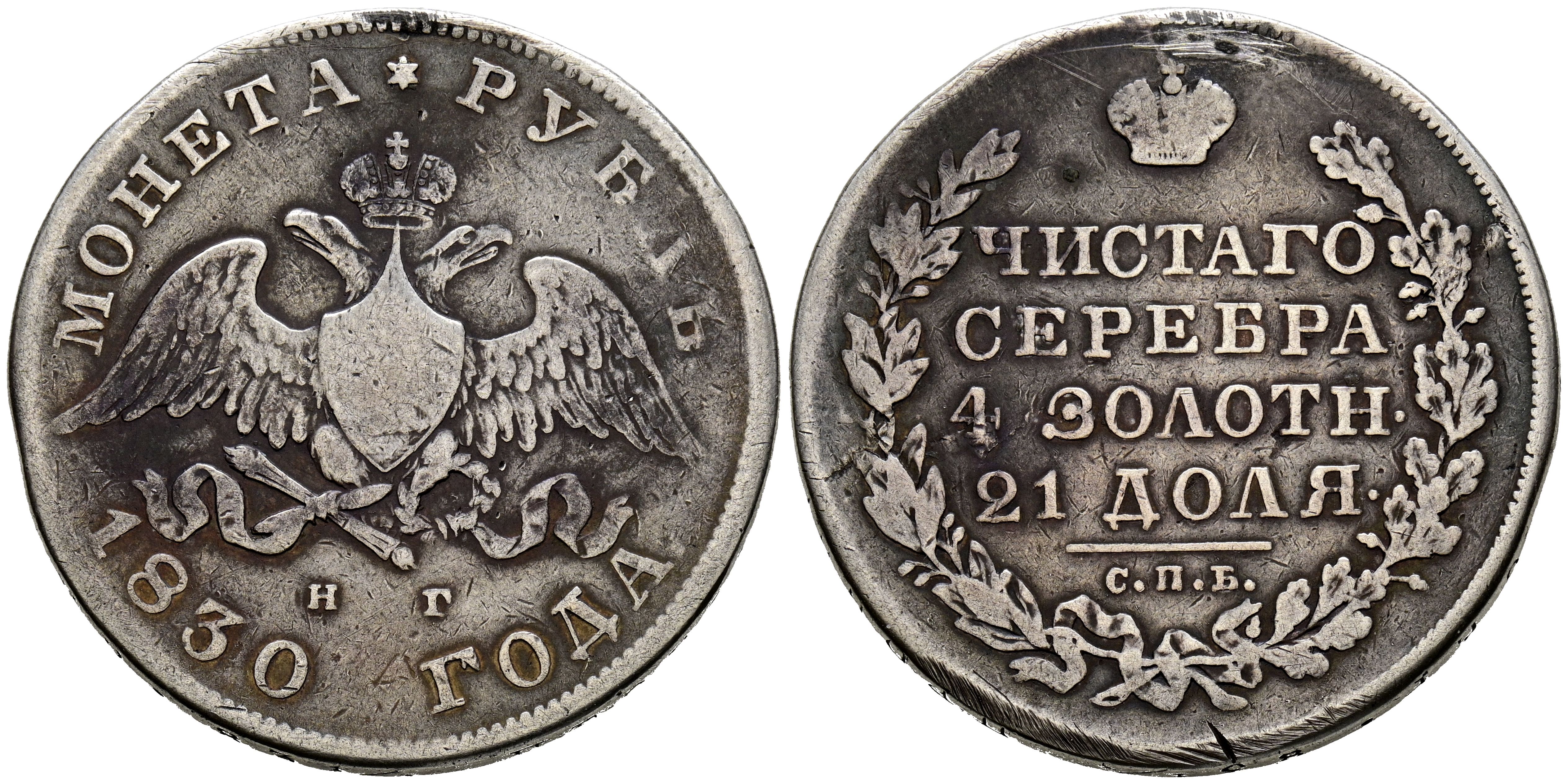 RUSIA. 1 Rublo (Ar. 19,85g/35mm). 1830. San Petersburgo. (Km#161). MBC-. Agujero tapado.