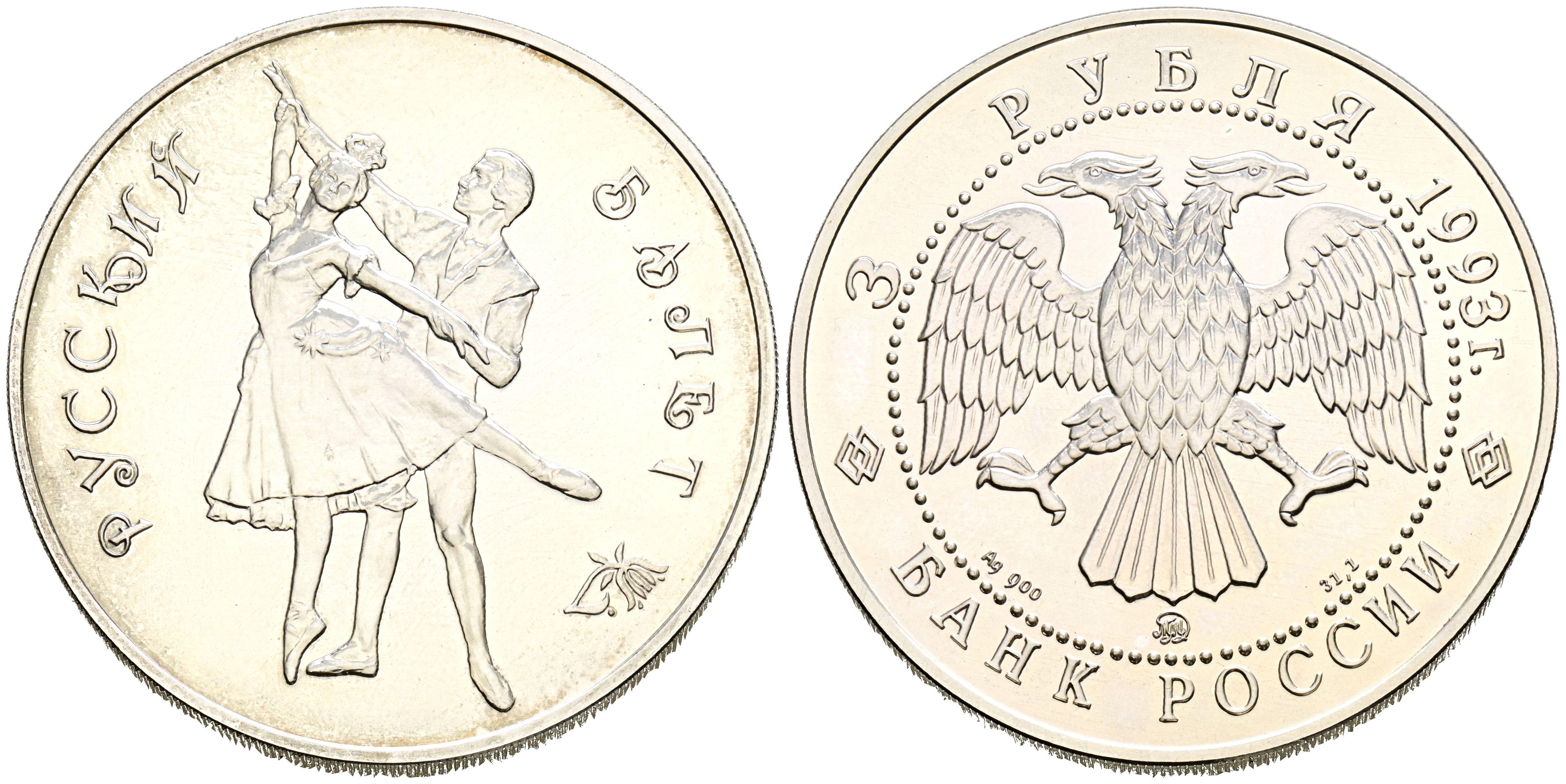 RUSIA. 3 Rublos. (Ar. 34,76g/39mm). 1993. Ballet Ruso. (Km#323). EBC+. Rayitas.
