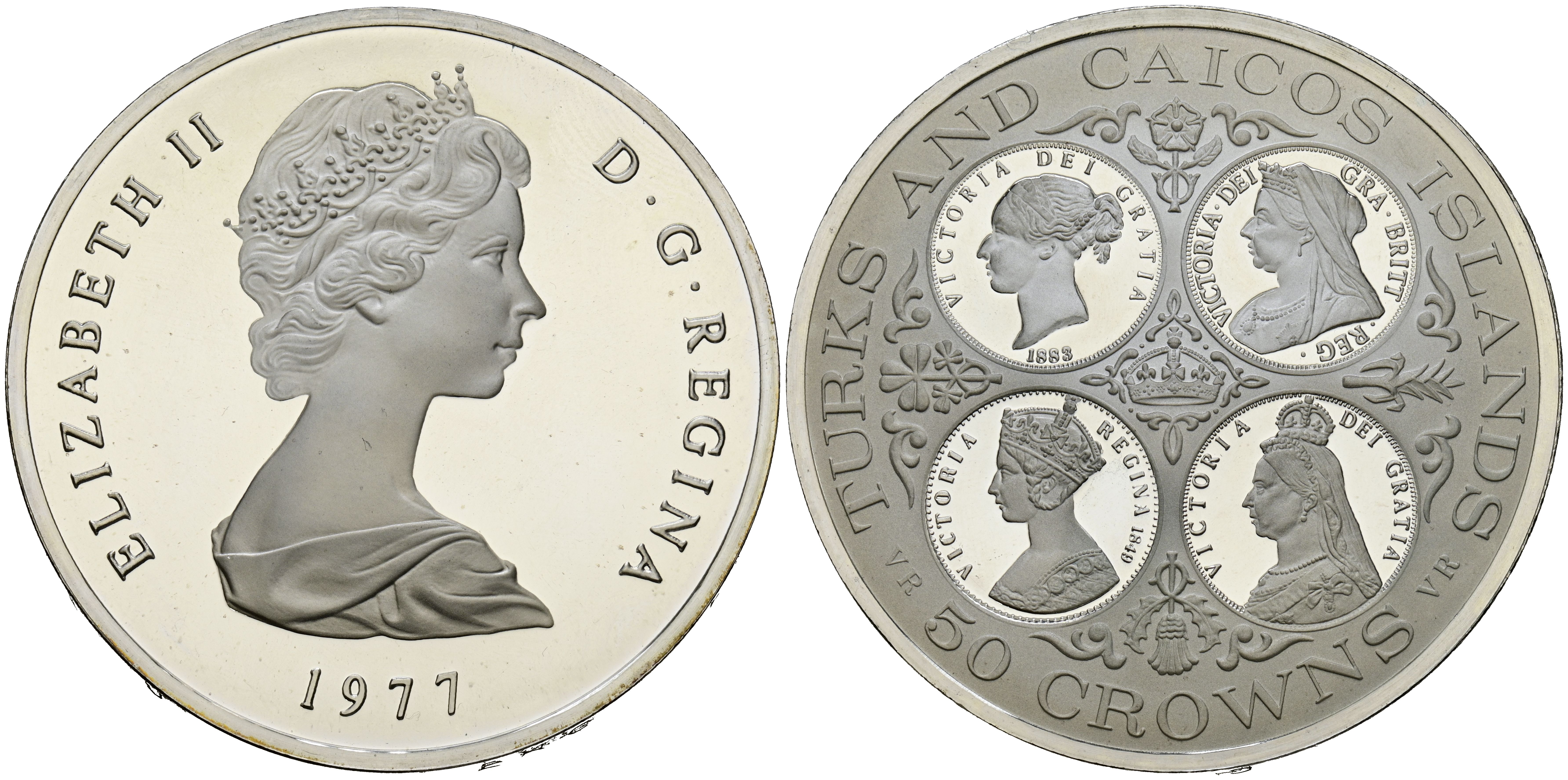 TURKS AND CAICOS. 50 Crowns. (Ar. 54,30g/50mm). 1977. Isabel II. Cuatro Victorias. (Km#16). PROOF.