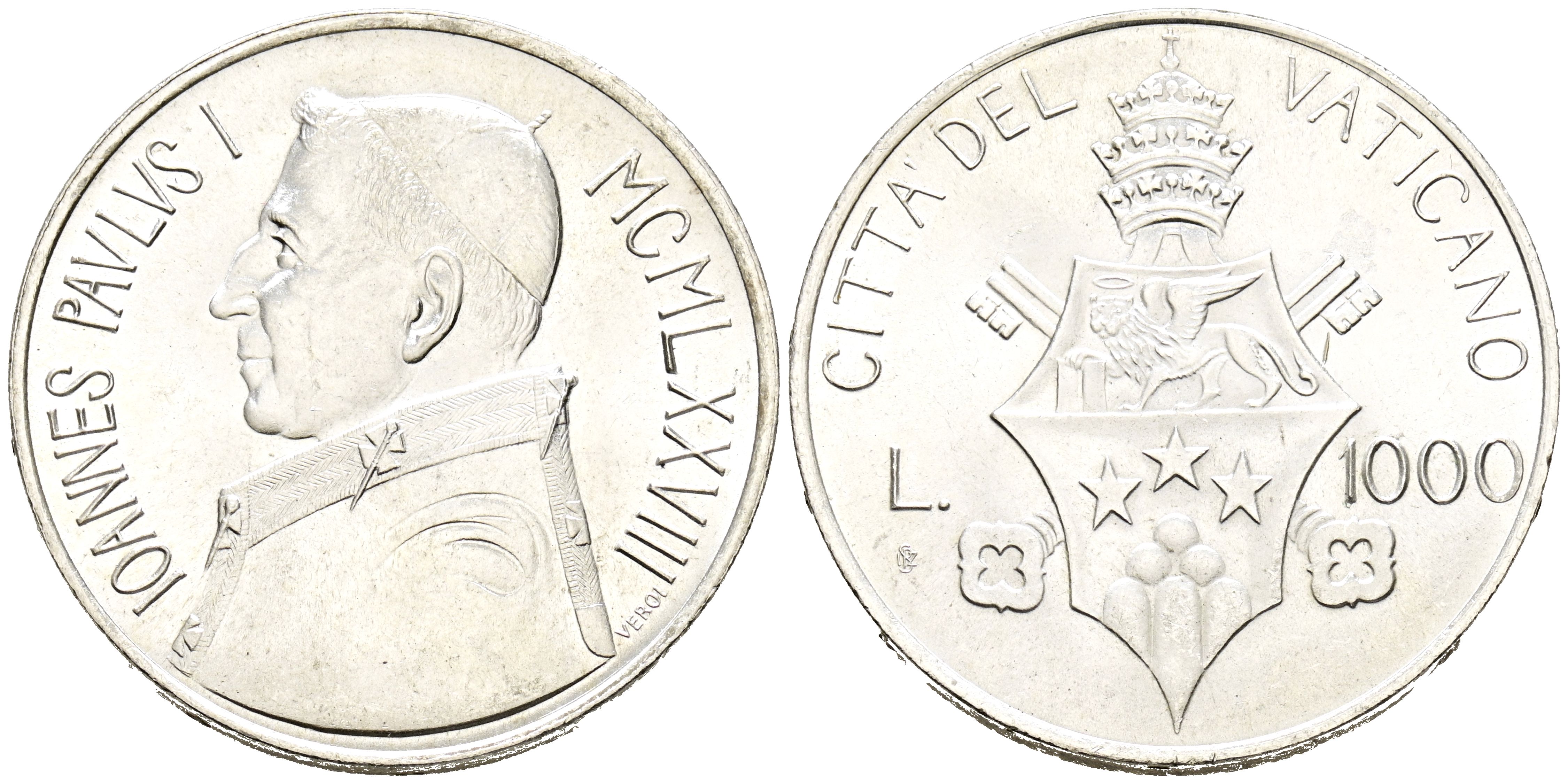 VATICANO. 1000 Liras (Ar. 14,60g/32mm). 1978. Juan Pablo I. (Km#172). EBC.