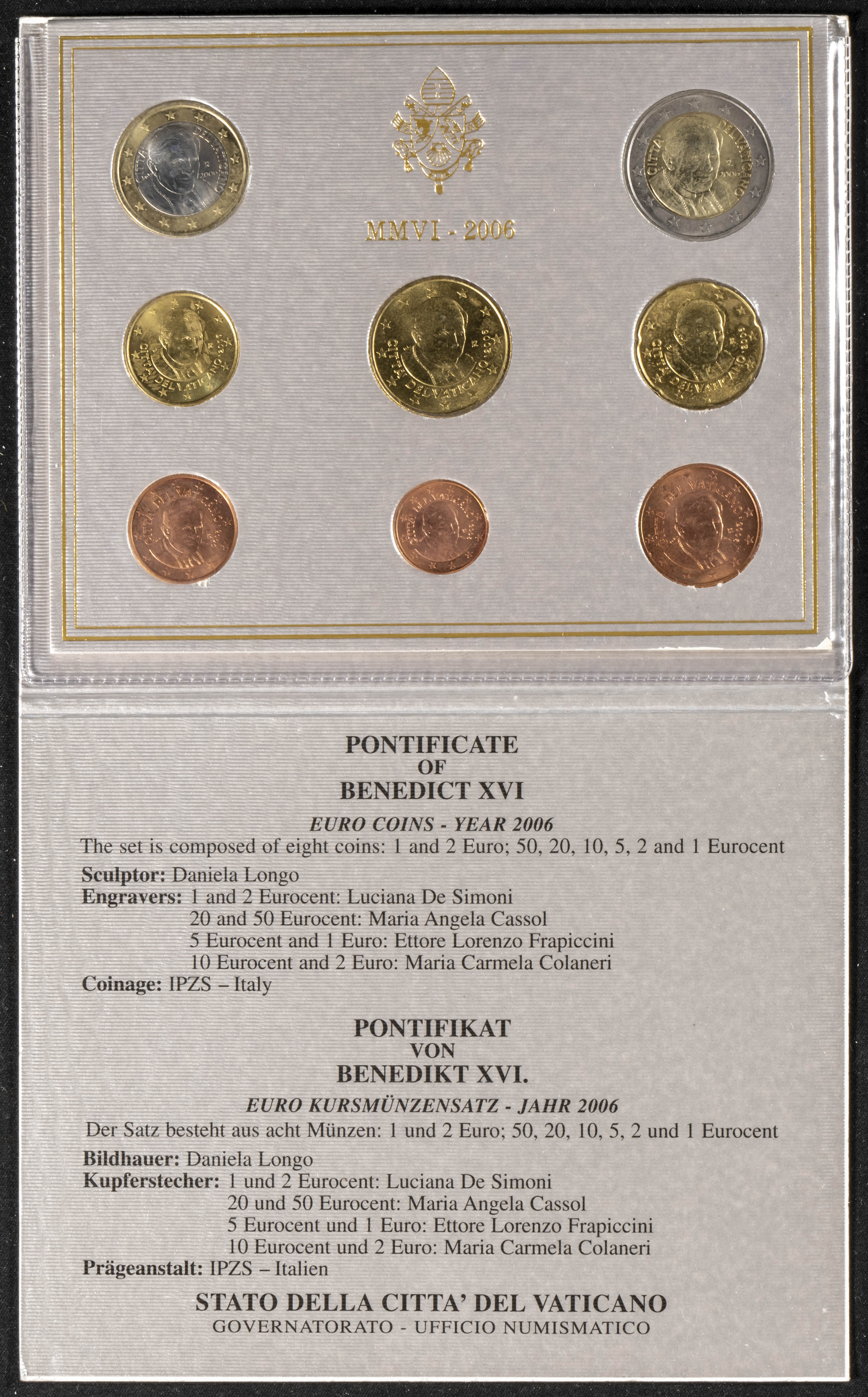 VATICANO. Set oficial completo con 8 valores comprendidos entre 1 Céntimo y 2 Euros. 2006. Benedicto XVI. Estuche completo con certificado de autenticidad. FDC.
