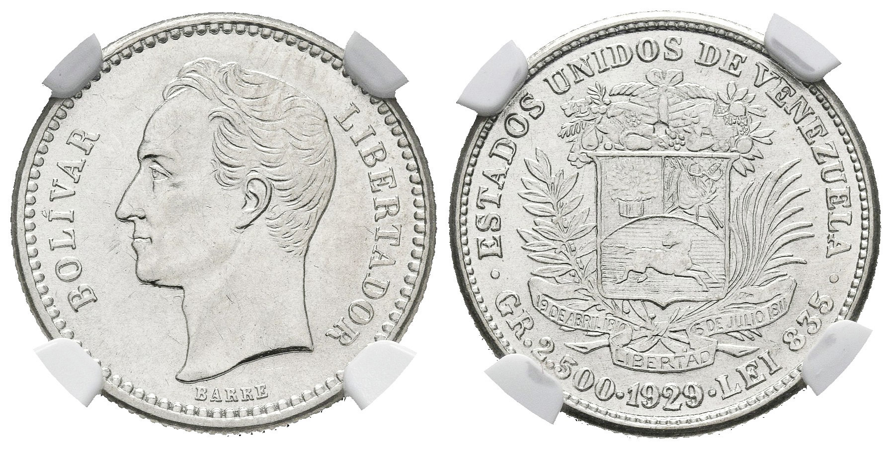 ESTADOS UNIDOS DE VENEZUELA. 1/2 Bolívar. (Ar. 2,50g/18mm). 1929. (Km#Y21). Encapsulado NGC MS-61.