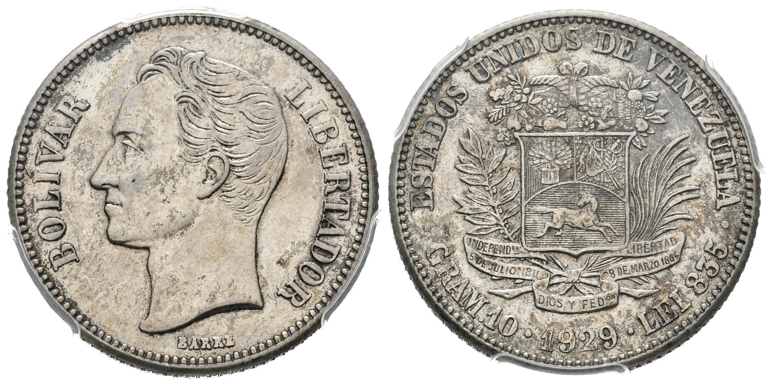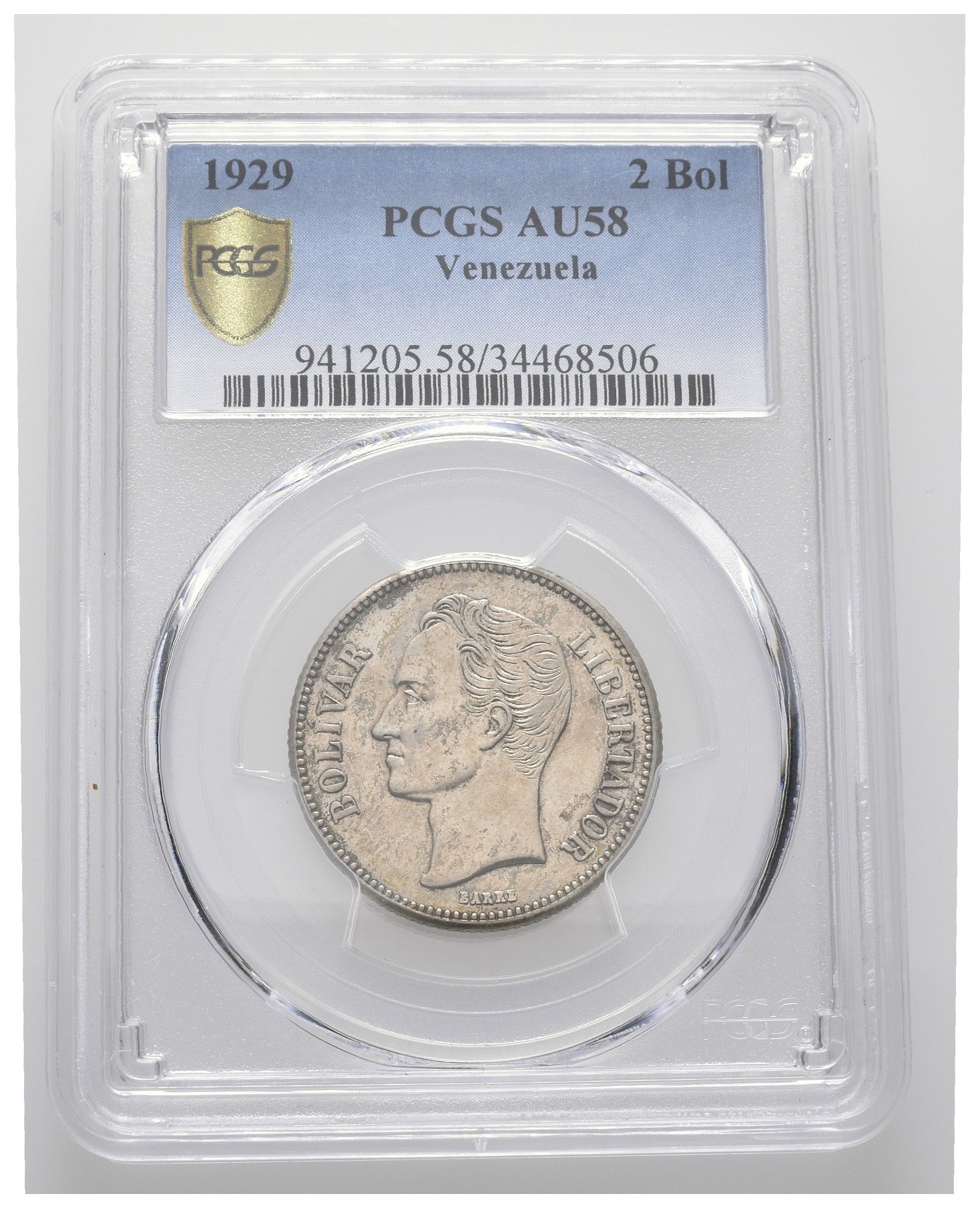 ESTADOS UNIDOS DE VENEZUELA. 2 Bolívares. (Ar. 10,00g/27mm). 1929. Philadelphia. (Km#Y23). Encapsulado PCGS AU-58.