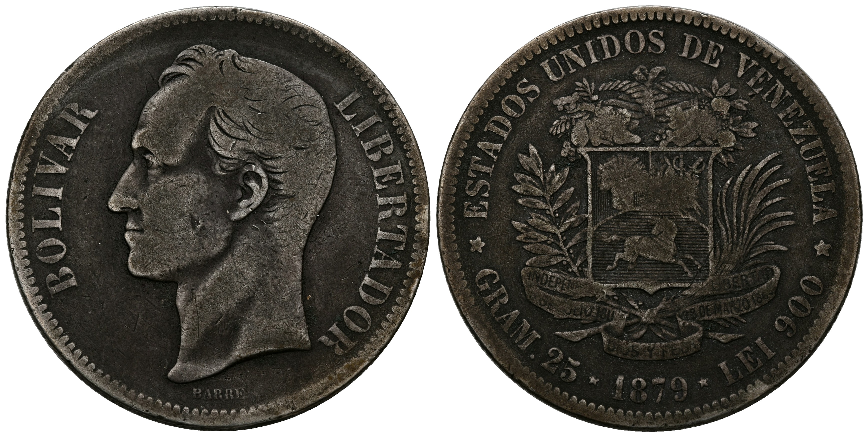 ESTADOS UNIDOS DE VENEZUELA. 5 Bolívares (Ar. 24,34g/37mm). 1879 (primer año de esta serie). Bruselas. (Km#Y24.1). BC+. Bonita pátina óscura.