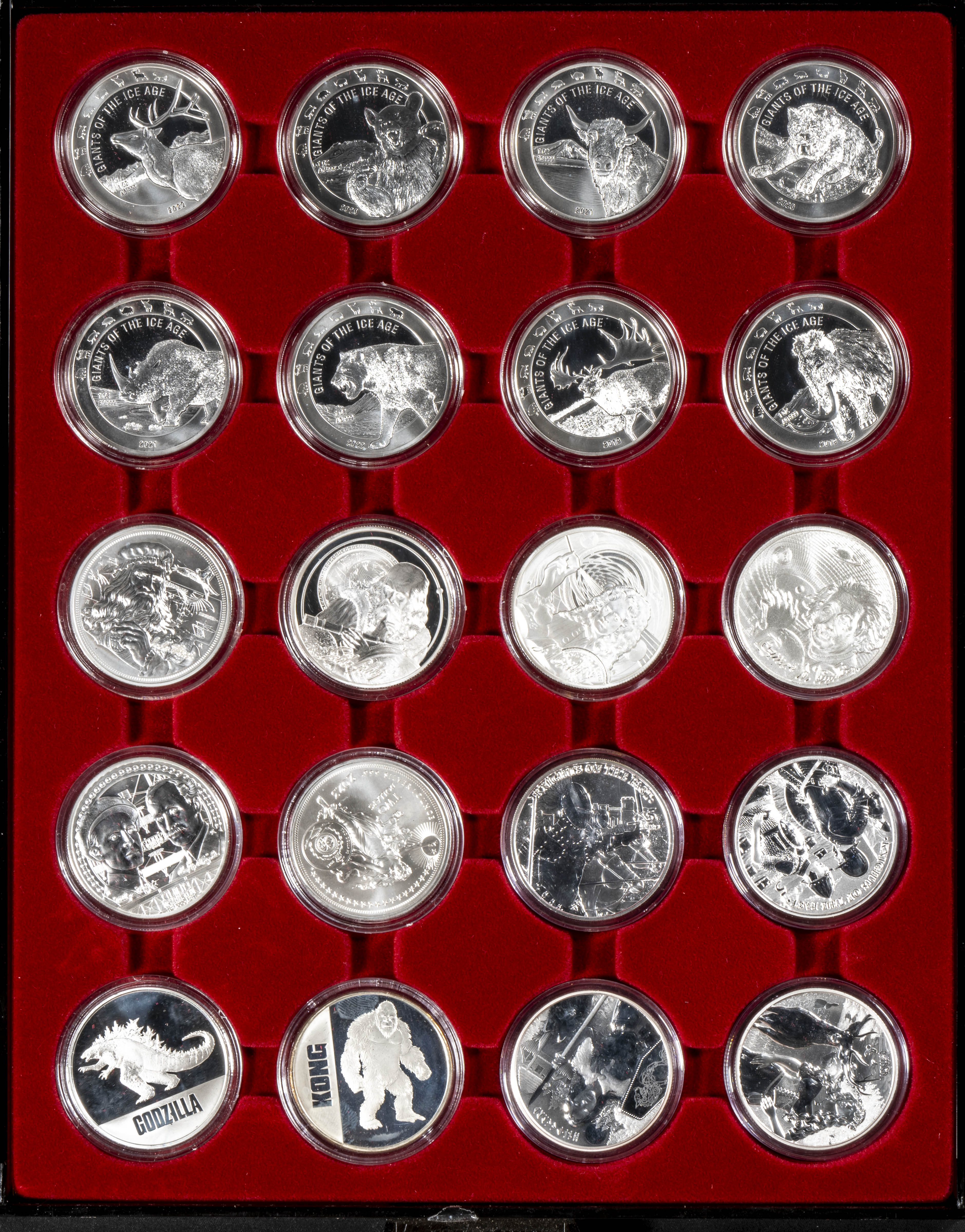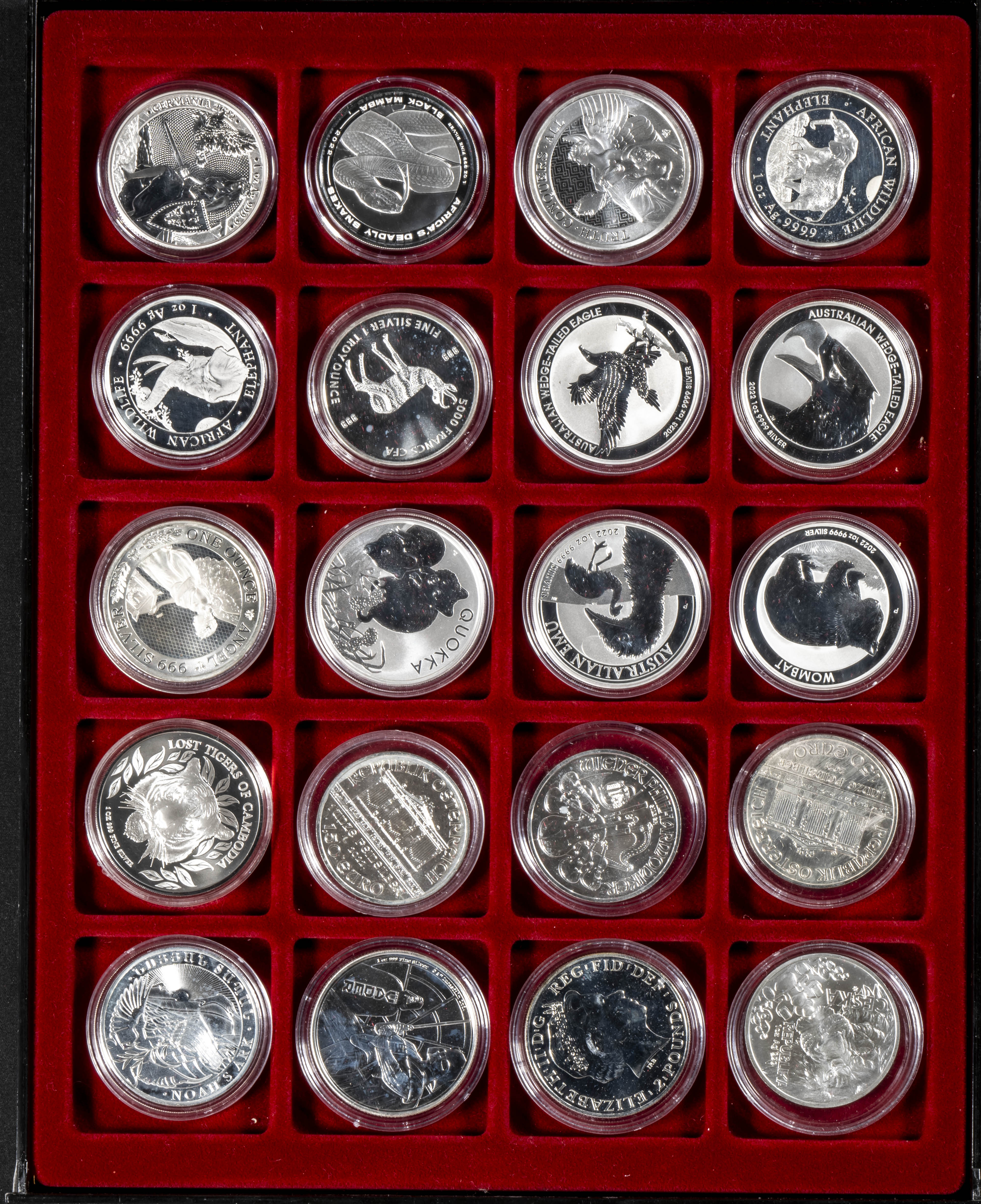 MONEDAS EXTRANJERAS. Espectacular colección formada por 100 monedas de plata conmemorativas, tipo onza, de diferentes países (principalmente de la Commonwelth) y de diferentes fechas. Magnífico nivel de conservación general. Incluye bandejas y cápsulas. A EXAMINAR.