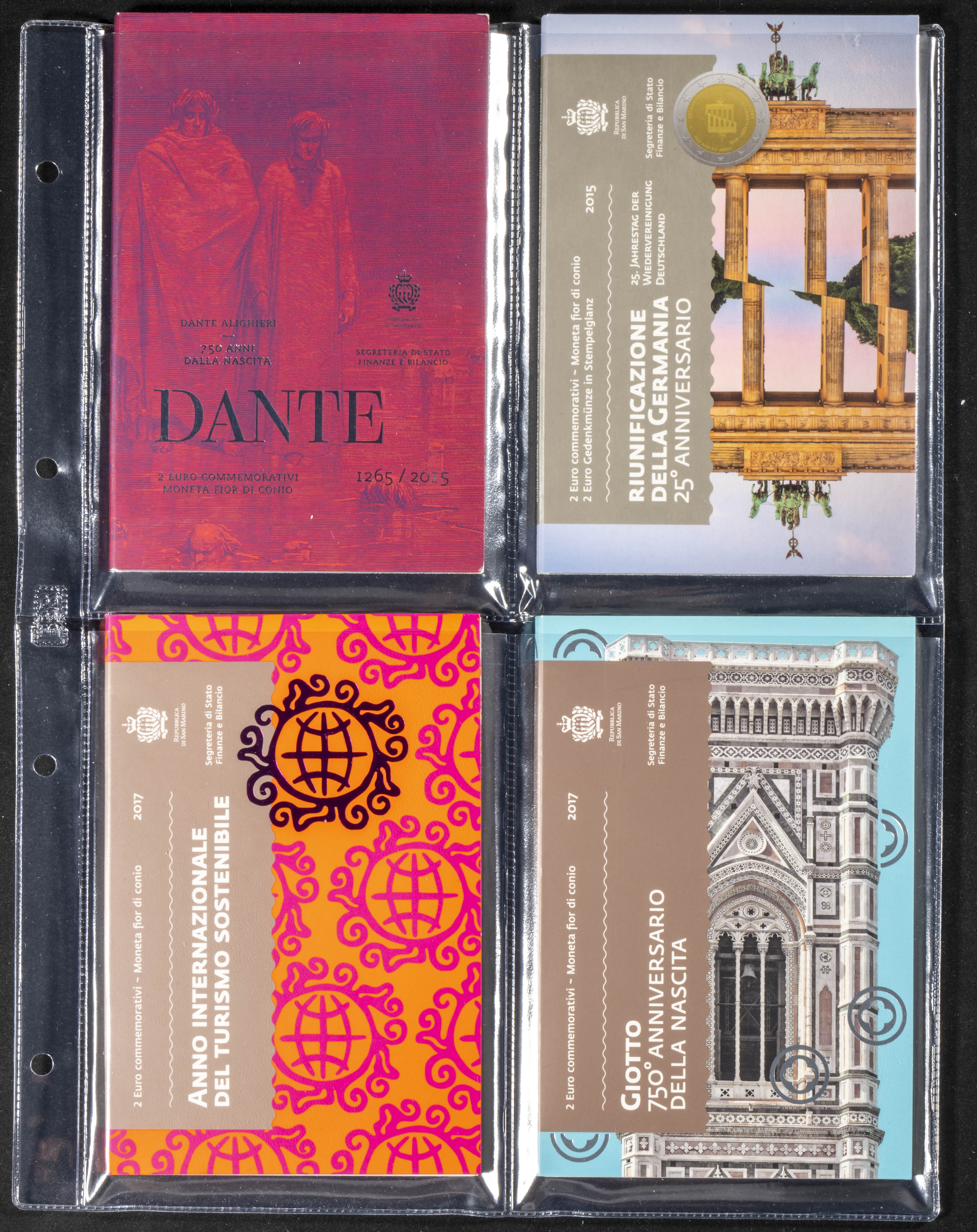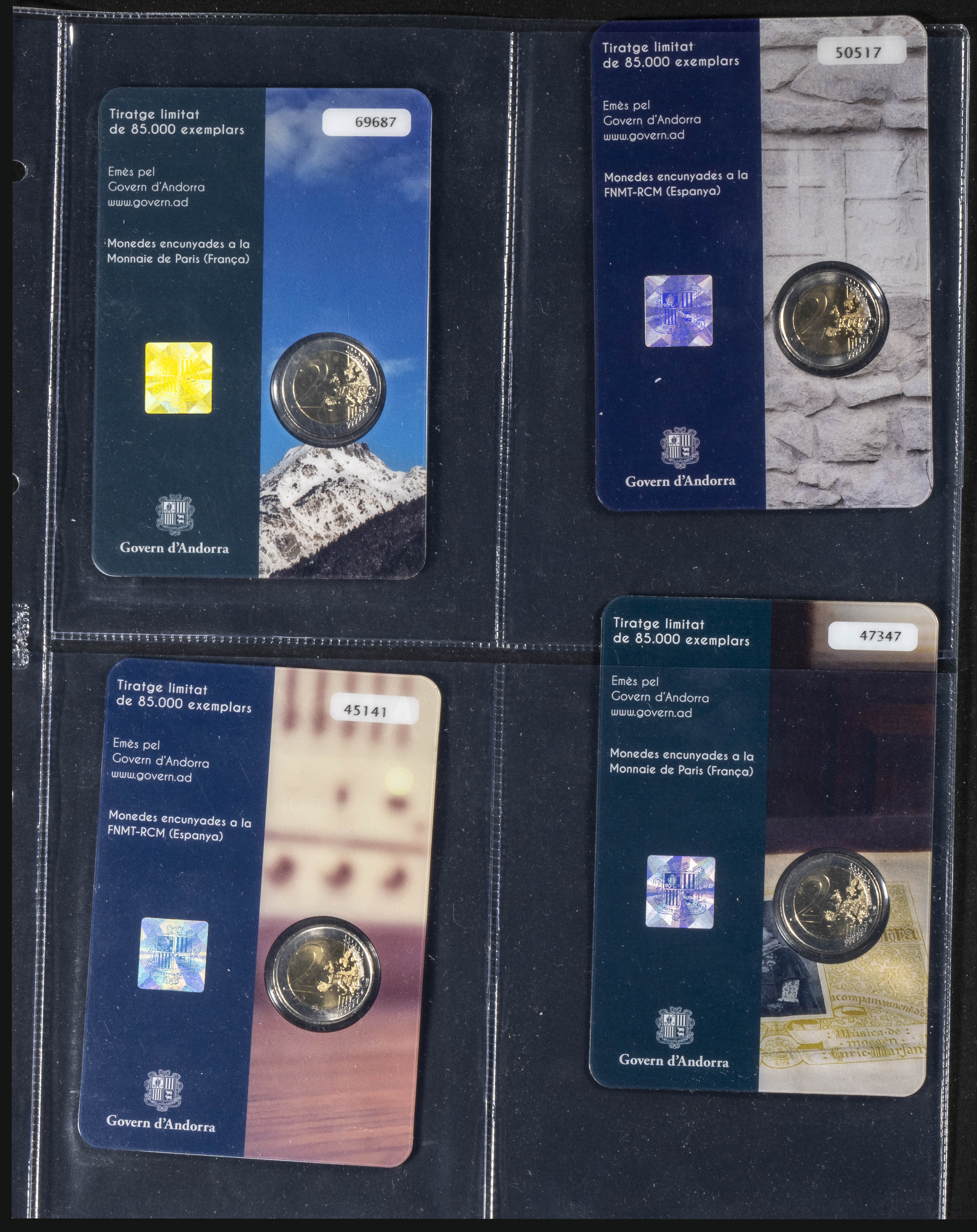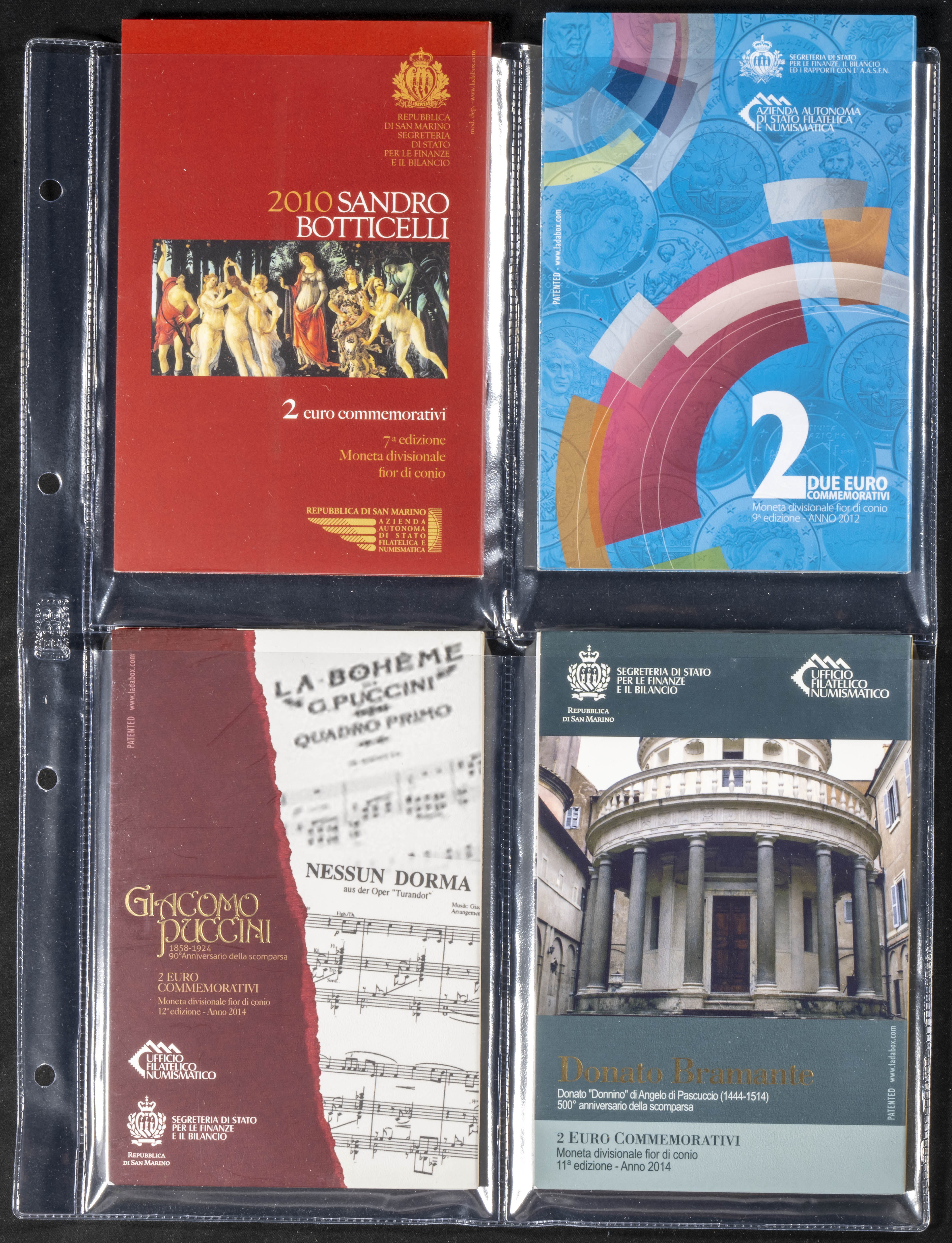 EUROS. Magnífica y extensa colección de monedas conmemorativas, principalmente, de 2€. Gran variedad de países y fechas represantadas y destacando una gran cantidad de sets y carteras oficiales entre las que destacan una importante selección de San Marino y Andorra. El conjunto se completa con una bonita selección de piezas en plata españolas con valores de 12,30 y 40€. Gran mayoría de las piezas de la colección en estado SC. Se incluyen álbumes y bandejas Leuchtturm. A EXAMINAR