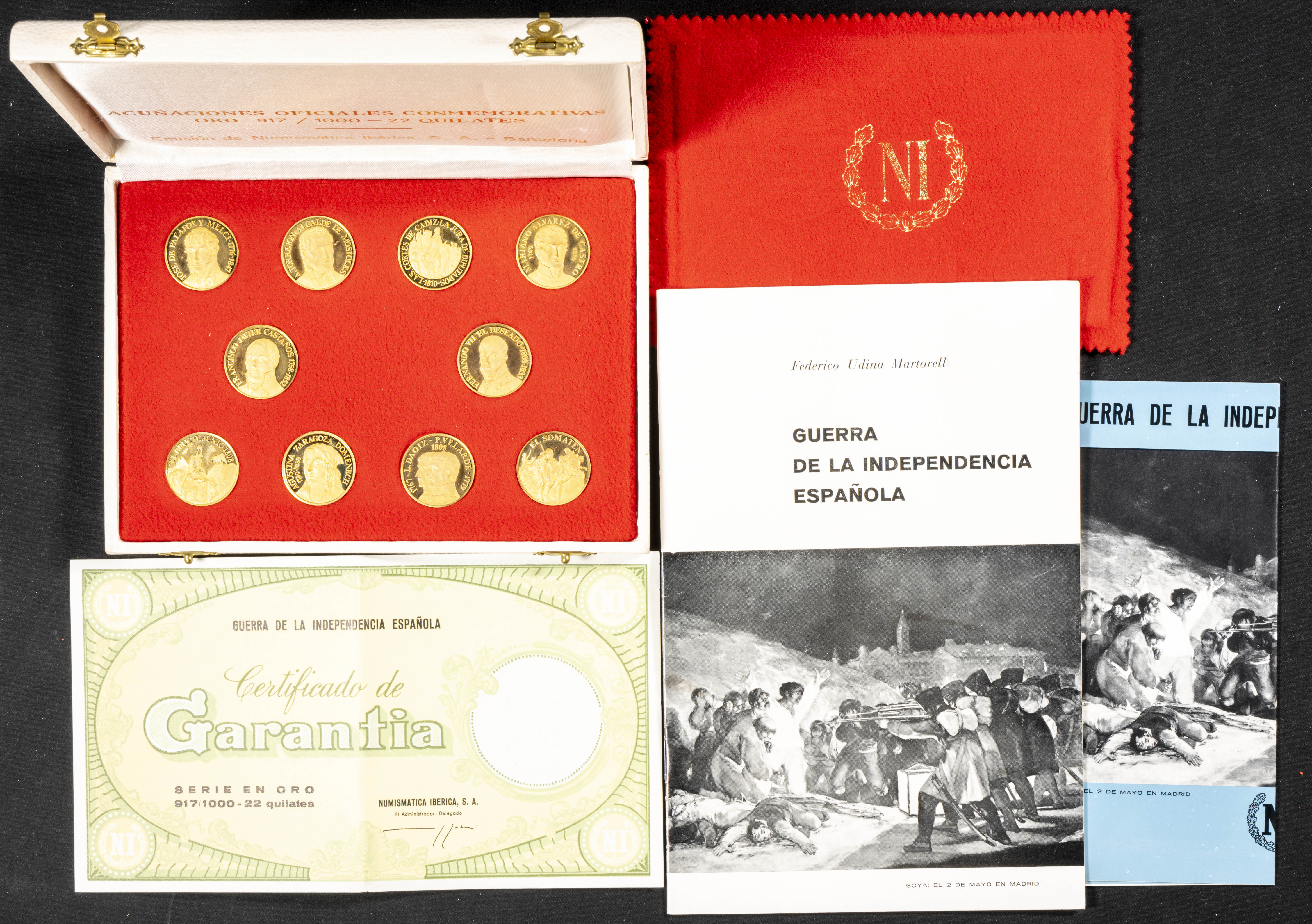ESPAÑA. Estuche completo formado por 10 medallas de la colección Guerra de la Independencia Española. Numismática Ibérica. Peso total del conjunto en oro: 69,33g (Peso por moneda aprox: 7g). Oro de 0,917. Incluye certificado de autenticidad y libreto explicativo. Magnífico estado de conservación.