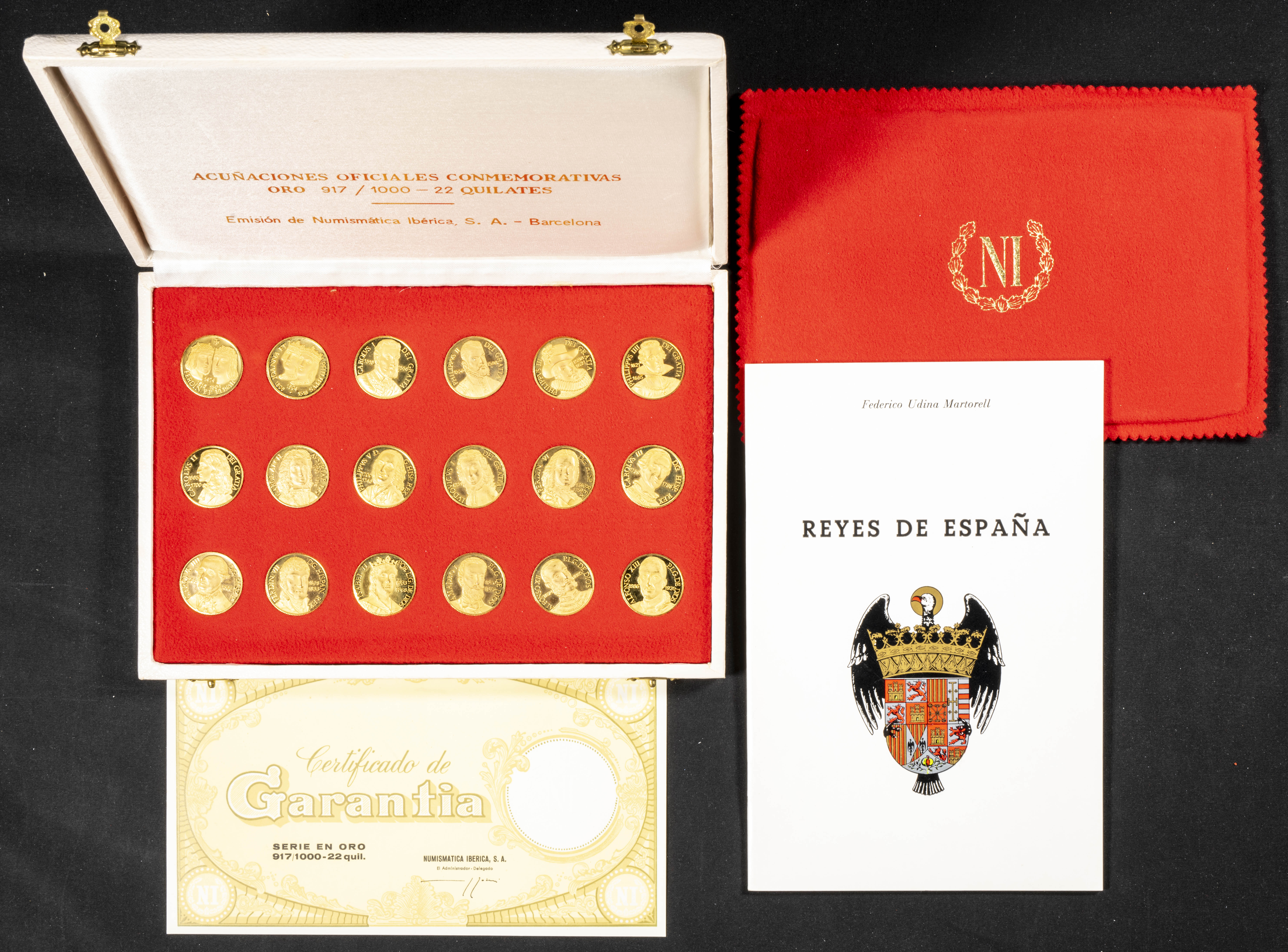 ESPAÑA. Estuche completo formado por 18 medallas de la colección Reyes de España. Numismática Ibérica. Peso total del conjunto en oro: 124,32g (Peso por moneda aprox: 7g). Oro de 0,917. Incluye certificado de autenticidad y libreto explicativo. Magnífico estado de conservación.