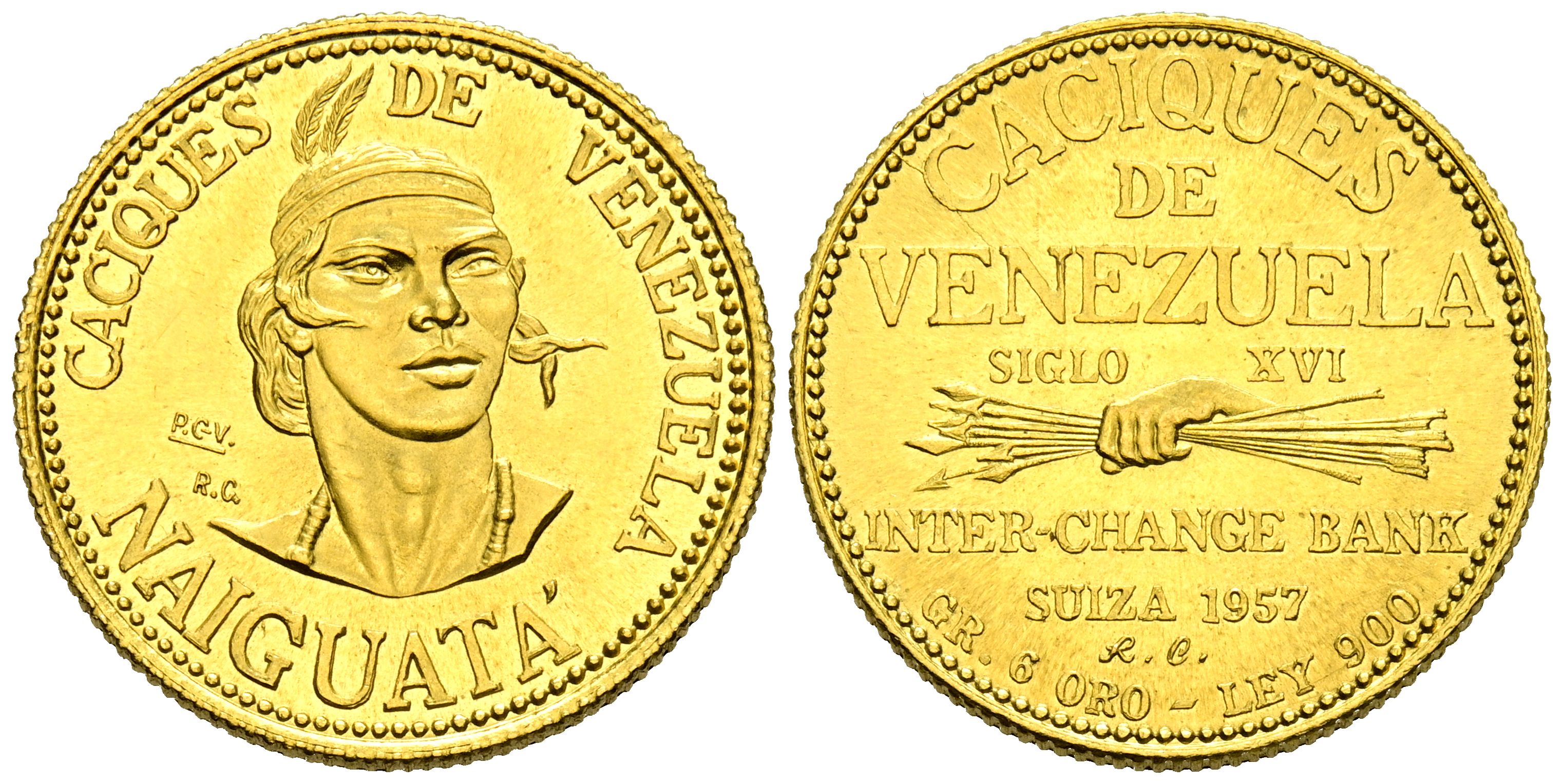 VENEZUELA. Medalla conmemorativa de los Caciques de Venezuela. (Au. 5,97g/21mm). 1957. Suiza. EBC.