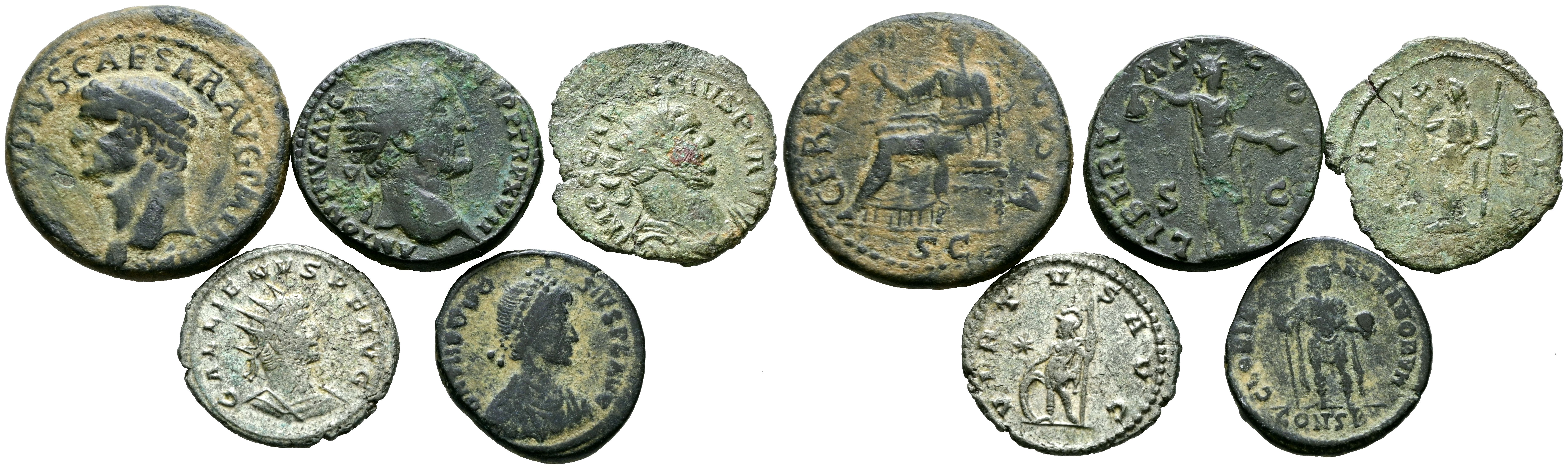 IMPERIO ROMANO. Conjunto de 5 monedas de bronce de los emperadores: Claudio I, Antonino Pío, Galieno, Carausio y Teodosio I. A EXAMINAR.