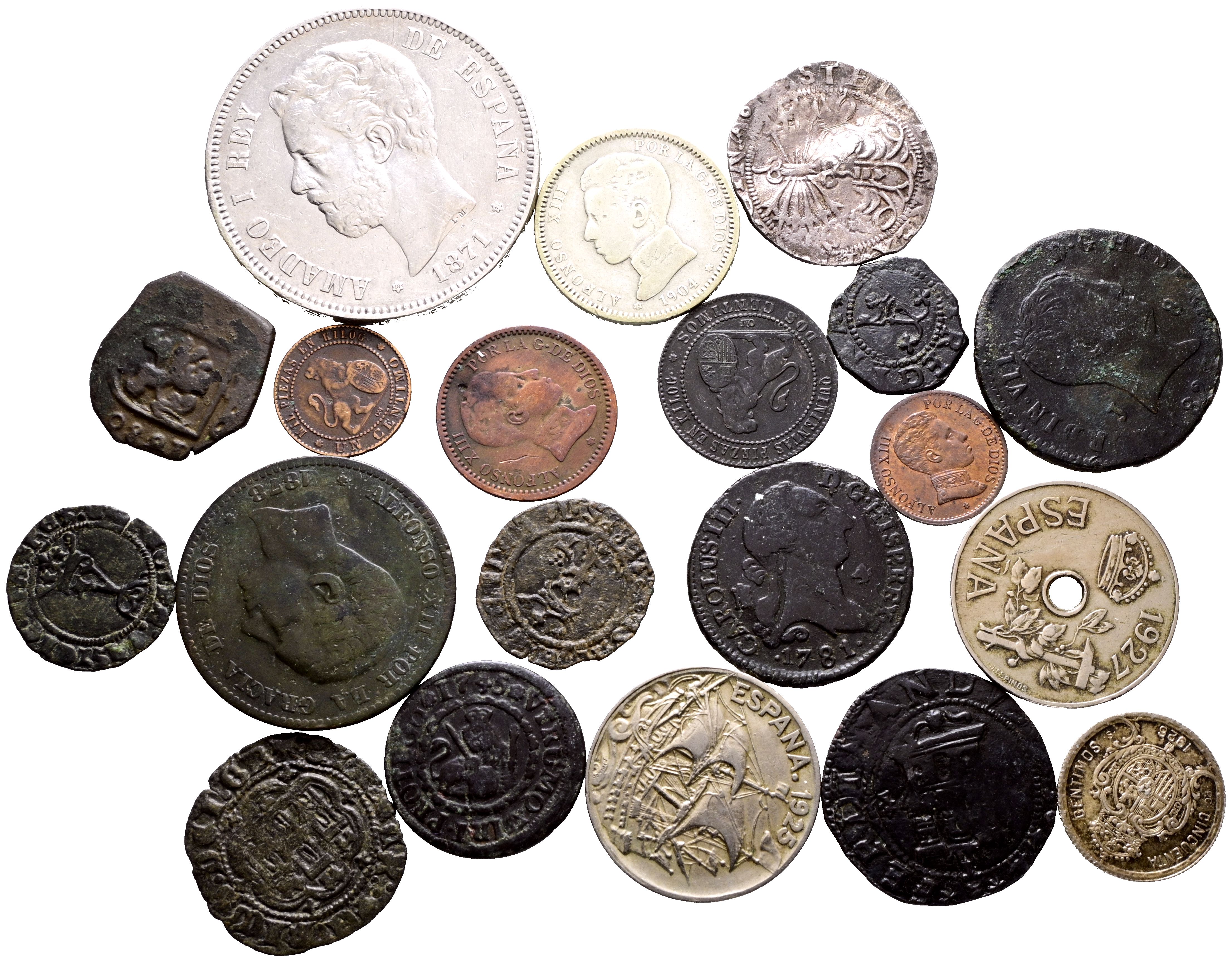 MONARQUÍA ESPAÑOLA Y CENTENARIO. Interesante conjunto formado por 20 piezas acuñadas entre el reinado de los RRCC y el de Alfonso XIII. Diferentes módulos, materiales, incluyendo la plata, así como estados de conservación. A EXAMINAR.