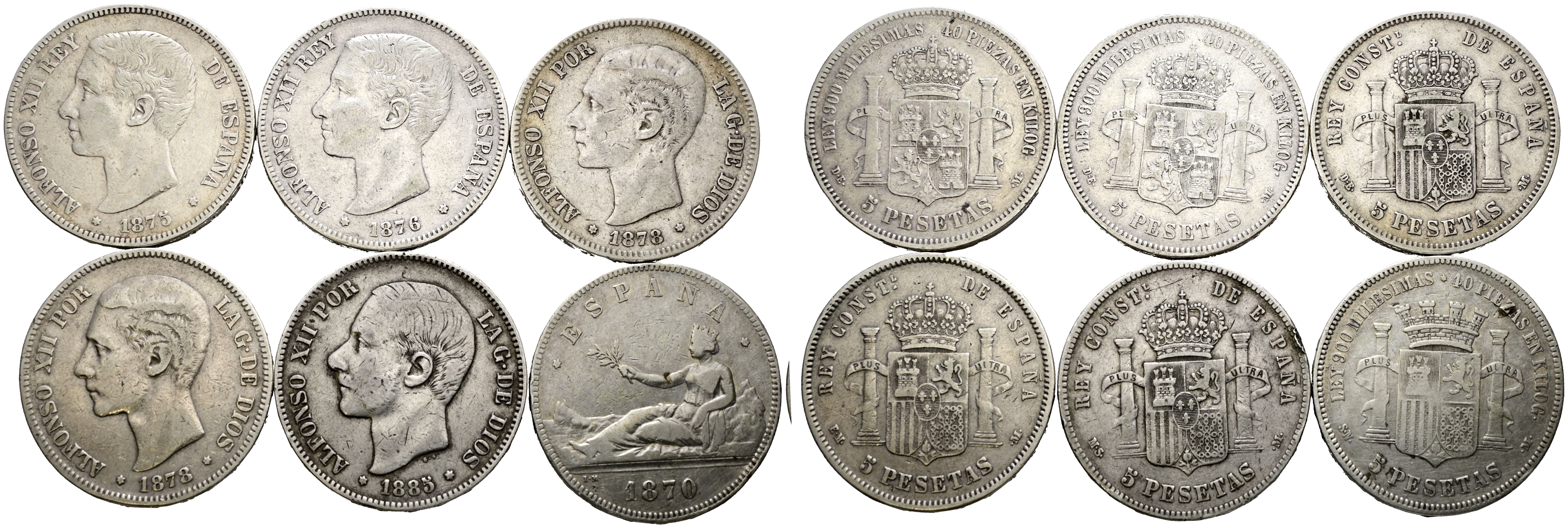 CENTENARIO DE LA PESETA. Conjunto de 6 monedas de 5 Pesetas todas diferentes acuñadas durante el periodo de Alfonso XII y el Gobierno Provisional. Diferentes estados de conservación. A EXAMINAR.