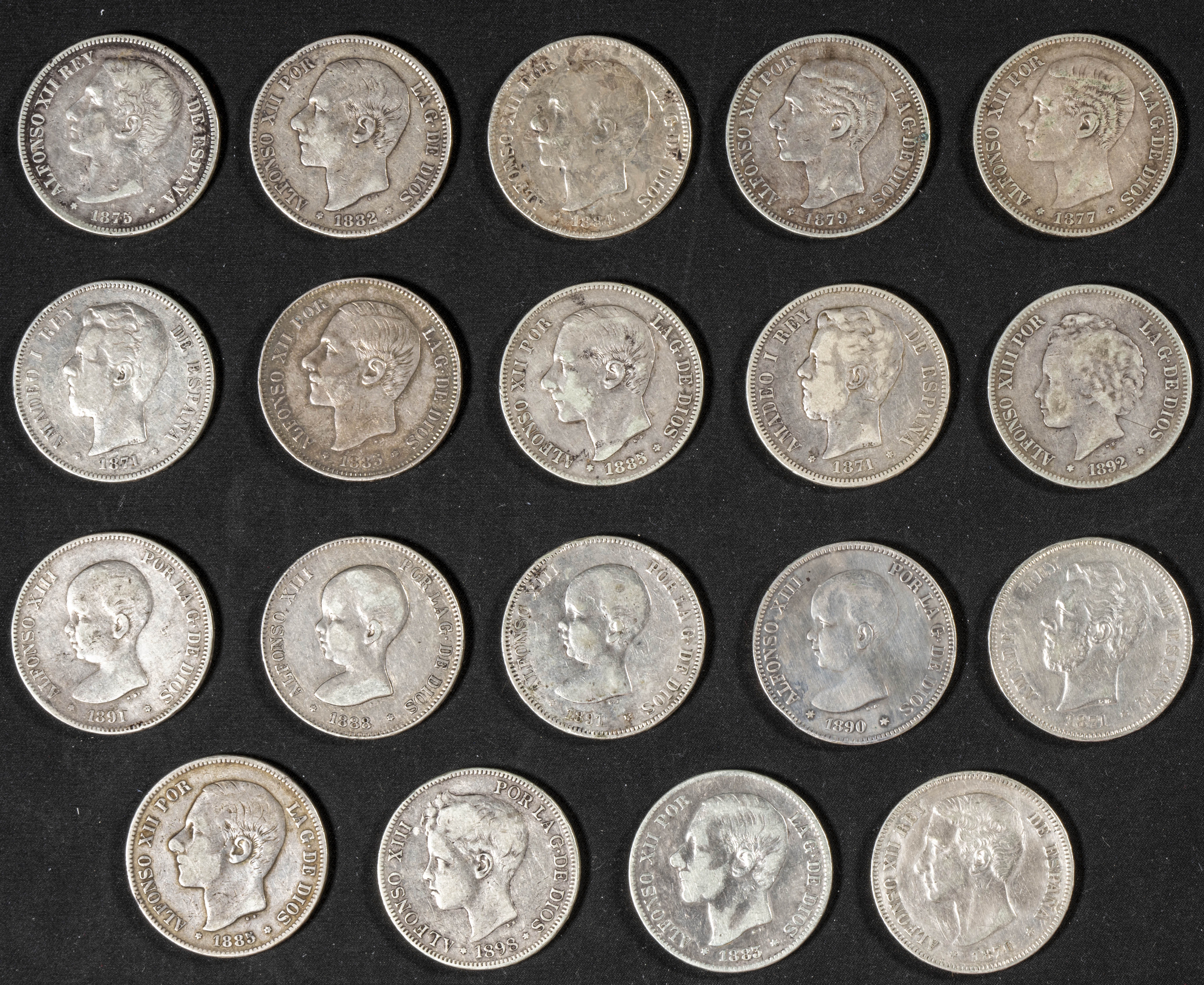 CENTENARIO DE LA PESETA. Conjunto de 19 monedas de 5 Pesetas de diferentes fechas, reyes así como estados de conservación. A EXAMINAR.