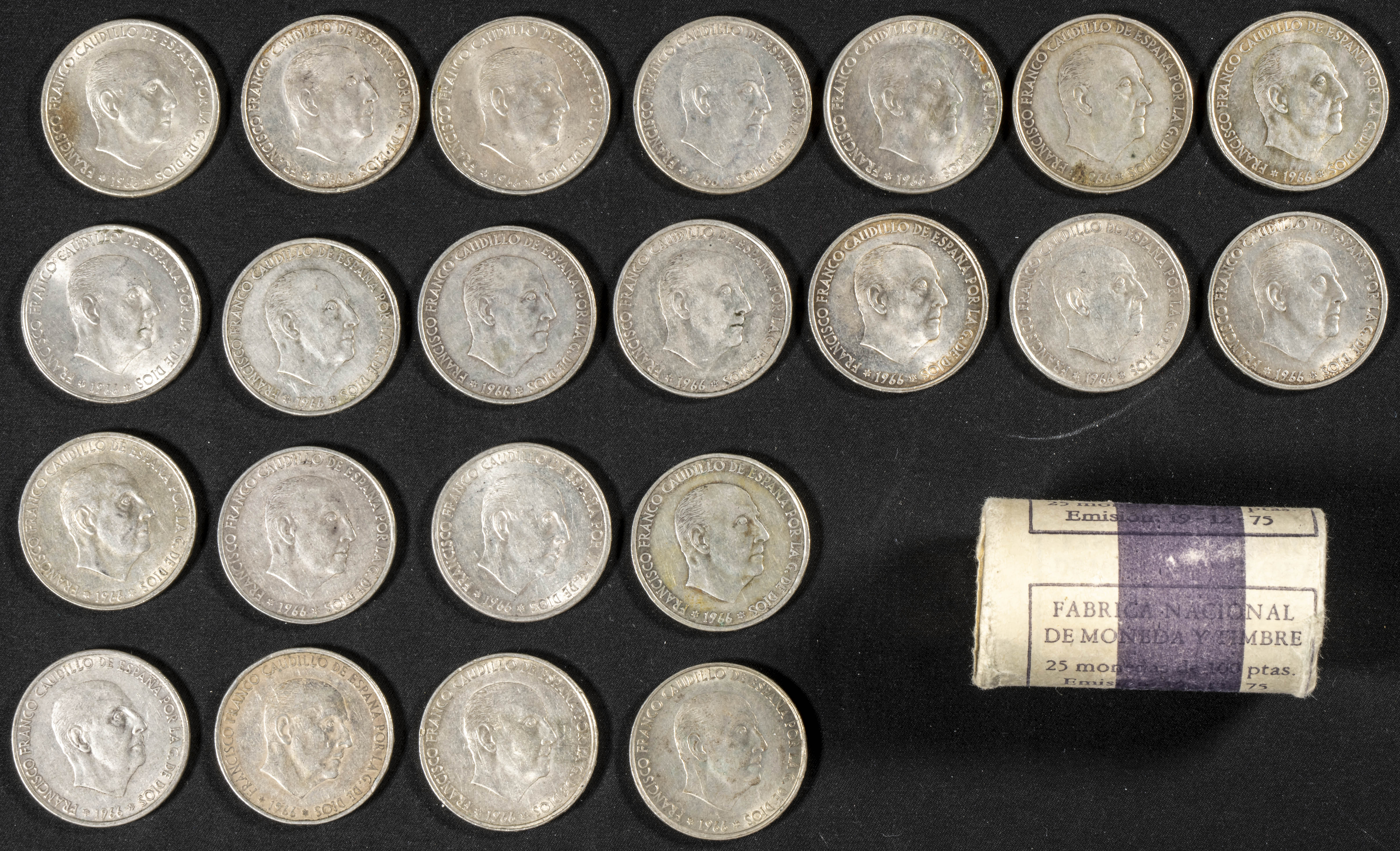 ESTADO ESPAÑOL Y JUAN CARLOS I. Conjunto formado por 22 monedas de 100 Pesetas en plata de 1966 (*66, 67 y 68) y un cartucho sin abrir de 100 Pesetas de 1980 *80. Diferentes estados de conservación. A EXAMINAR.