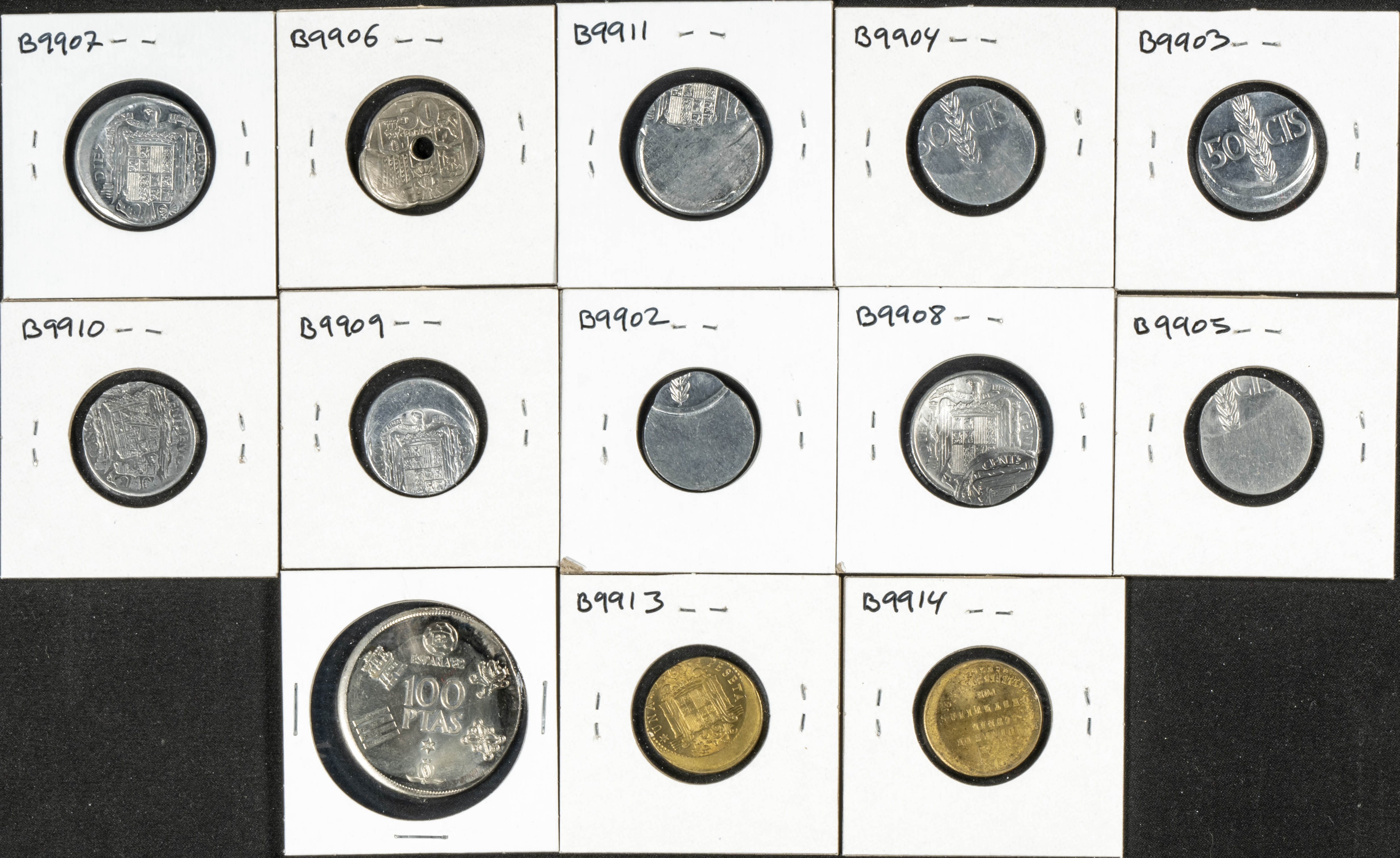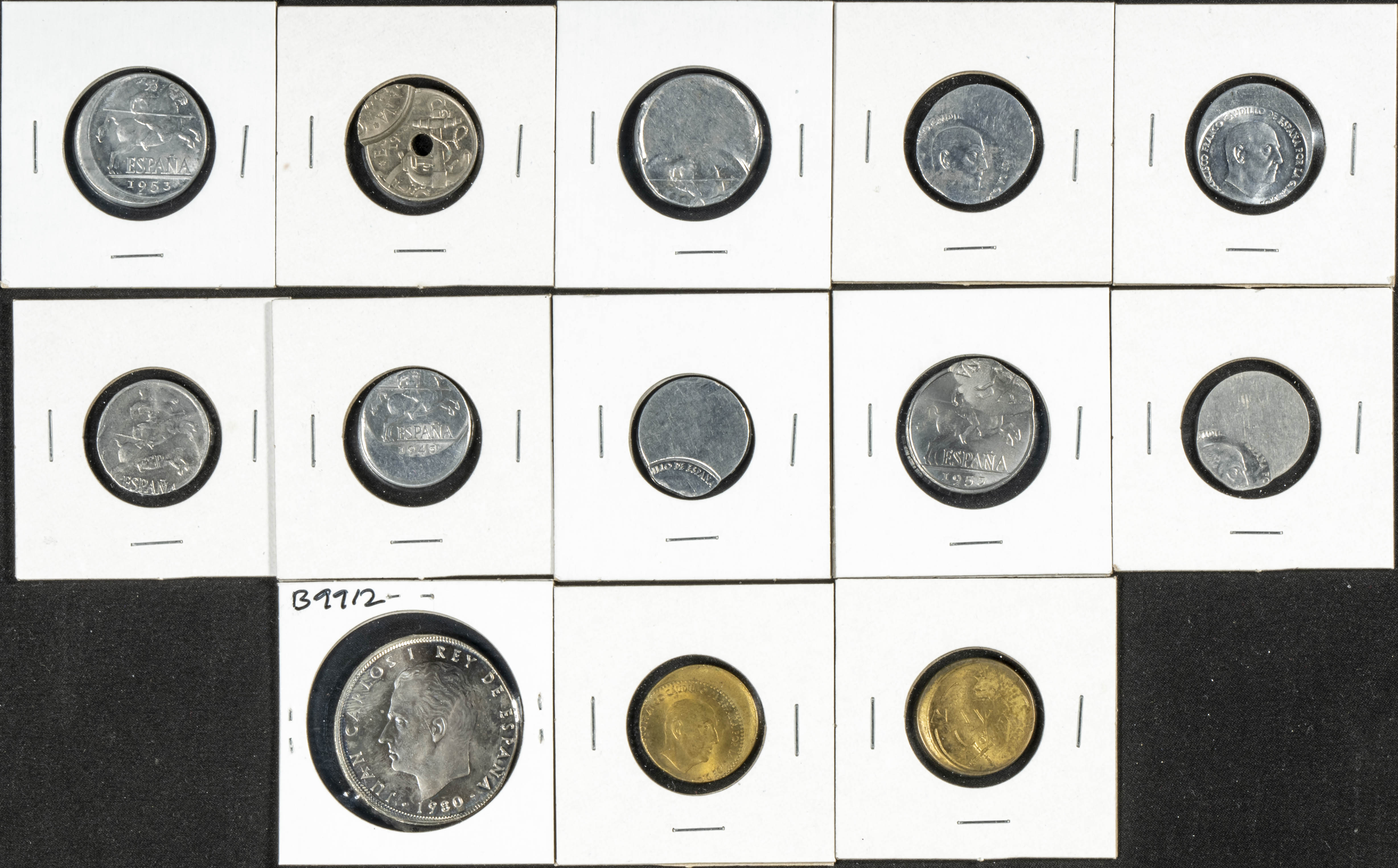 ERRORES Y VARIANTES. Interesante conjunto de 13 monedas acuñadas entre el Estado Español y el reinado de Juan Carlos I con distintos errores de acuñación.