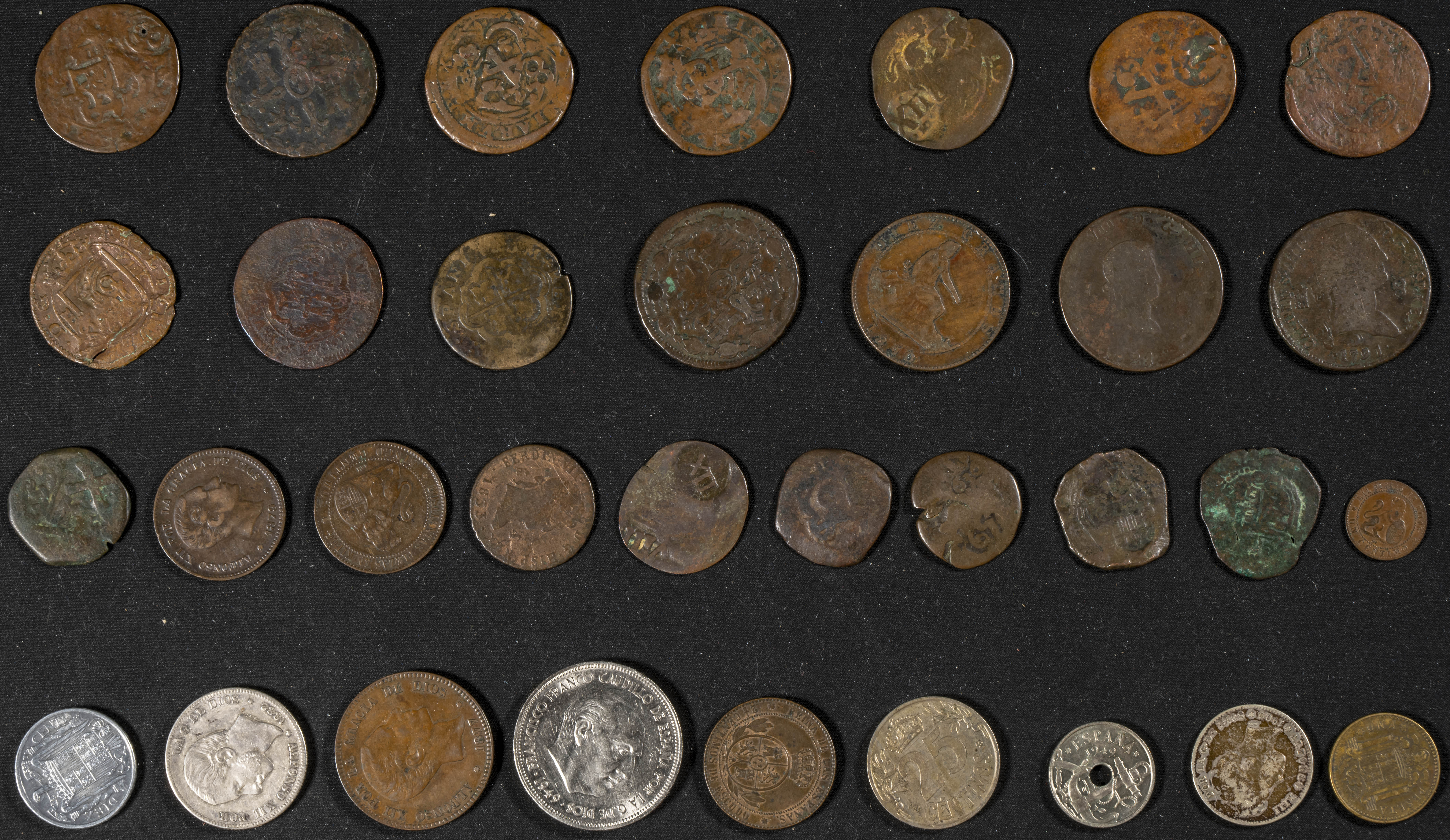 ESPAÑA. Interesante y variado conjunto formado por 33 piezas acuñadas entre los periodos de la Monarquía Española y el Estado Español. Destactan un buen número de cobres con resellos. Diferentes estados de conservación. A EXAMINAR.