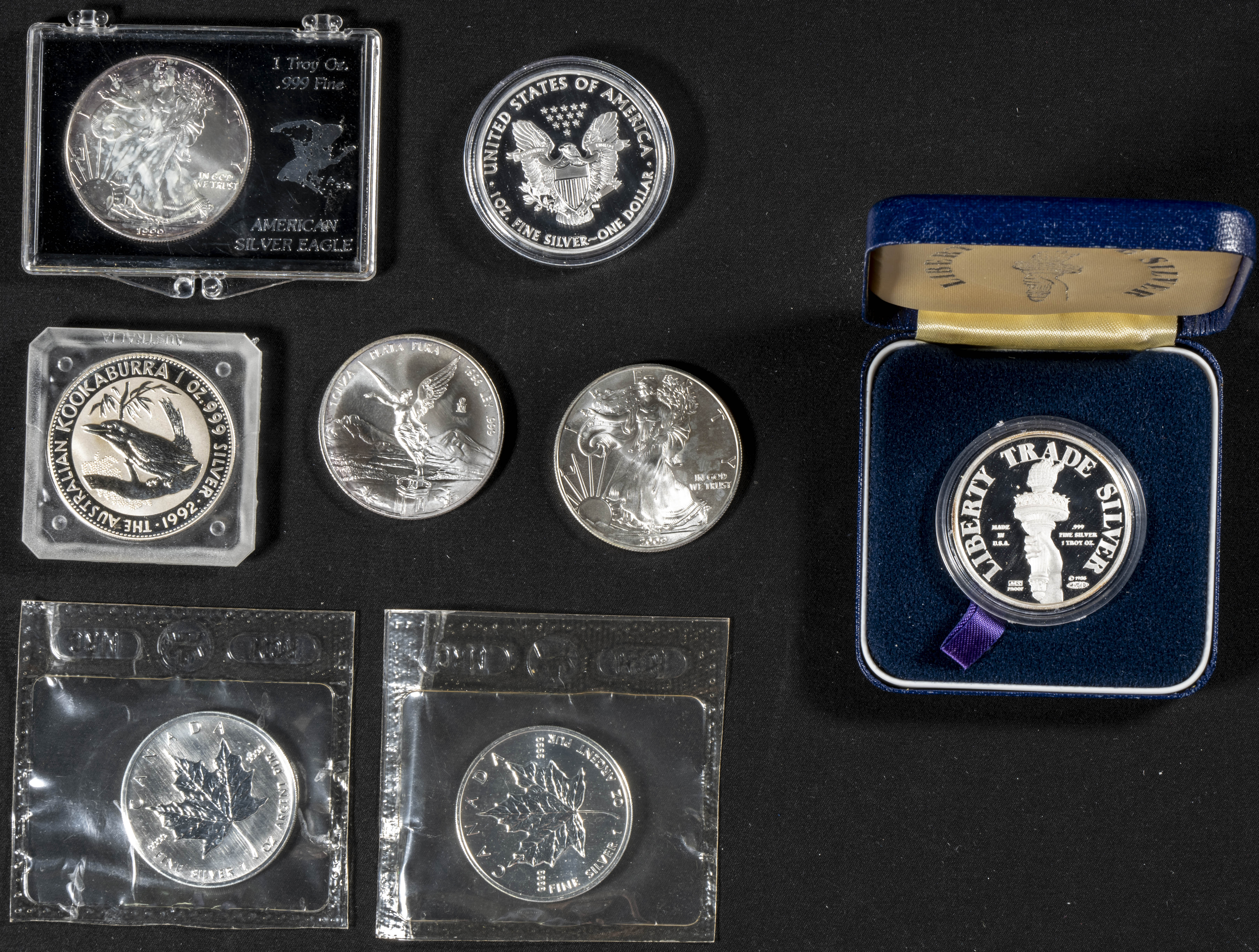 MONEDAS EXTRANJERAS. Magnífico conjunto de 8 piezas en plata tipo onza de diferentes países. Incluye varias piezas en blister sin abrir y algunos estuches. Conservaciones SC. A EXAMINAR.
