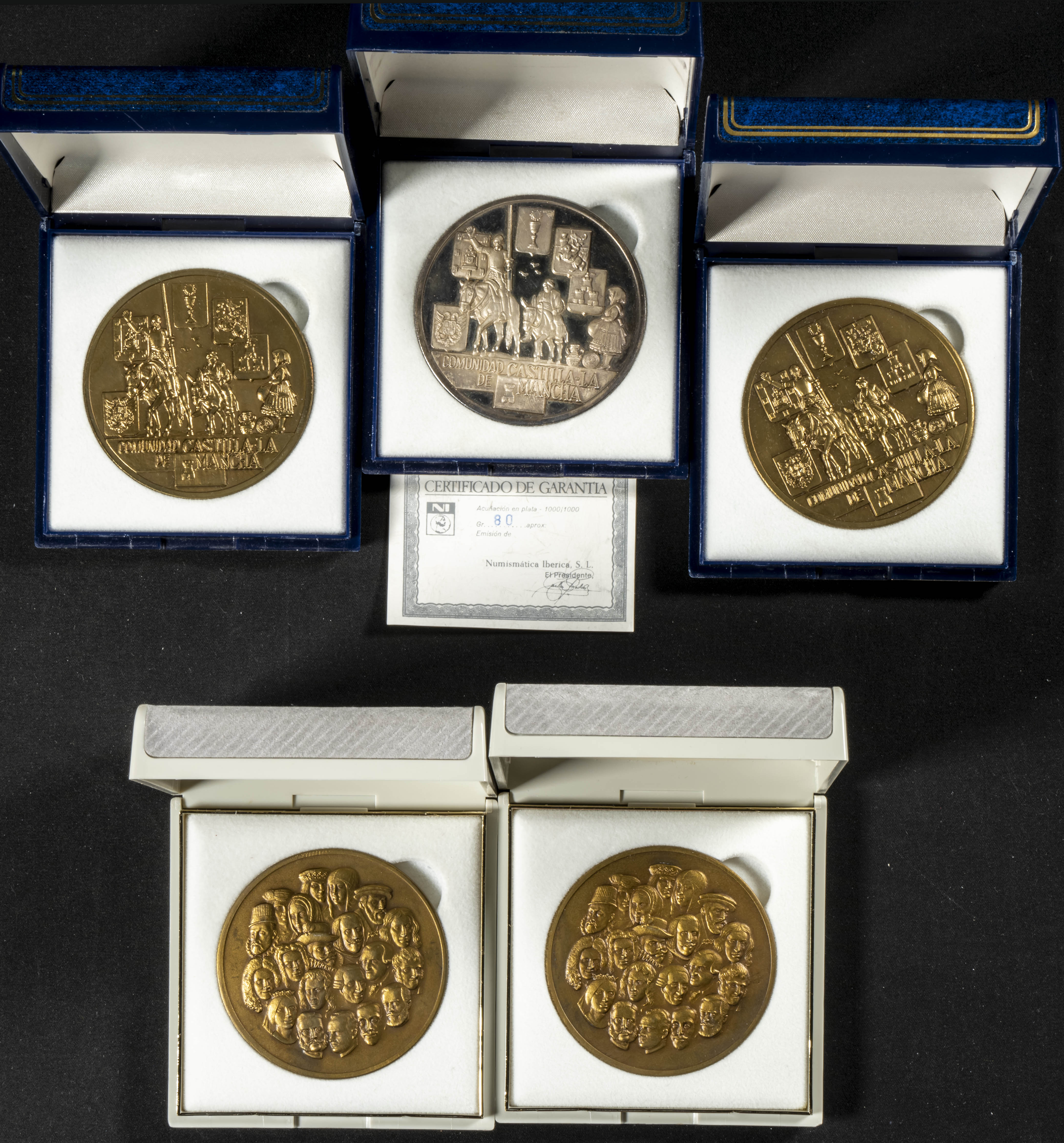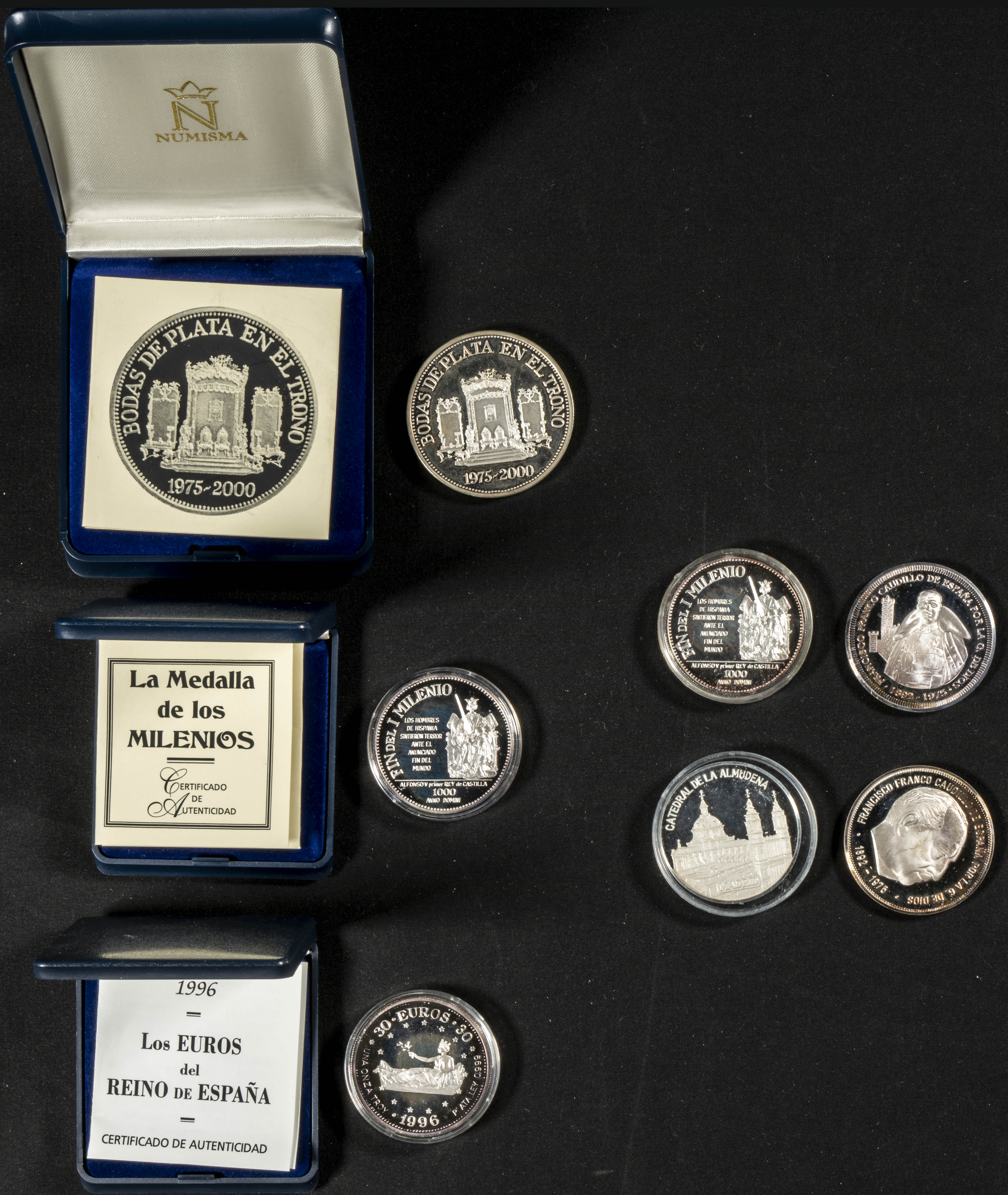MEDALLAS. Bonito conjunto de 12 medallas españolas de plata pura y bronce con diferente temática: Comunidad de Castilla la Mancha, Euros de España, Fin del Milenio, Catedral de la Almudena y Onzas de Francisco Franco. Peso total del conjunto, sólo en plata, aproximado: 325 g. PROOF. Incluye 6 estuches.