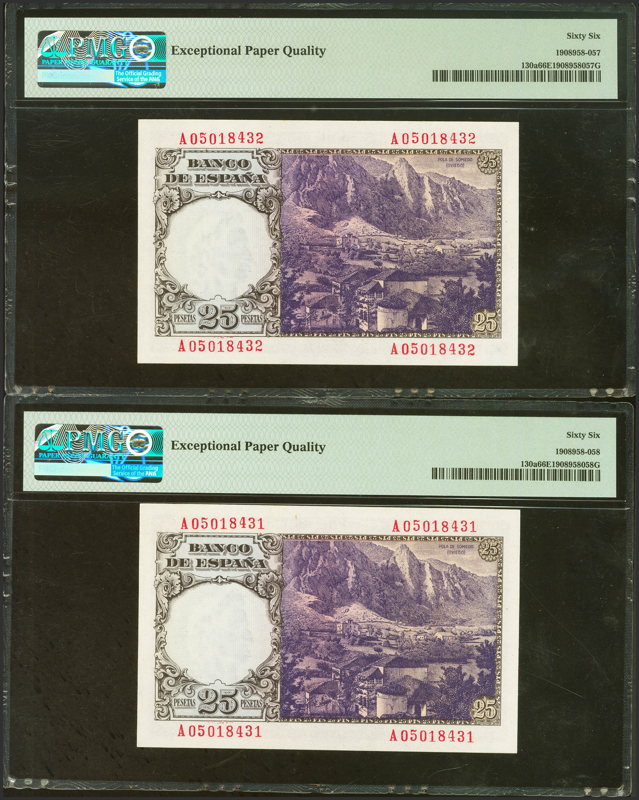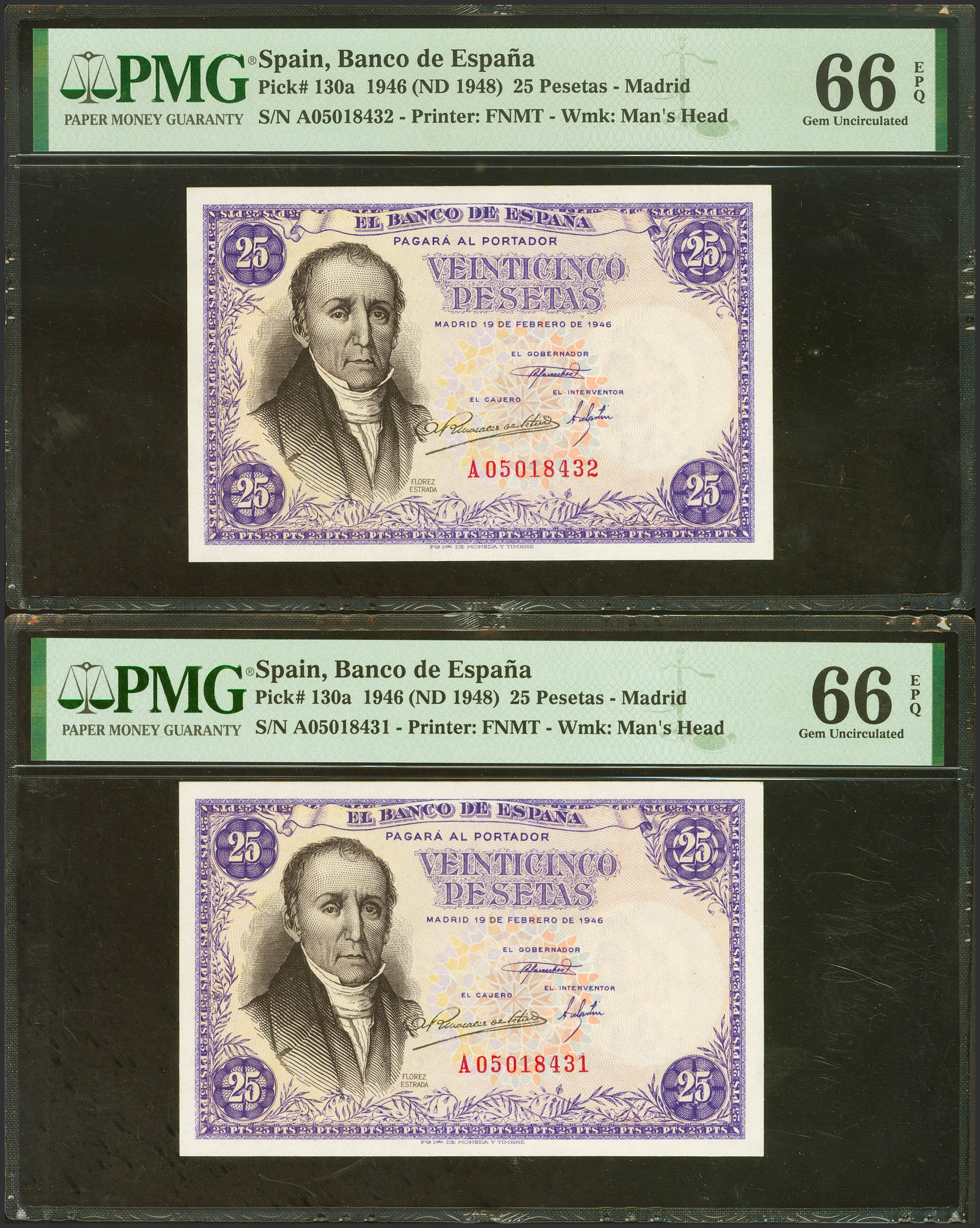 25 Pesetas. 20 de Febrero de 1946. Pareja correlativa. Serie A. (Edifil 2023: 450a, Pick: 130a). Rara en esta excepcional calidad, apresto original. SC. Encapsulados PMG66EPQ, ambos.