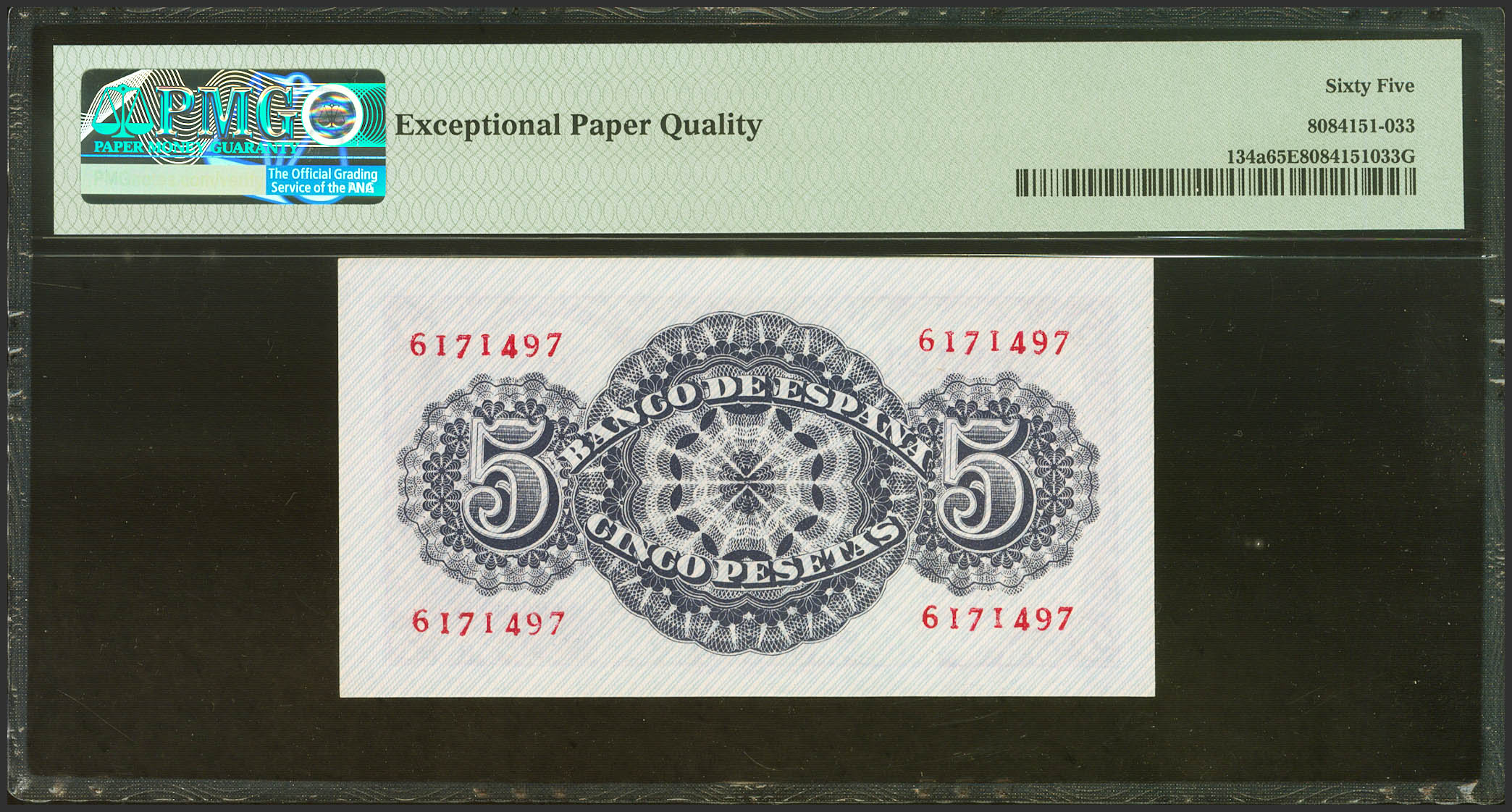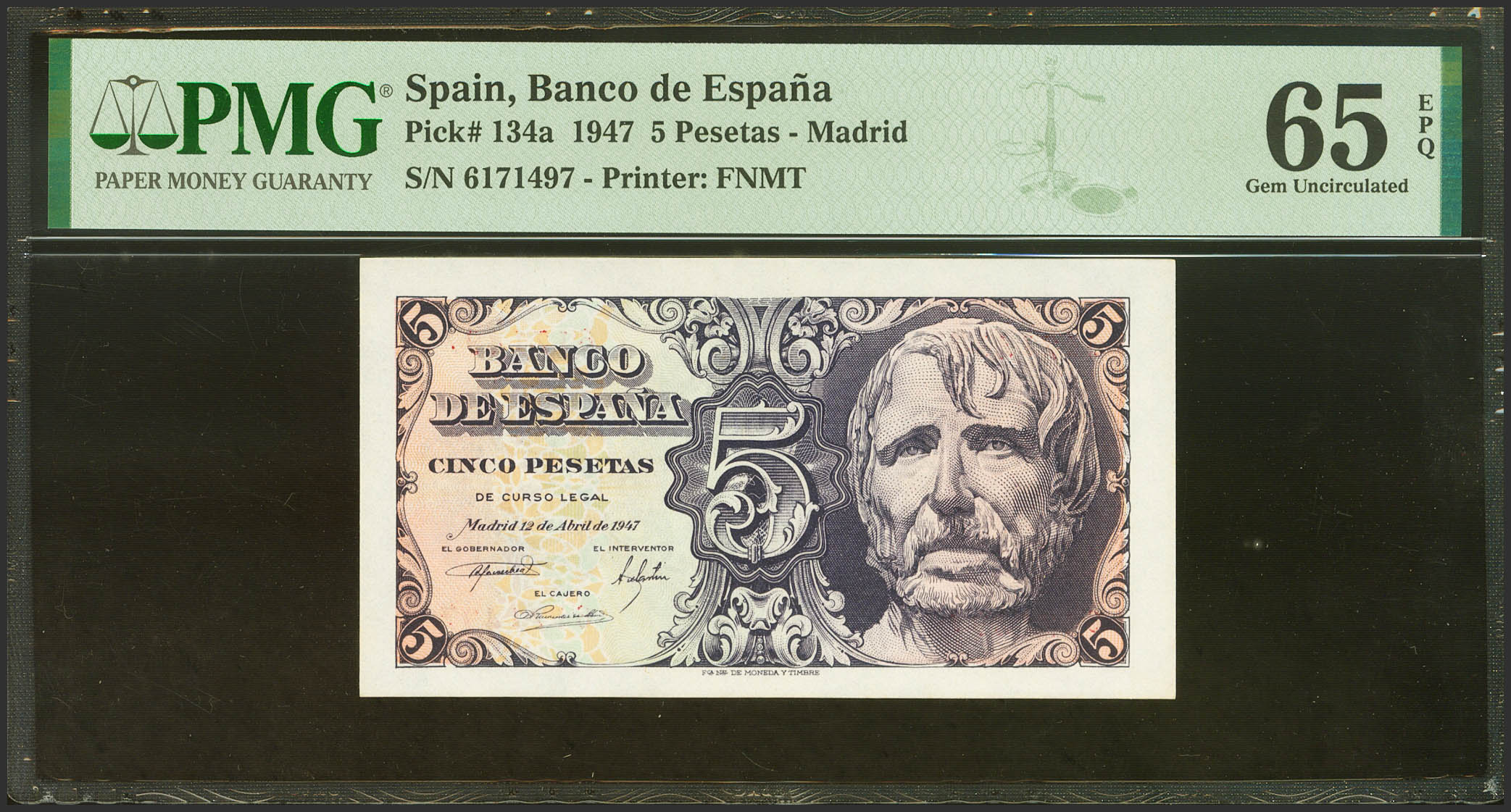 5 Pesetas. 12 de Abril de 1947. Sin serie. (Edifil 2023: 454, Pick: 134a). Raro en esta calidad, apresto original. SC. Encapsulado PMG65EPQ.