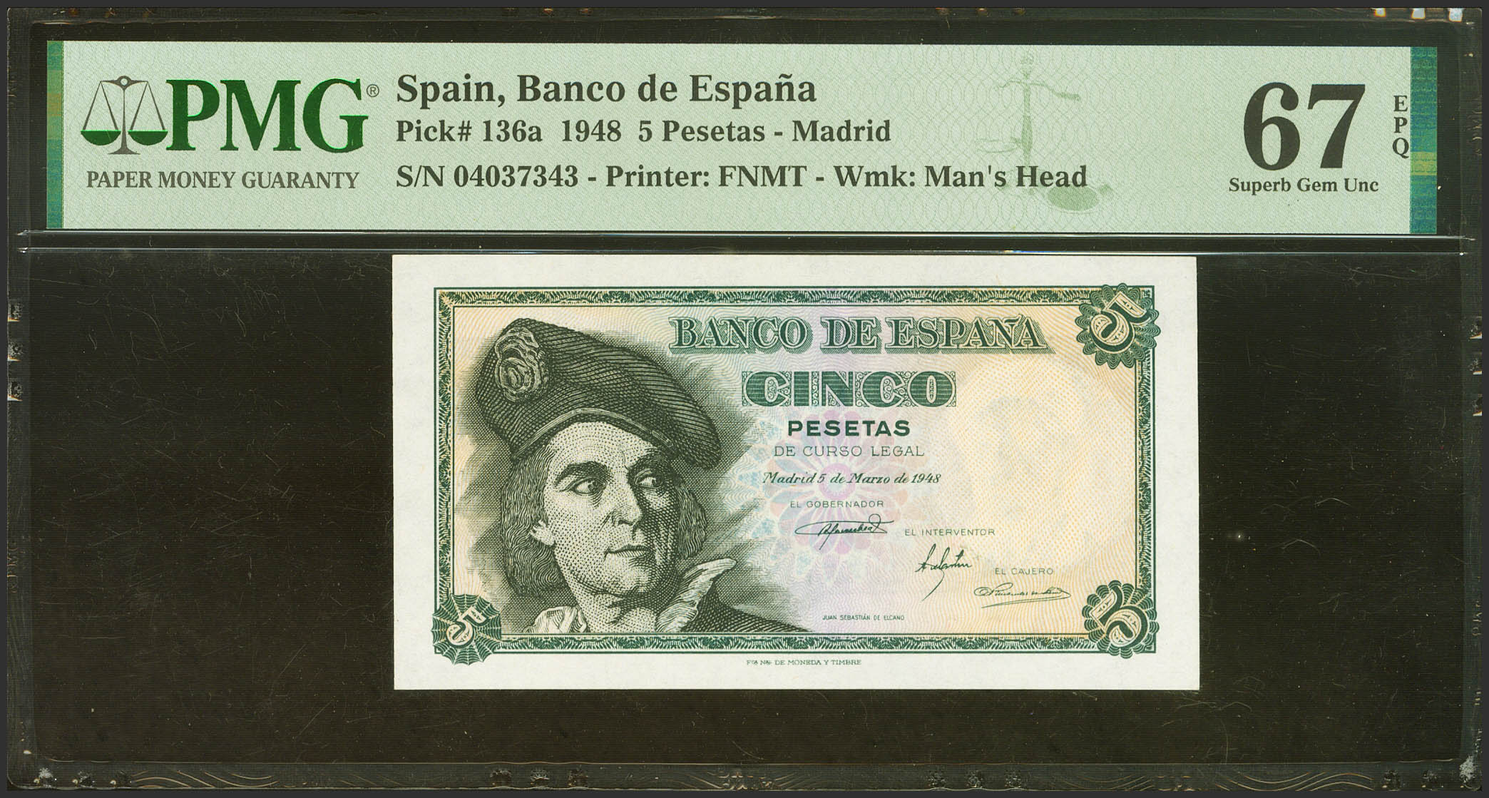 5 Pesetas. 5 de Marzo de 1948. Sin serie. (Edifil 2023: 455, Pick: 136a). Apresto original. SC. Encapsulado PMG67EPQ.