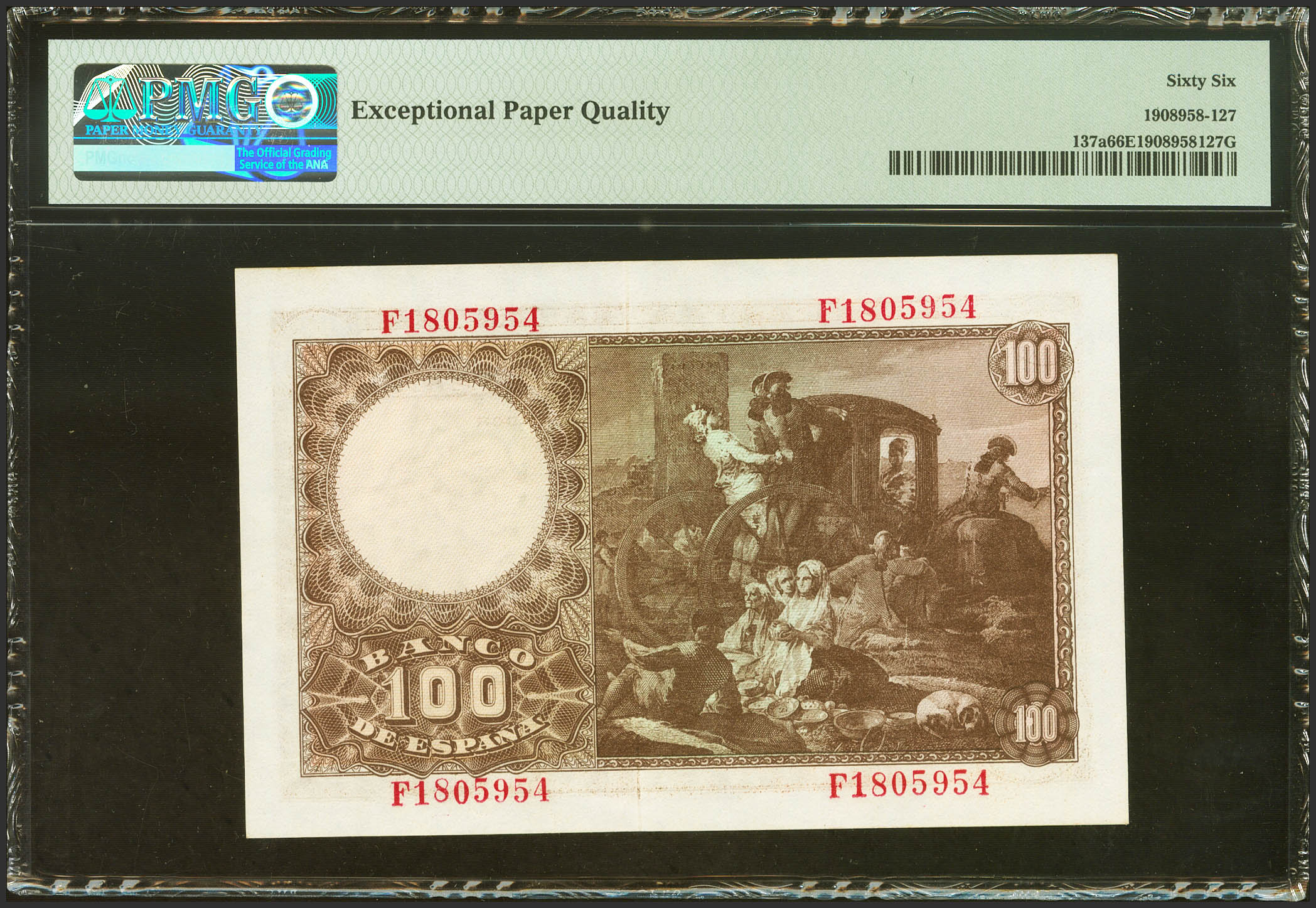100 Pesetas. 2 de Mayo de 1948. Serie F. (Edifil 2023: 456a, Pick: 137a). Inusual en esta excepcional calidad, apresto original. SC. Encapsulado PMG66EPQ.