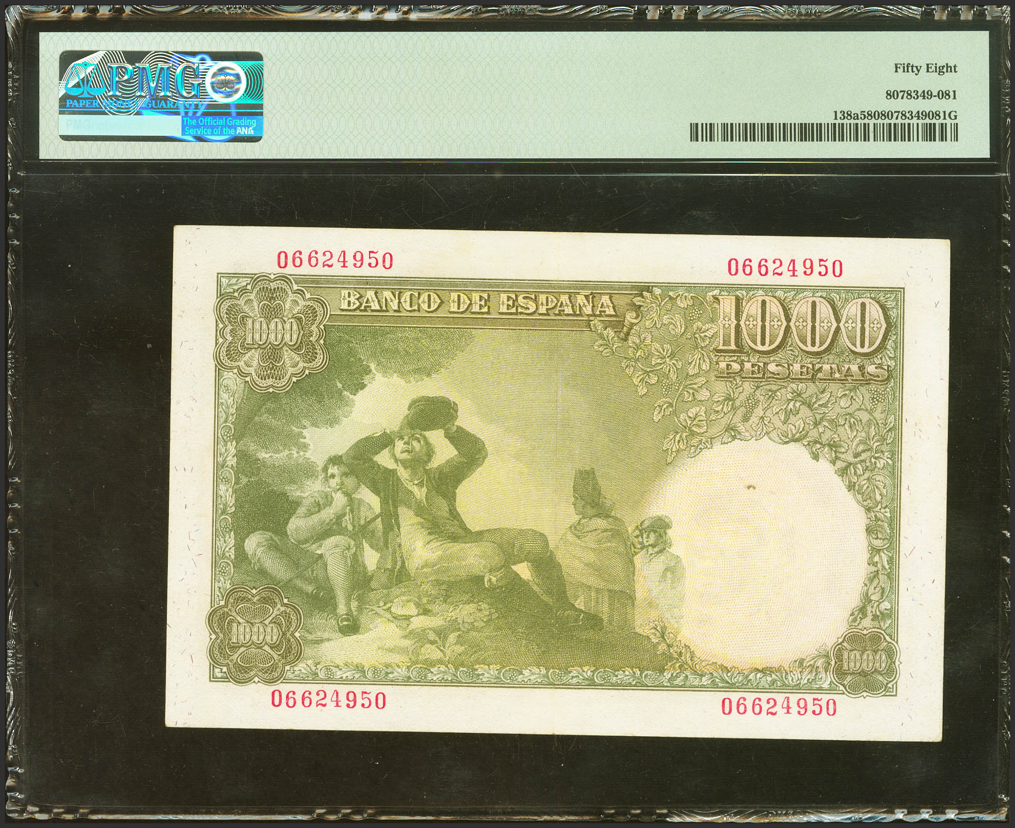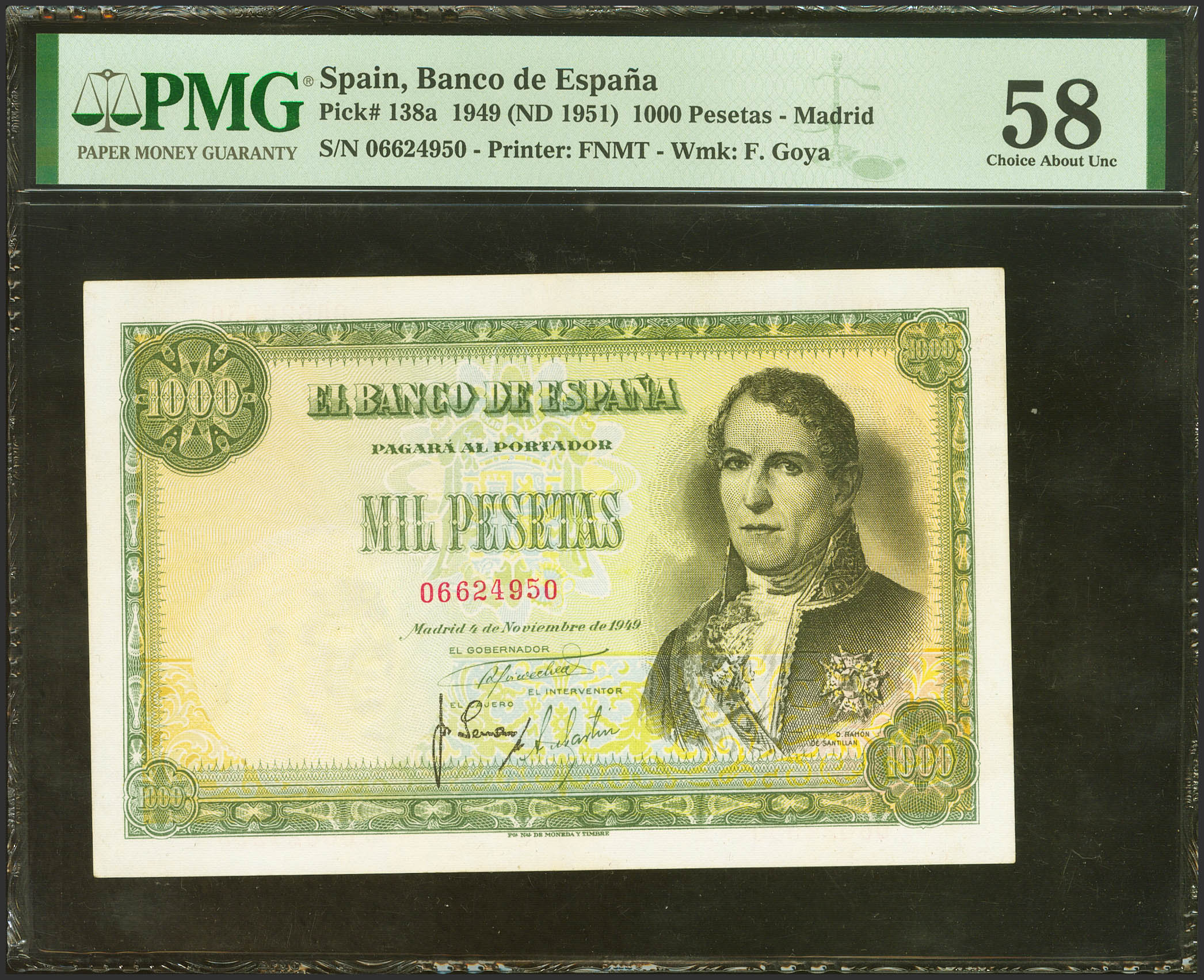 1000 Pesetas. 4 de Noviembre de 1949. Sin serie. (Edifil 2023: 458, Pick: 138a). Inusual. EBC++. Encapsulado PMG58.