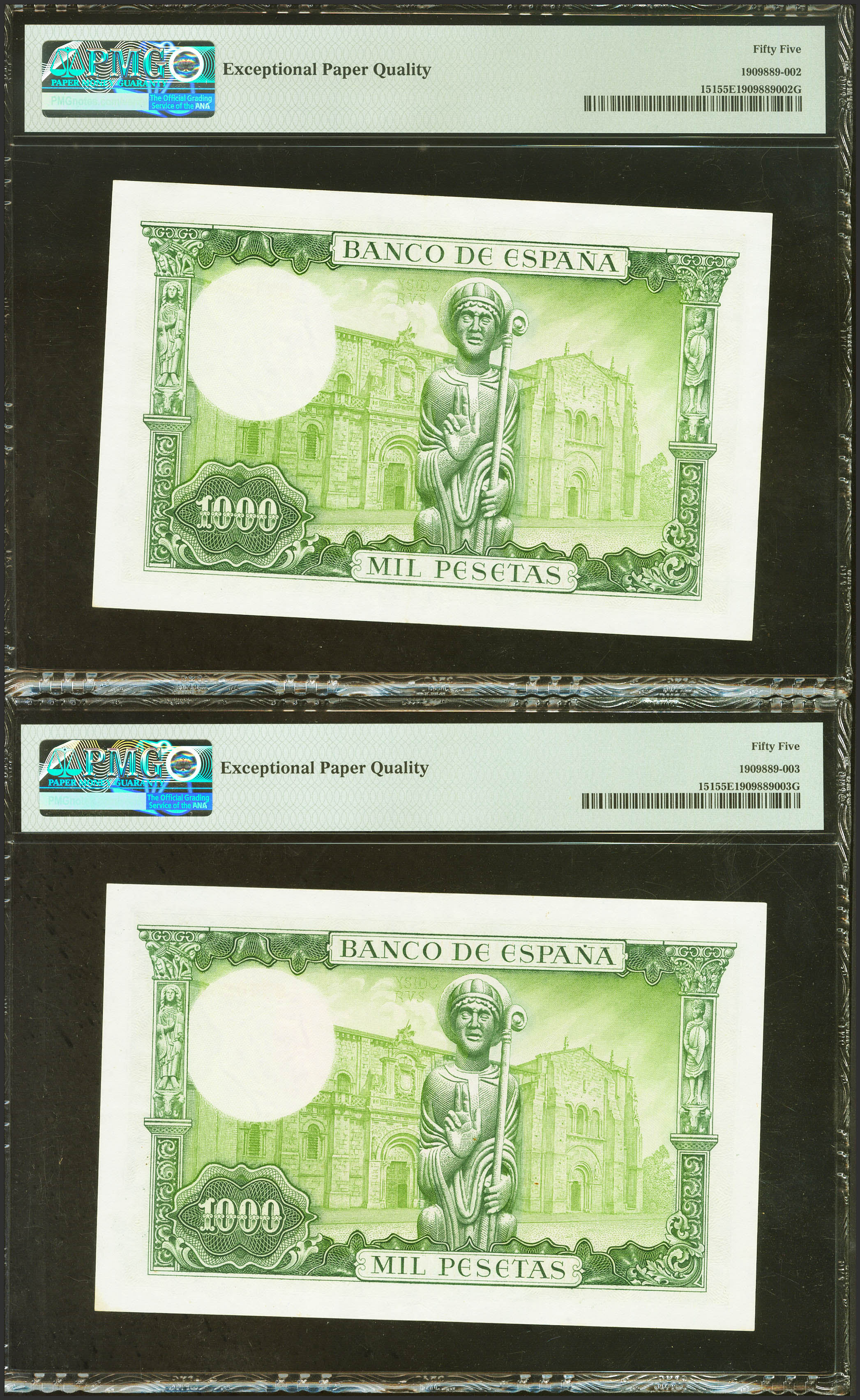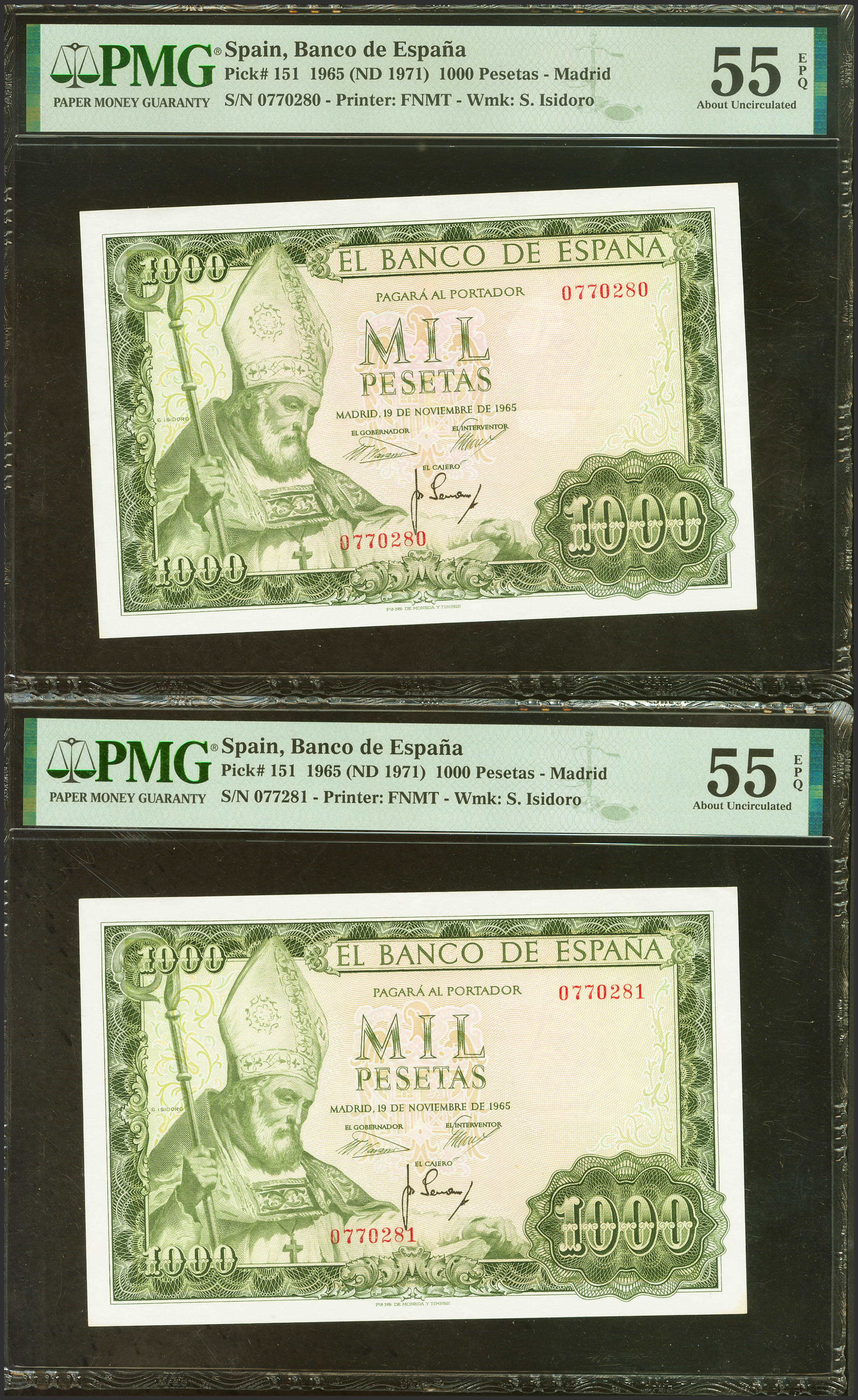 1000 Pesetas. 19 de Noviembre de 1965. Pareja correlativa. Sin serie. (Edifil 2023: 471, Pick: 151). EBC+. Encapsulados PMG55EPQ, ambos.