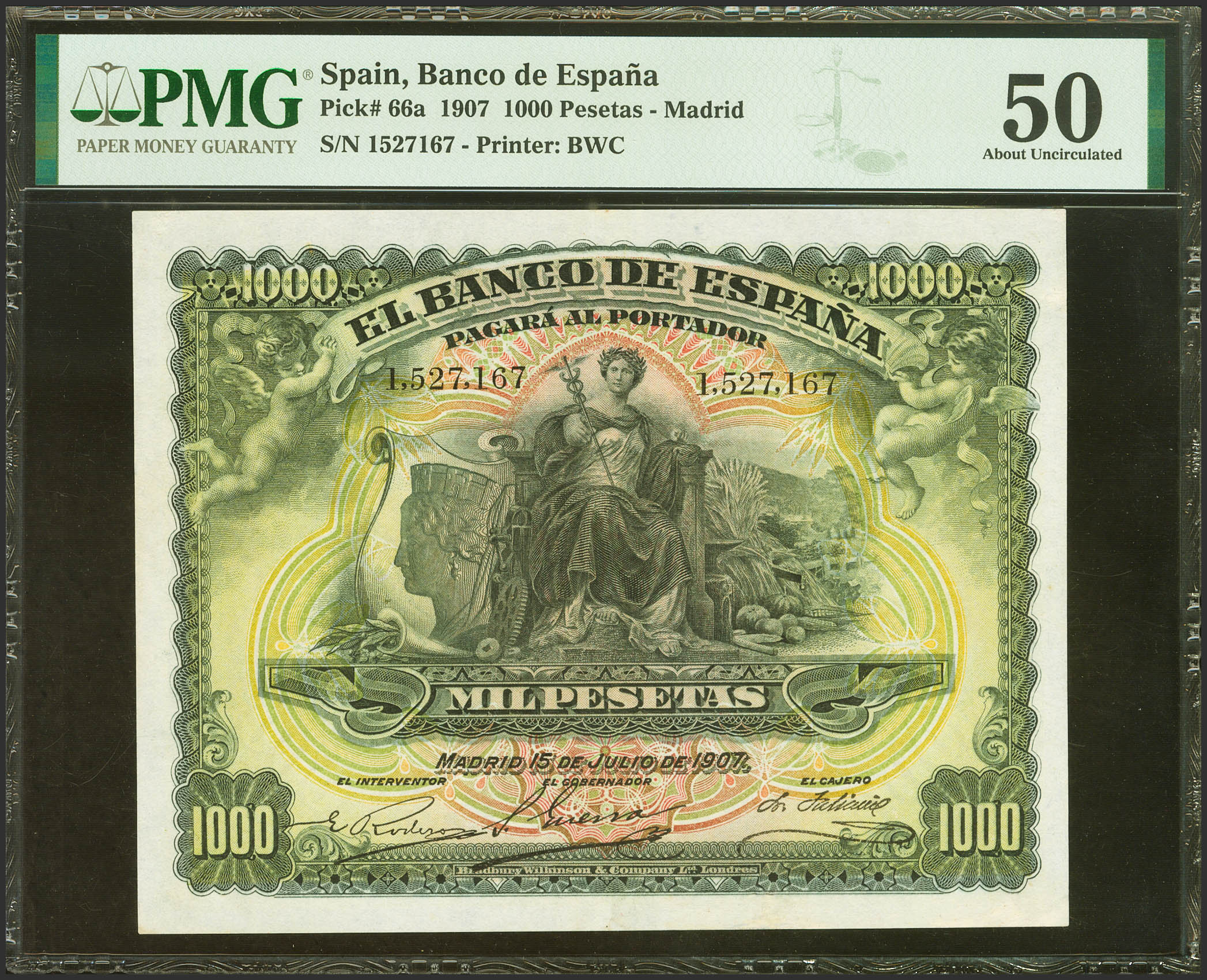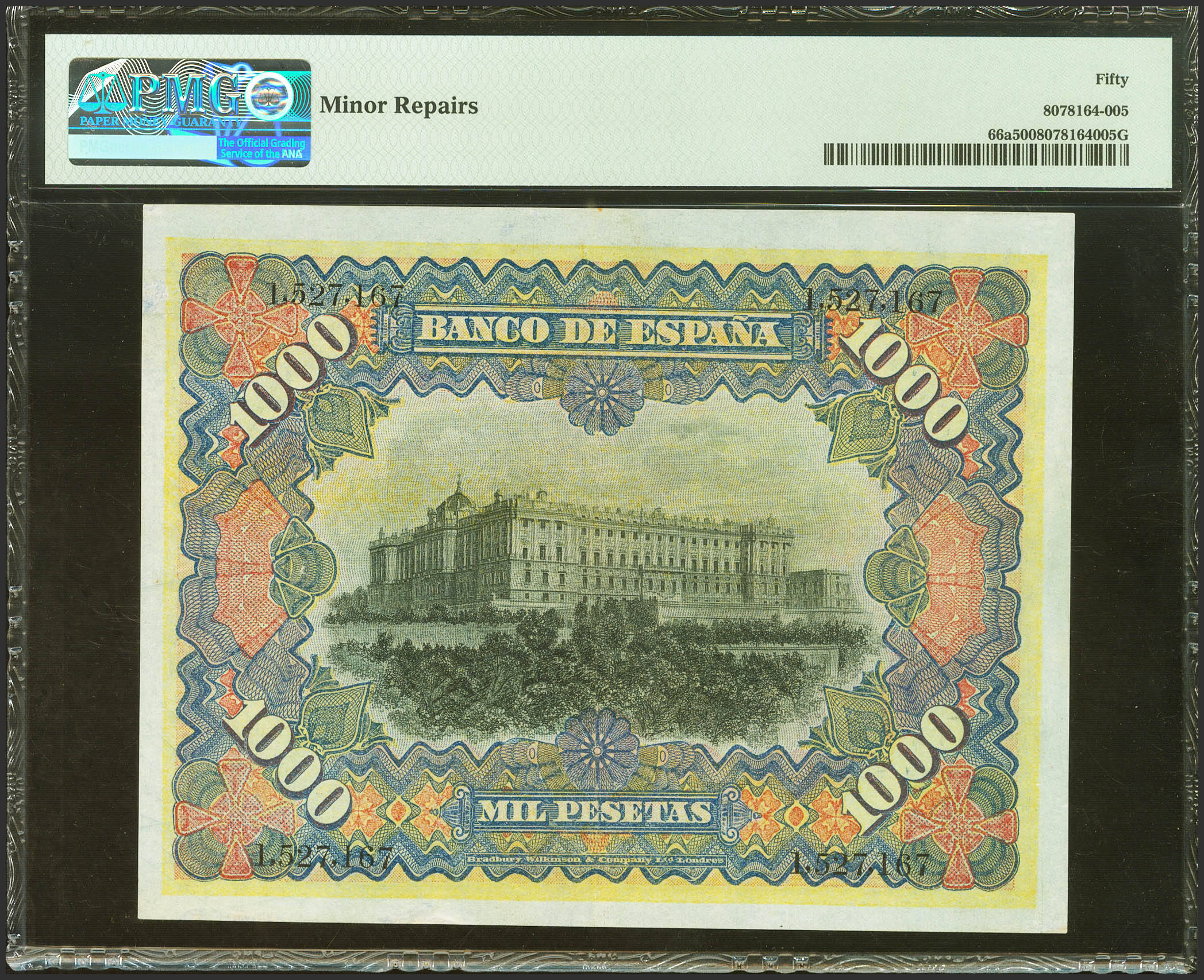 1000 Pesetas. 15 de Julio de 1907. Sin serie. (Edifil 2023: 322, Pick 66a). Rarísimo en esta conservación y minimante reparado. EBC. Encapsulado PMG50 (minor repairs).