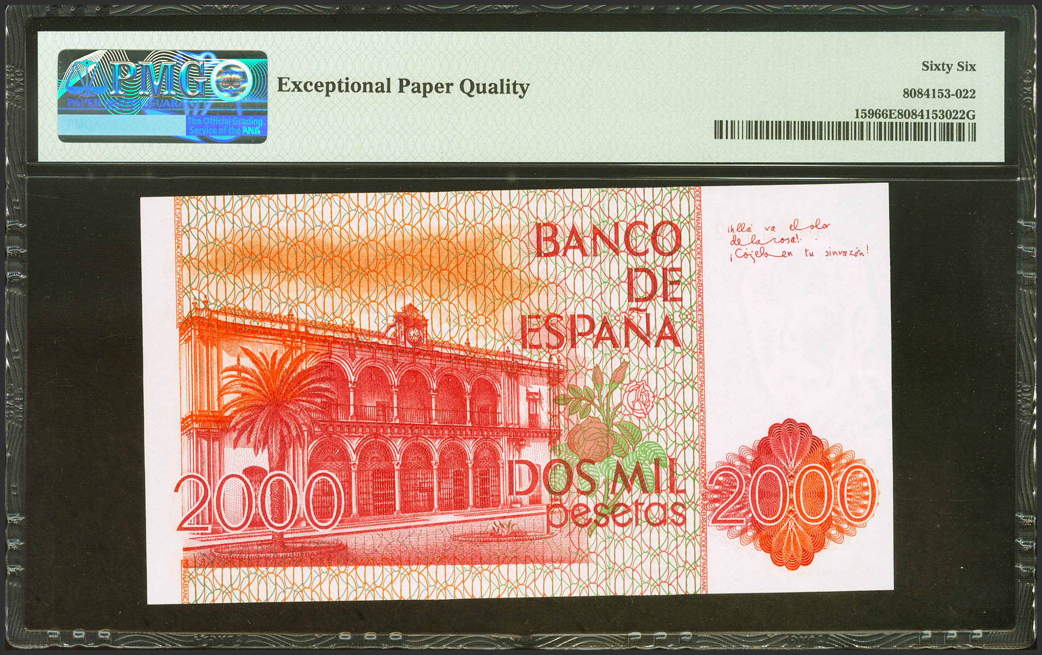 2000 Pesetas. 22 de Julio de 1980. Sin serie y numeración baja. (Edifil 2023: 479, Pick: 159). Inusual en esta excepcional calidad. SC. Encapsulado PMG66EPQ.