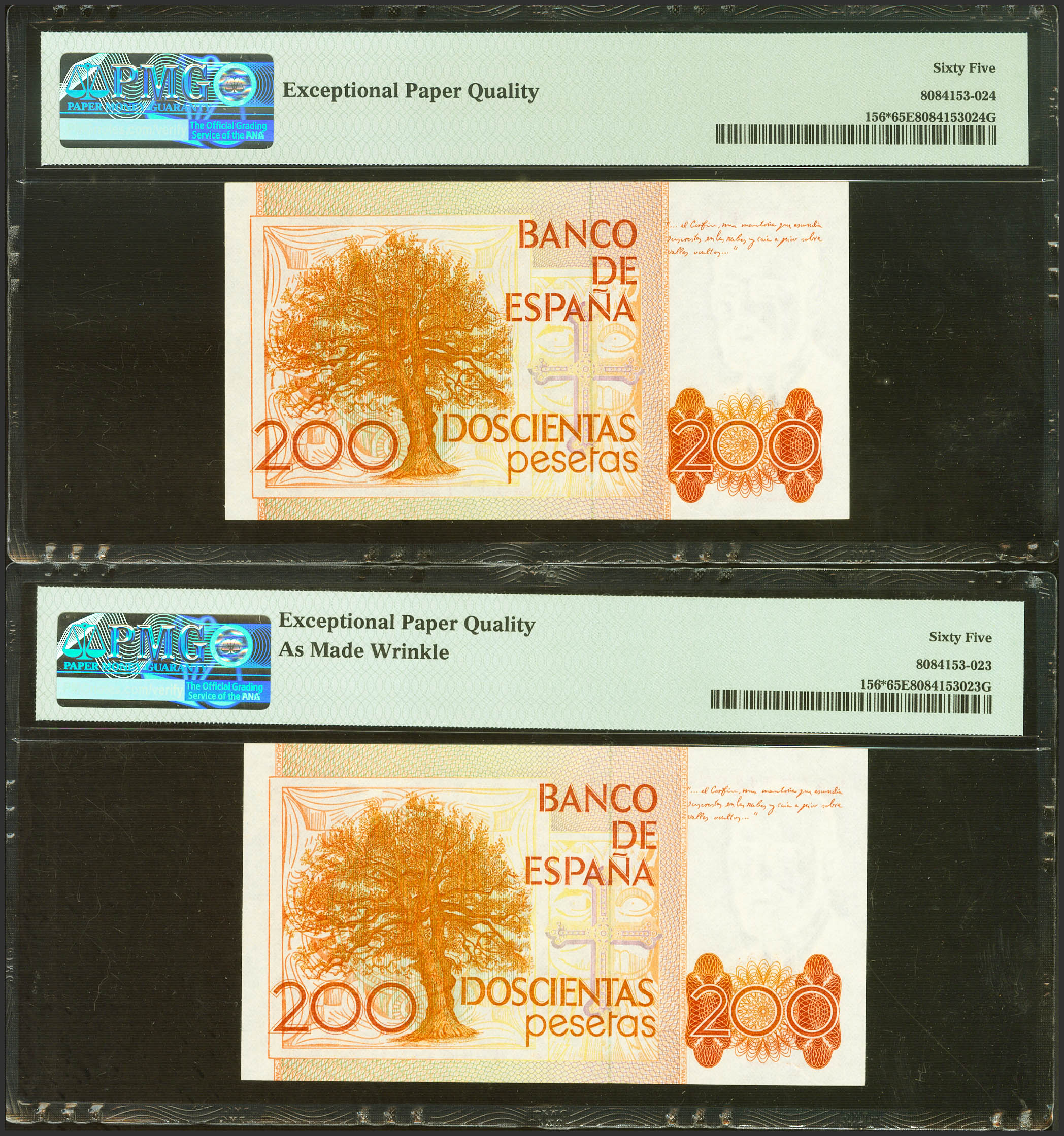 200 Pesetas. 16 de Septiembre de 1980. Pareja correlativa. Serie especial 9A. (Edifil 2023: 480b, Pick: 156*). SC. Encapsulados PMG65EPQ, ambos (uno de ellos "as made wrinkle").