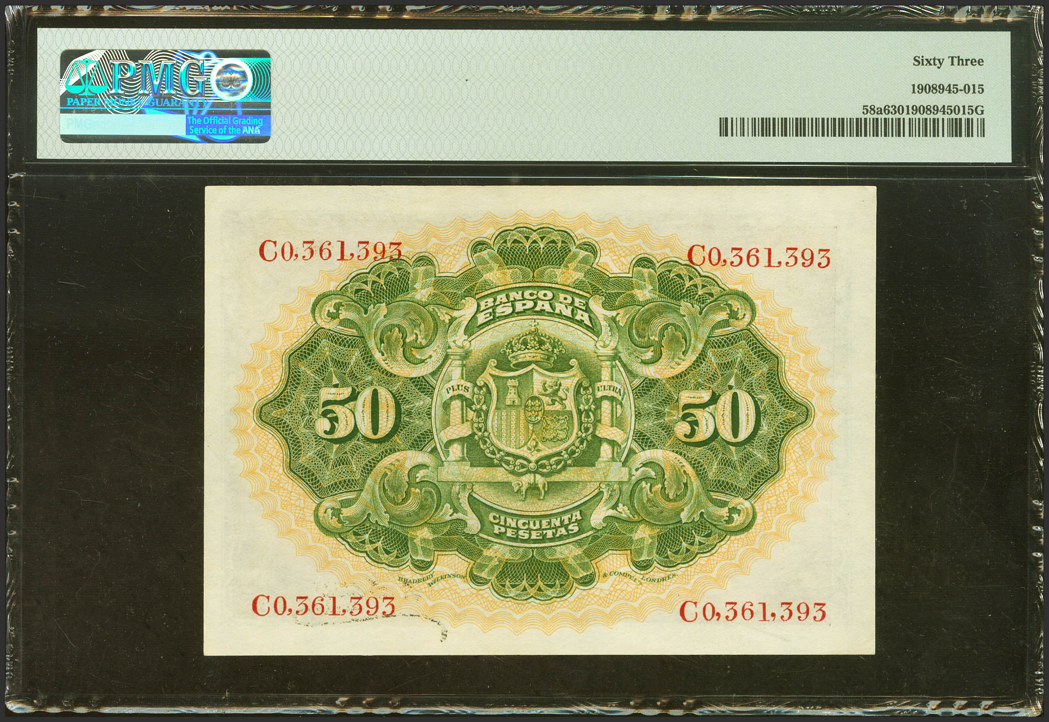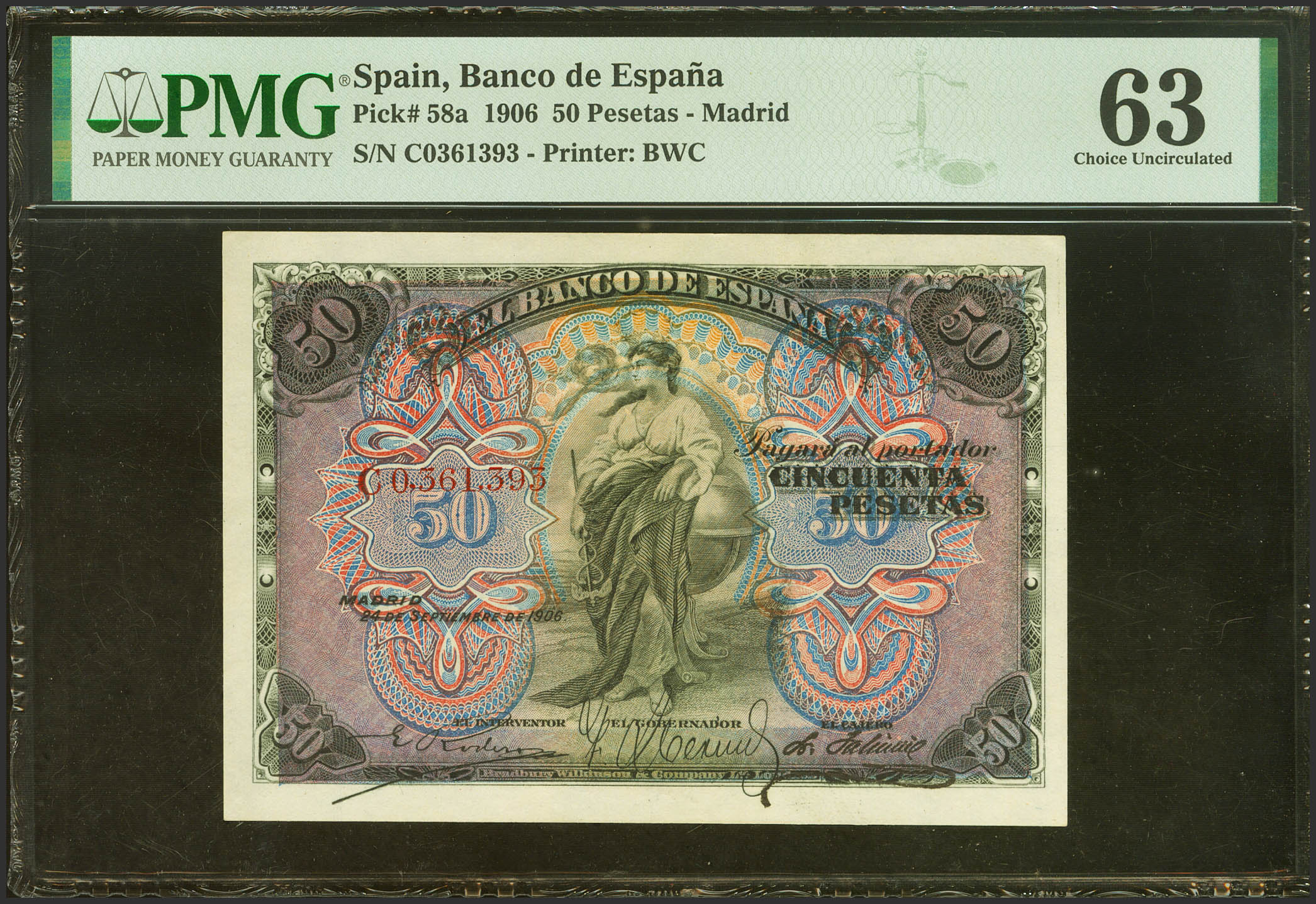 50 Pesetas. 24 de Septiembre de 1906. Serie C, última serie emitida. (Edifil 2023: 315a, Pick: 58a). SC. Encapsulado PMG63. (para hacernos idea de la rareza, a fecha 1 de Marzo de 2024, este billete es el quinto mejor calificado junto a otro billete en PMG)