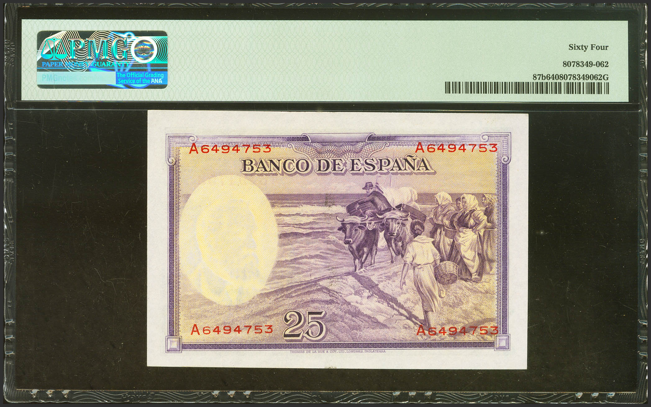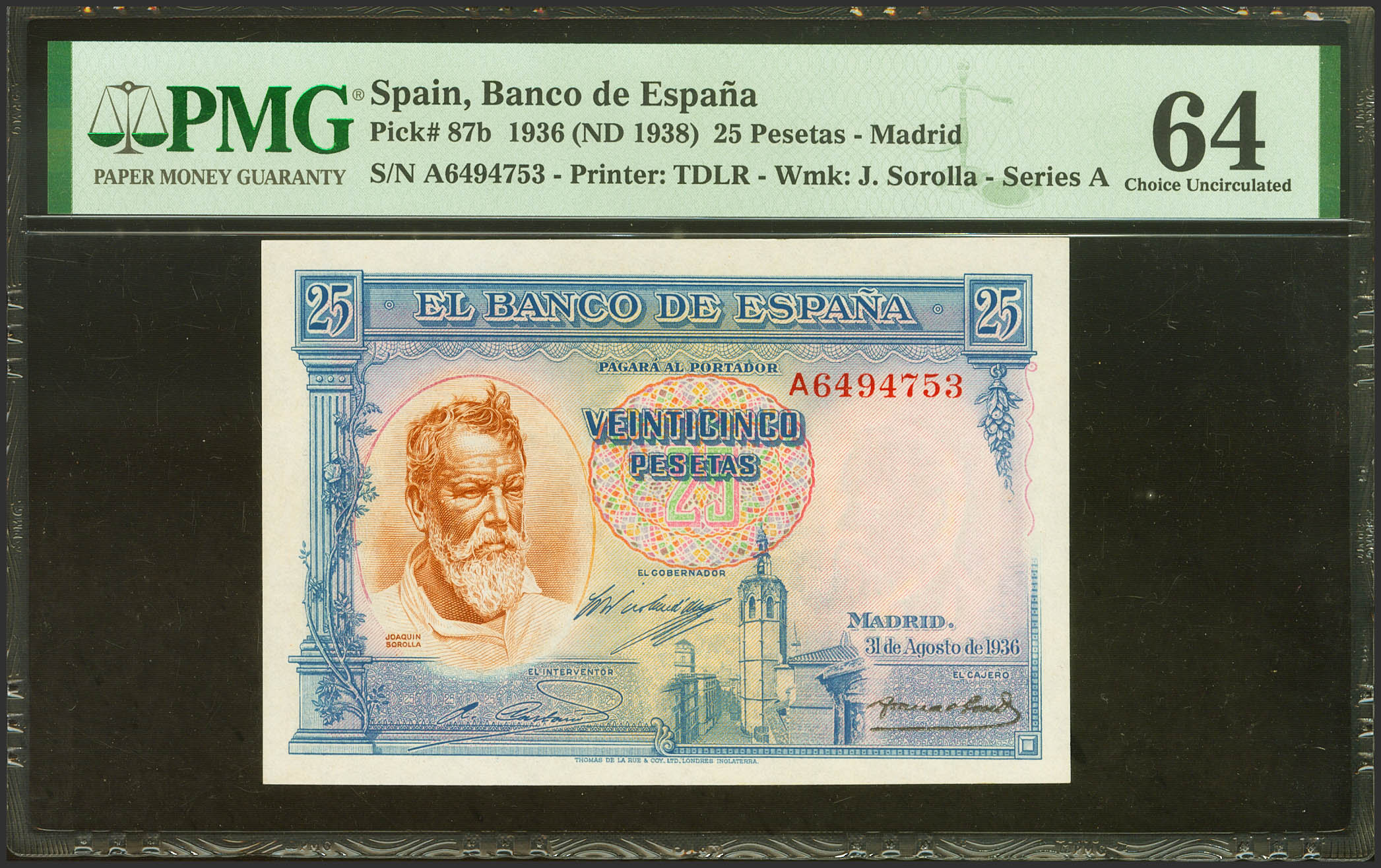 25 Pesetas. 31 de Agosto de 1936. Serie A. (Edifil 2023: 367a, Pick: 87b). Inusual en esta calidad. Encapsulado PMG64.
