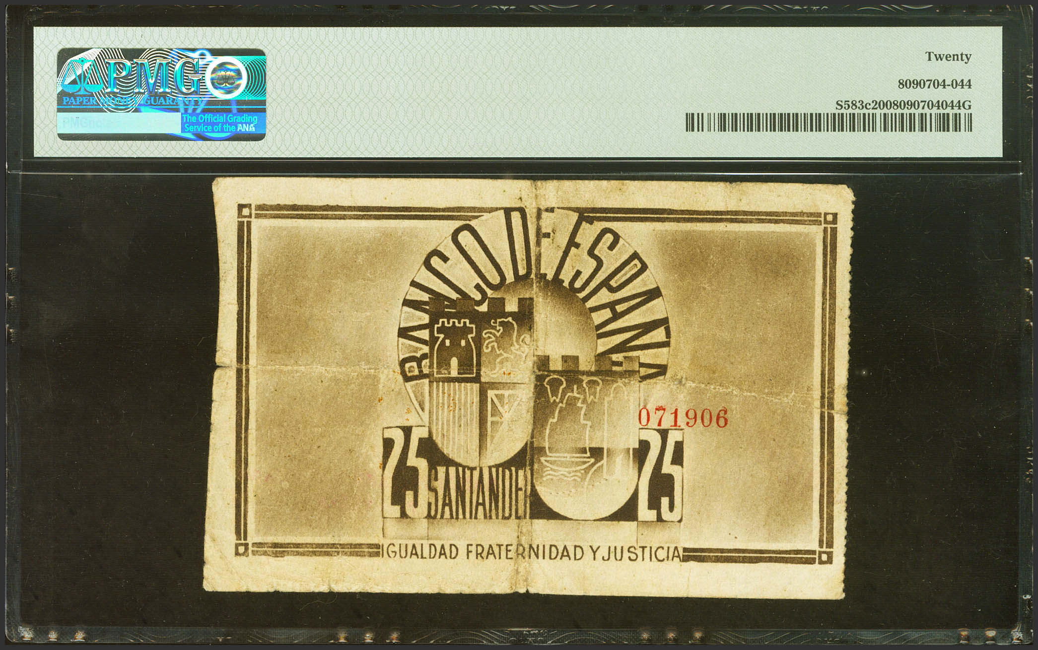 25 Pesetas. 1 de Noviembre de 1936. Banco de Santander, con la antefirma Hispano Americano. (Edifil 2023: 377c, Pick: S583c). Inusual. MBC+. Encapuslado PMG20.