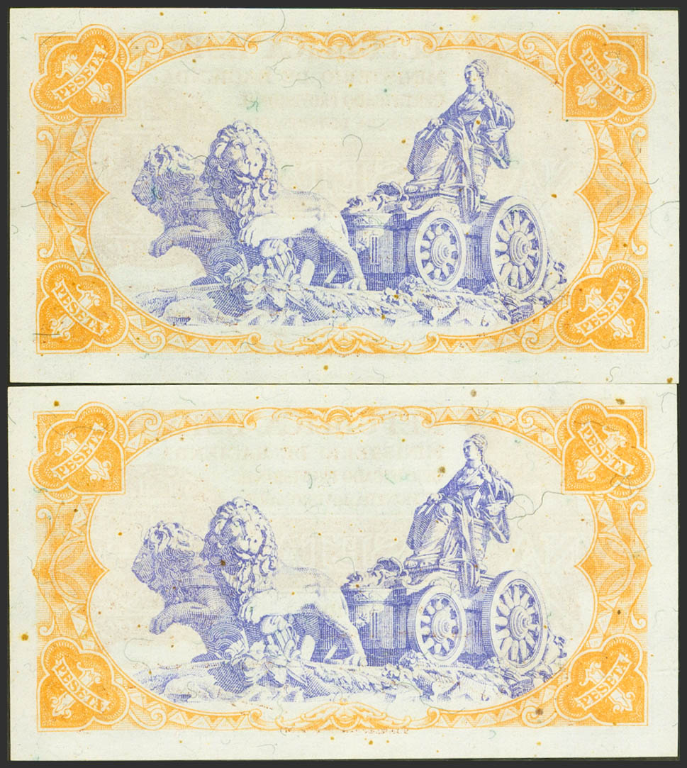 1 Peseta. 1937. Ministerio de Hacienda. Pareja correlativa. Serie B. (Edifil 2023: 392). Apresto original, típicos puntitos. SC.