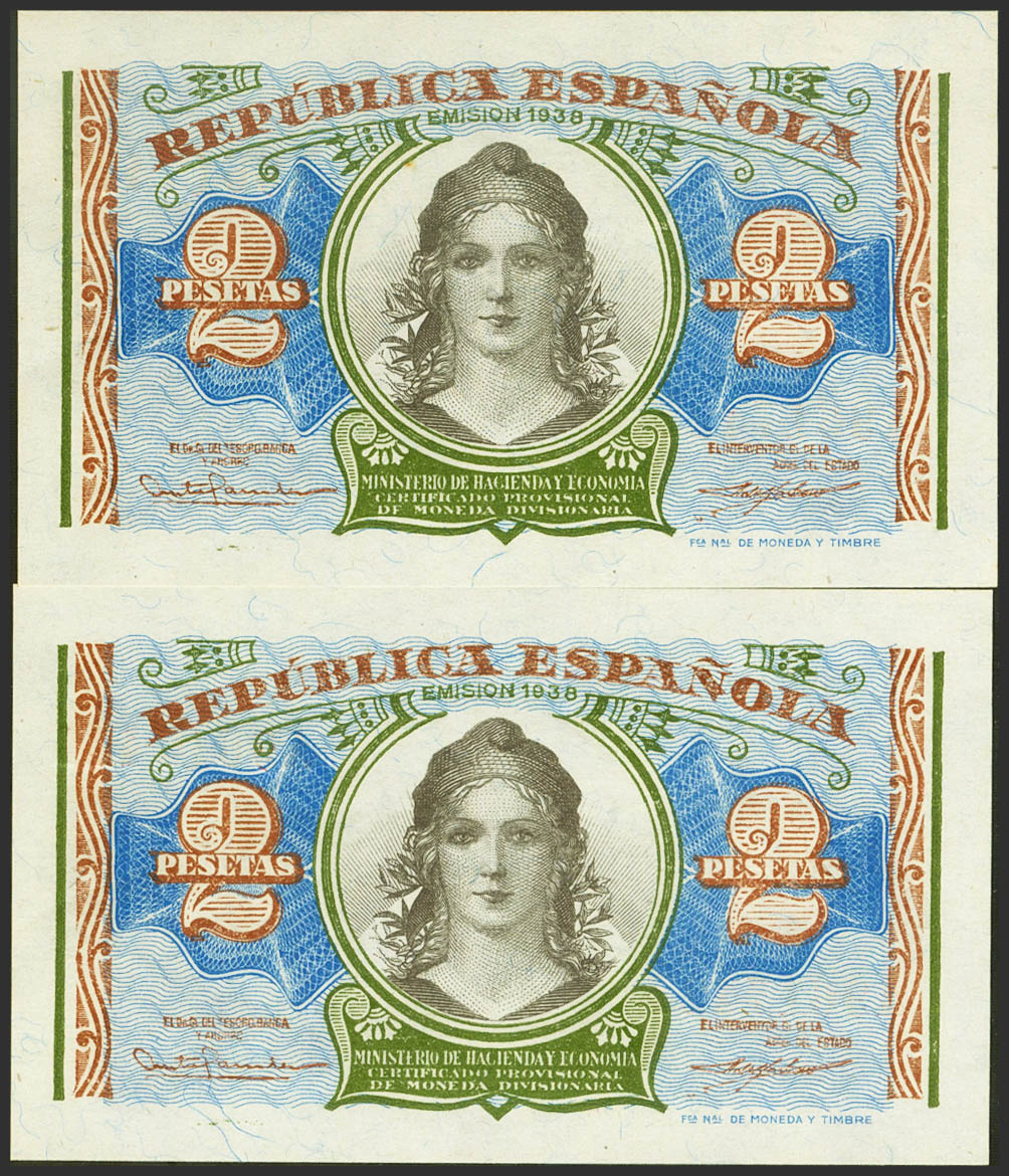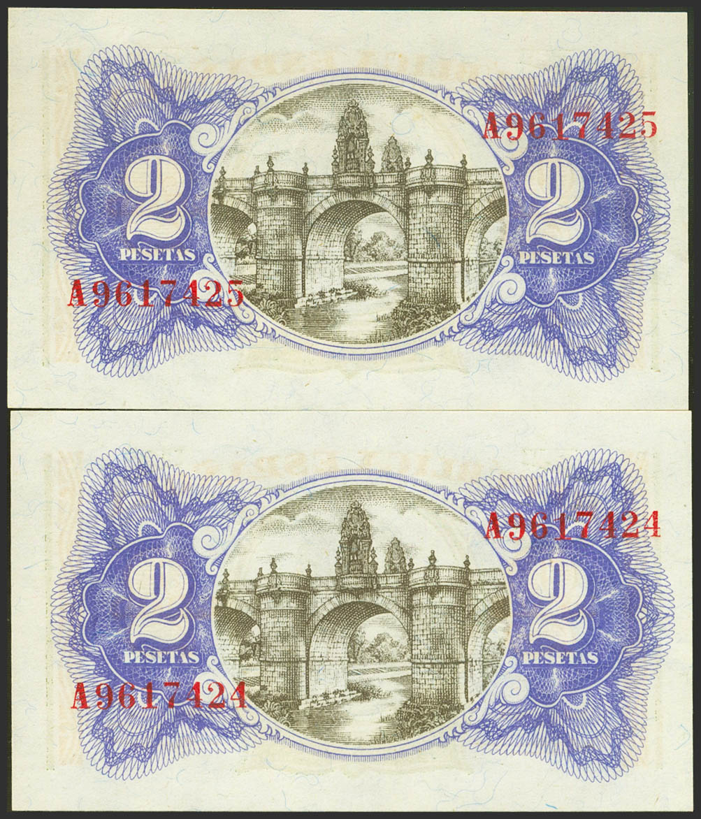 2 Pesetas. 1937. Pareja correlativa. Serie A. (Edifil 2023: 393). Apresto original. SC-.