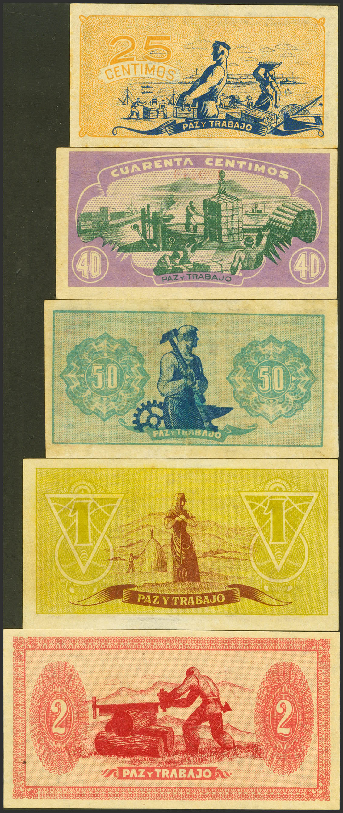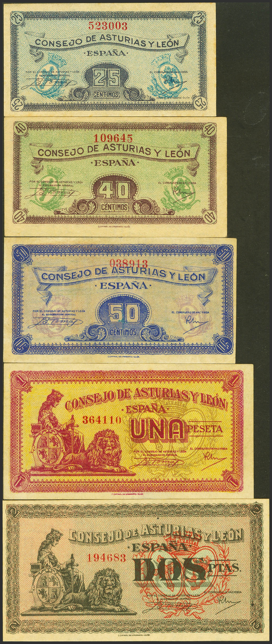 Serie completa incluyendo el 25 Céntimos, 40 Céntimos, 50 Céntimos, 1 Peseta y 2 Pesetas de 1937 de Asturias y León, todos ellos sin serie. (Edifil 2023: 394/98). SC/MBC+ (el 50 cts MBC+).