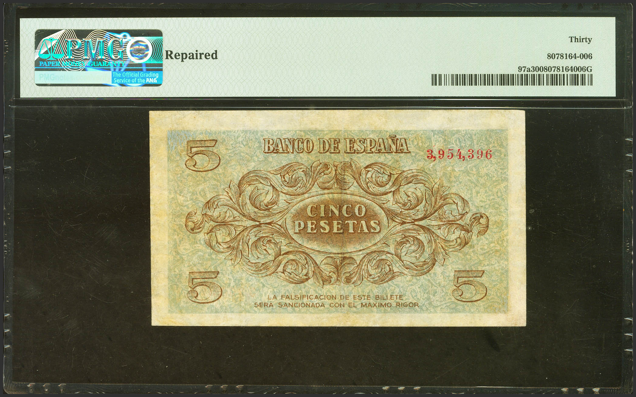 5 Pesetas. 21 de Noviembre de 1936. Sin serie. (Edifil 2023: 417, Pick: 97a). Inusual, reparado. MBC+. Encapsulado PMG30 (repaired).