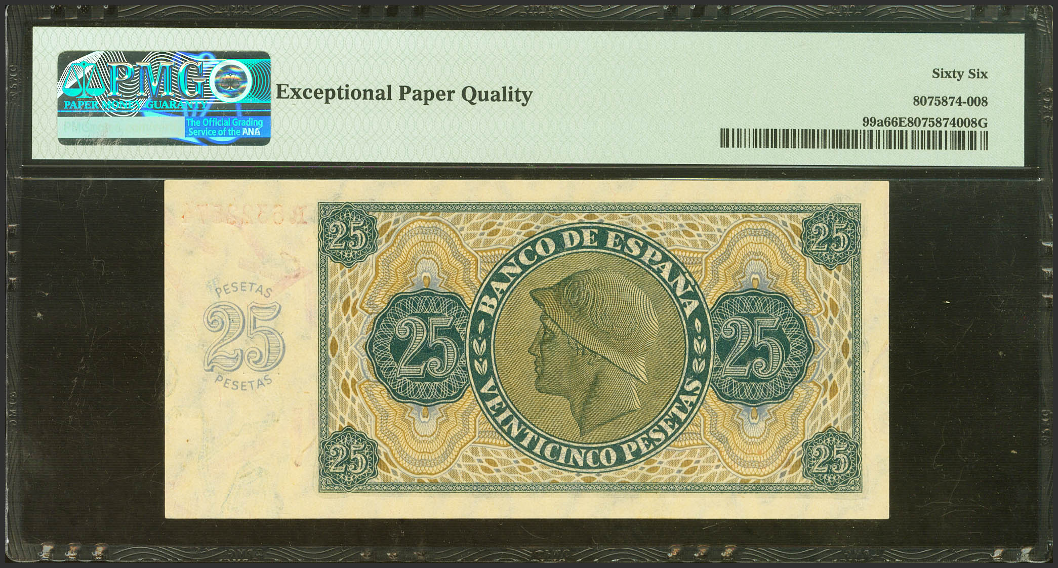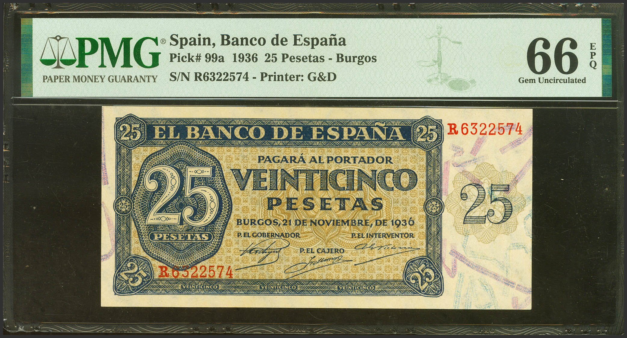 25 Pesetas. 21 de Noviembre de 1936. Serie R. (Edifil 2023: 419a, Pick: 99a). Inusual en esta excepcional calidad, apresto original. Encapsulado PMG66EPQ.