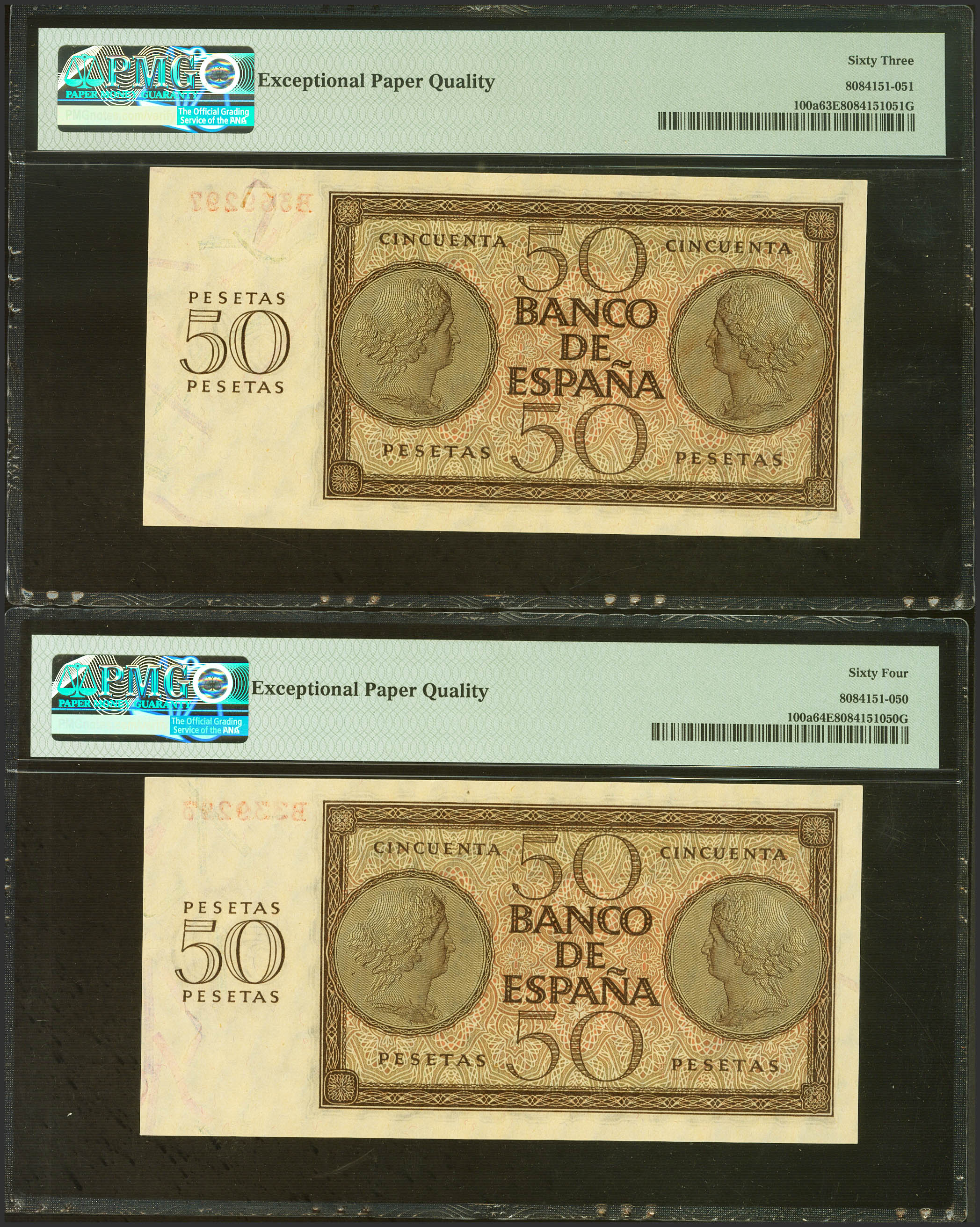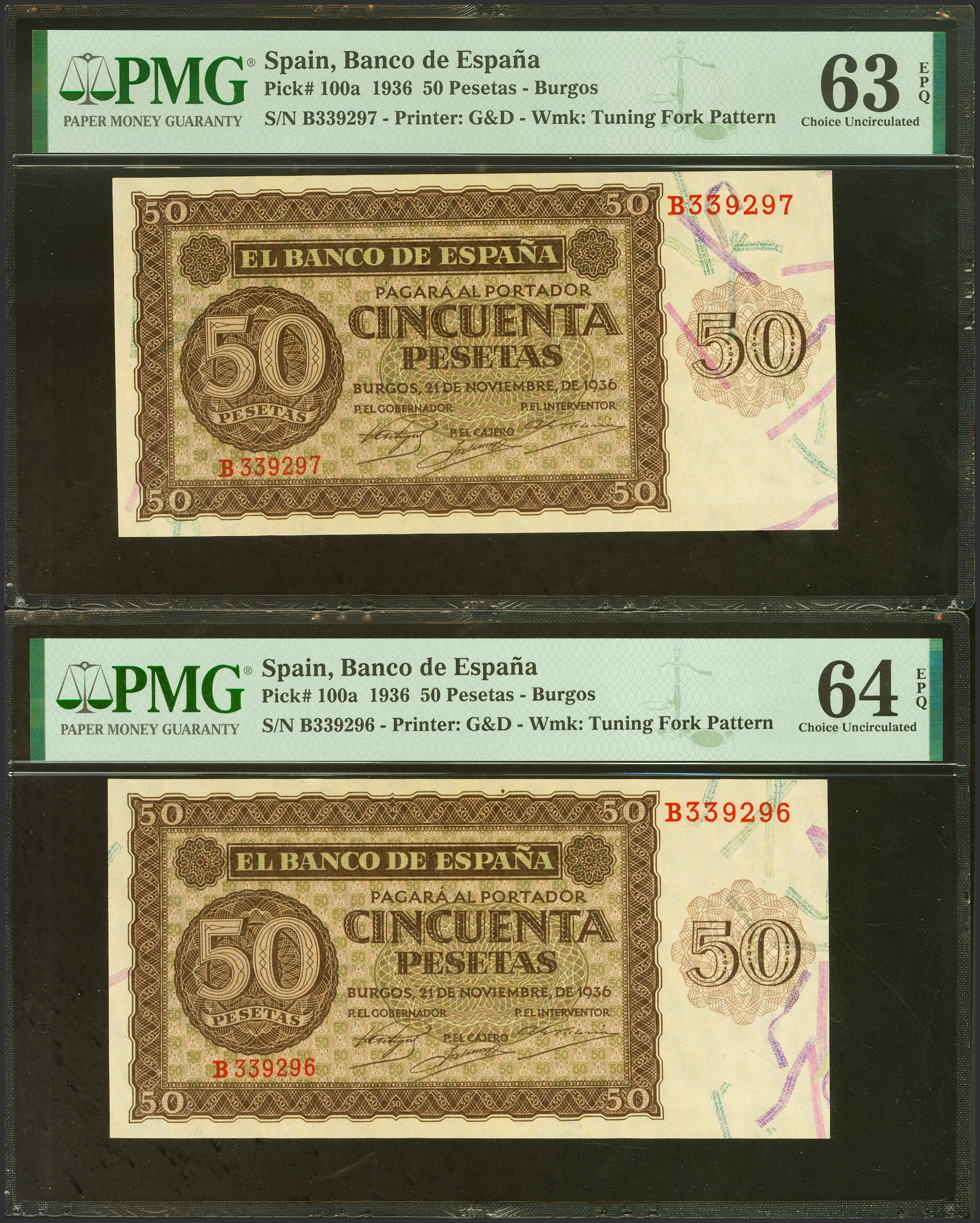50 Pesetas. 21 de Noviembre de 1936. Pareja correlativa. Serie B. (Edifil 2023: 420a, Pick: 100a). Muy rara especialmente en esta excepcional calidad, apresto original. SC. Encapsulados PMG 64EPQ/63EPQ