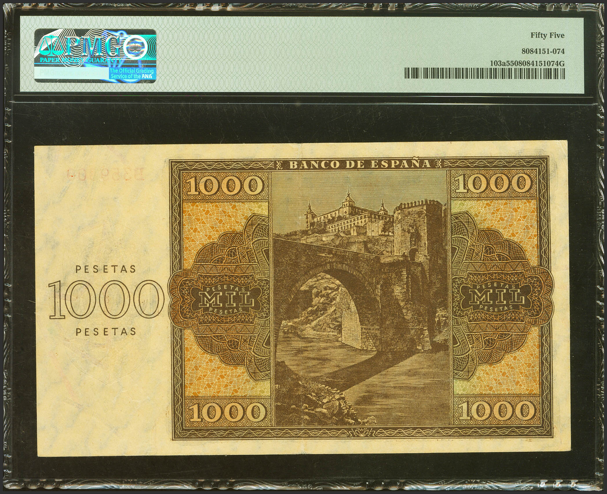 1000 Pesetas. 21 de Noviembre de 1936. Serie B. (Edifil 2023: 423a, Pick: 103a). Muy raro en esta calidad. EBC+. Encapsulado PMG55.