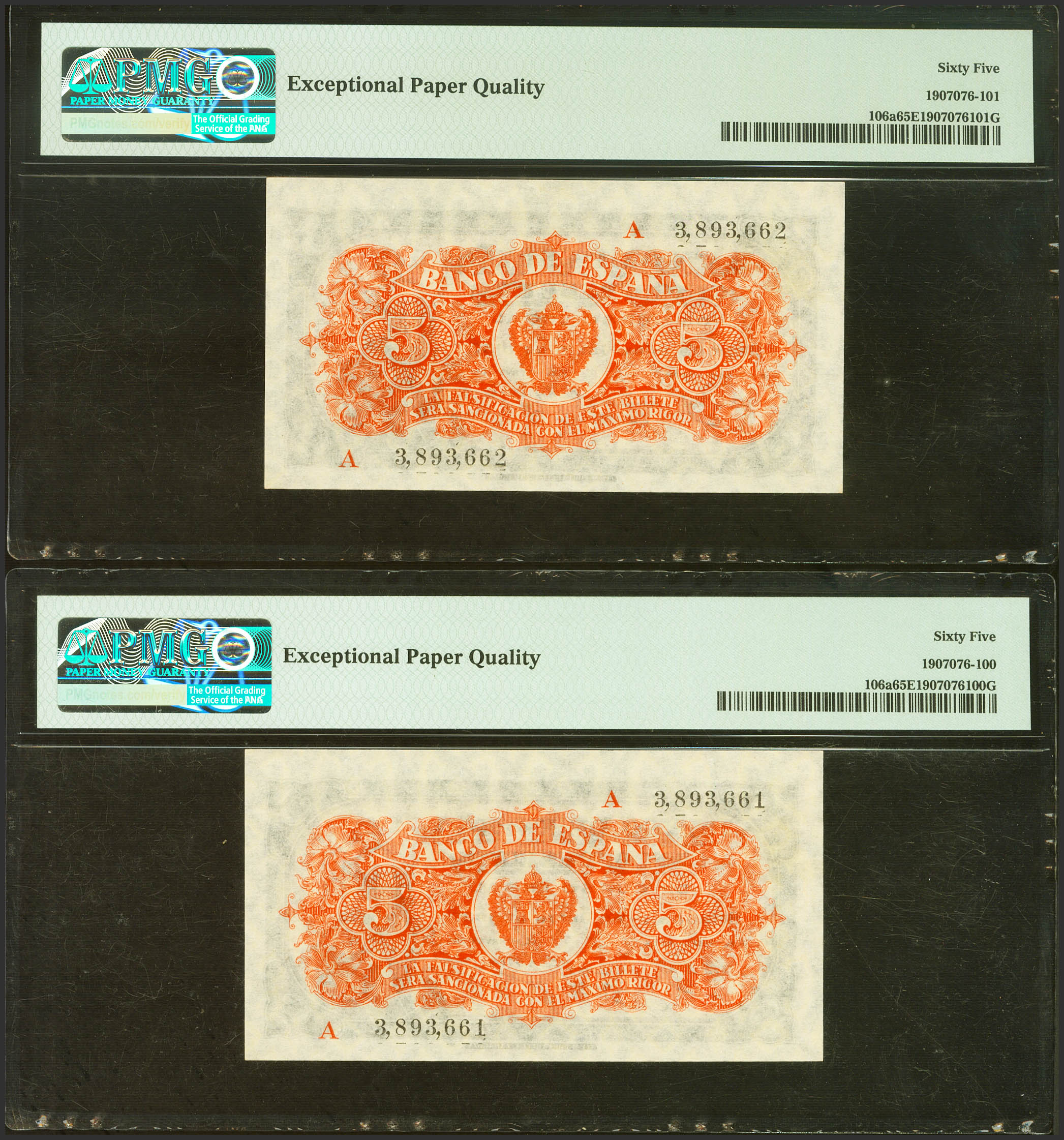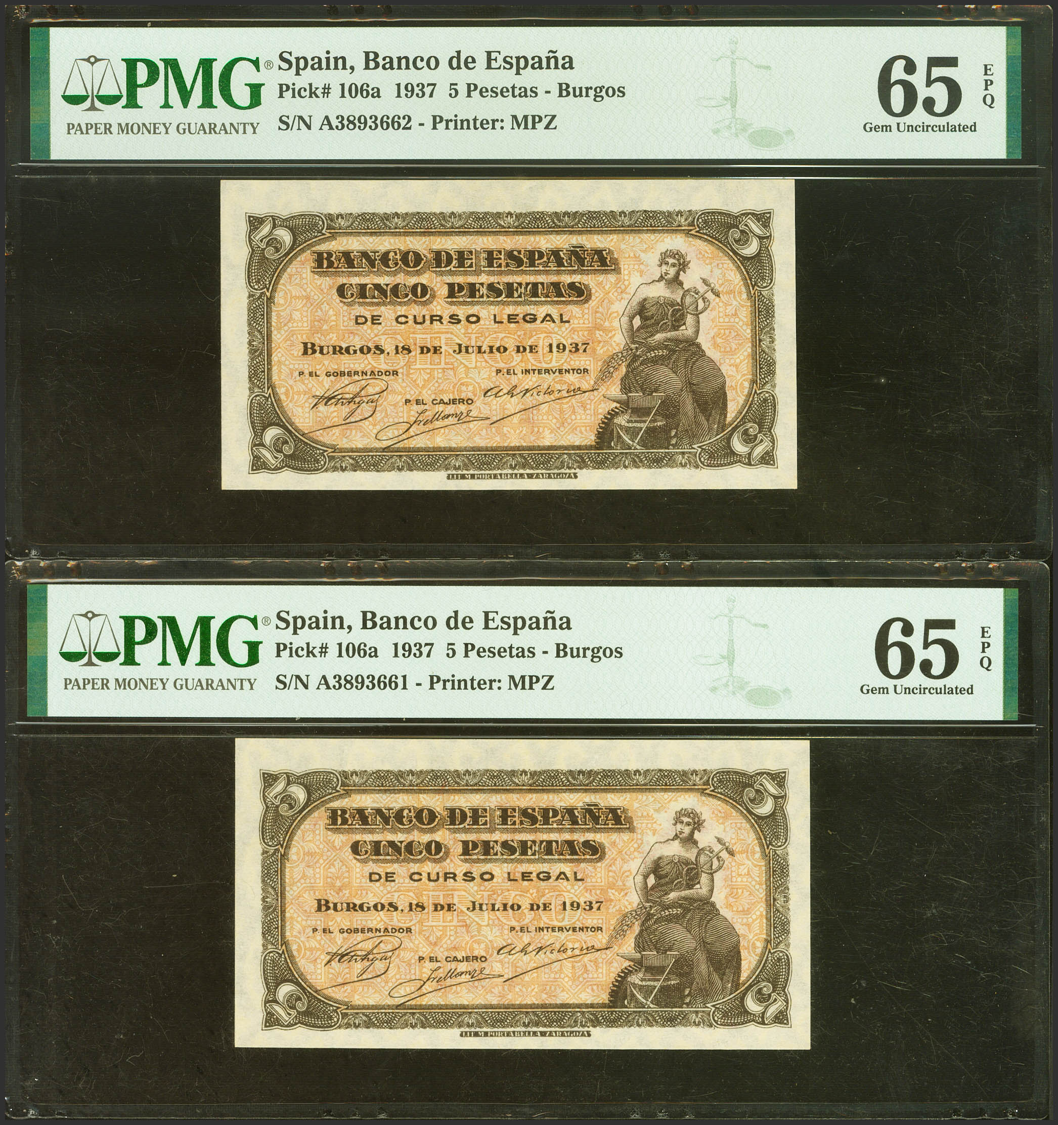 5 Pesetas. 18 de Julio de 1937. Pareja correlativa. Serie A. (Edifil 2023: 424a, Pick: 106a). Rara en esta excepcional calidad, apresto original. SC. Encapsulados PMG65EPQ, ambos.