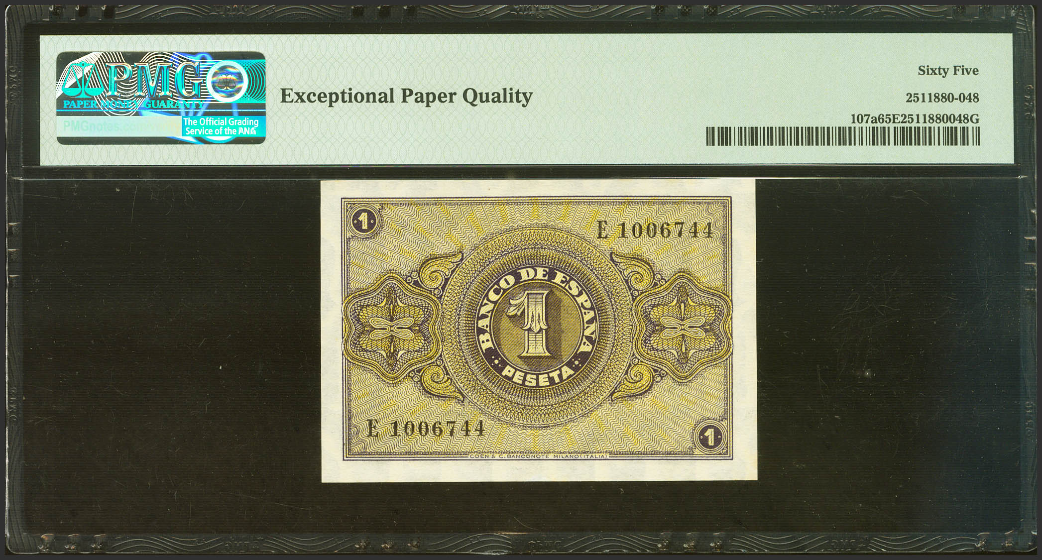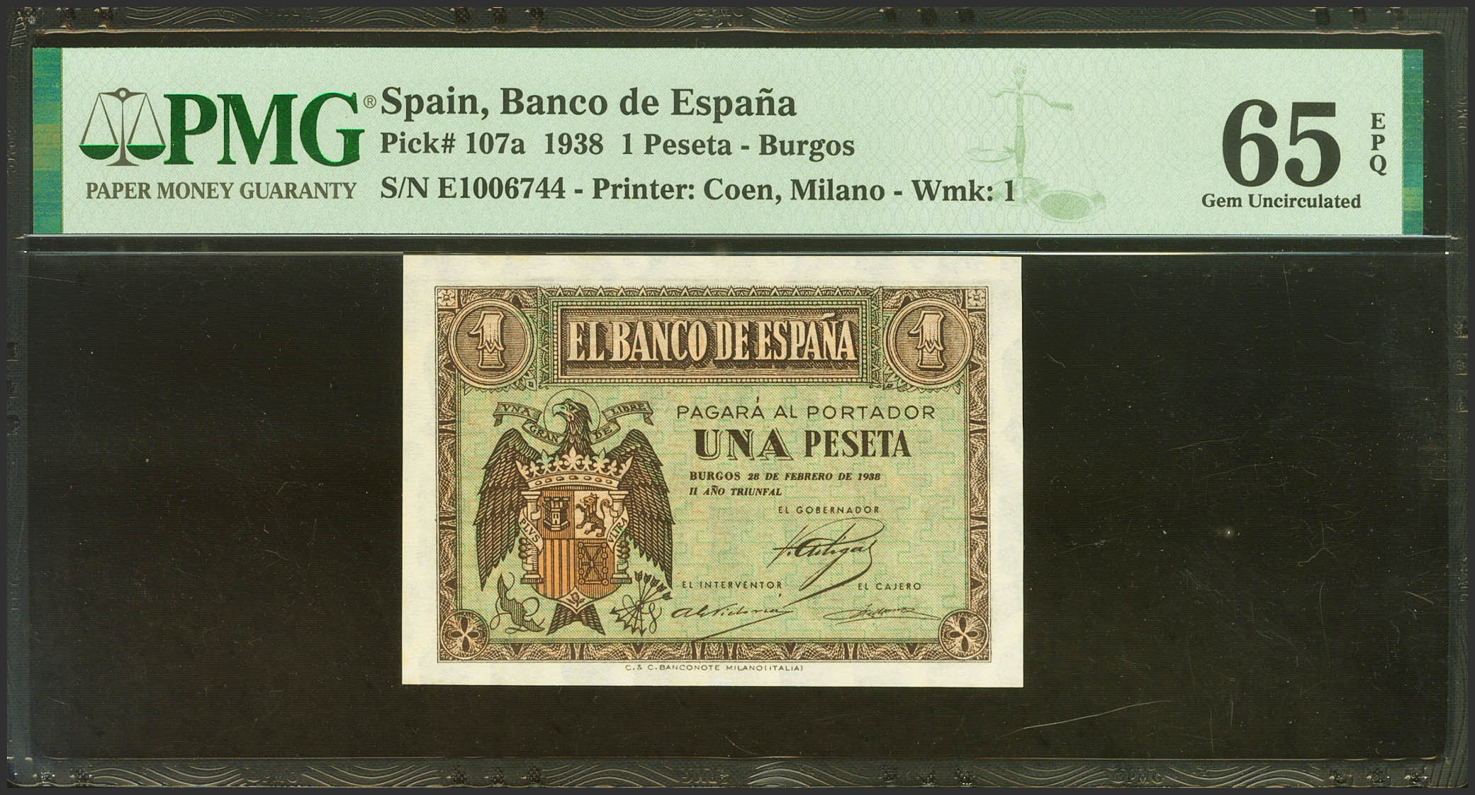 1 Peseta. 28 de Febrero de 1938. Serie E. (Edifil 2023: 427a, Pick: 107a). Apresto original. SC. Encapsulado PMG65EPQ.
