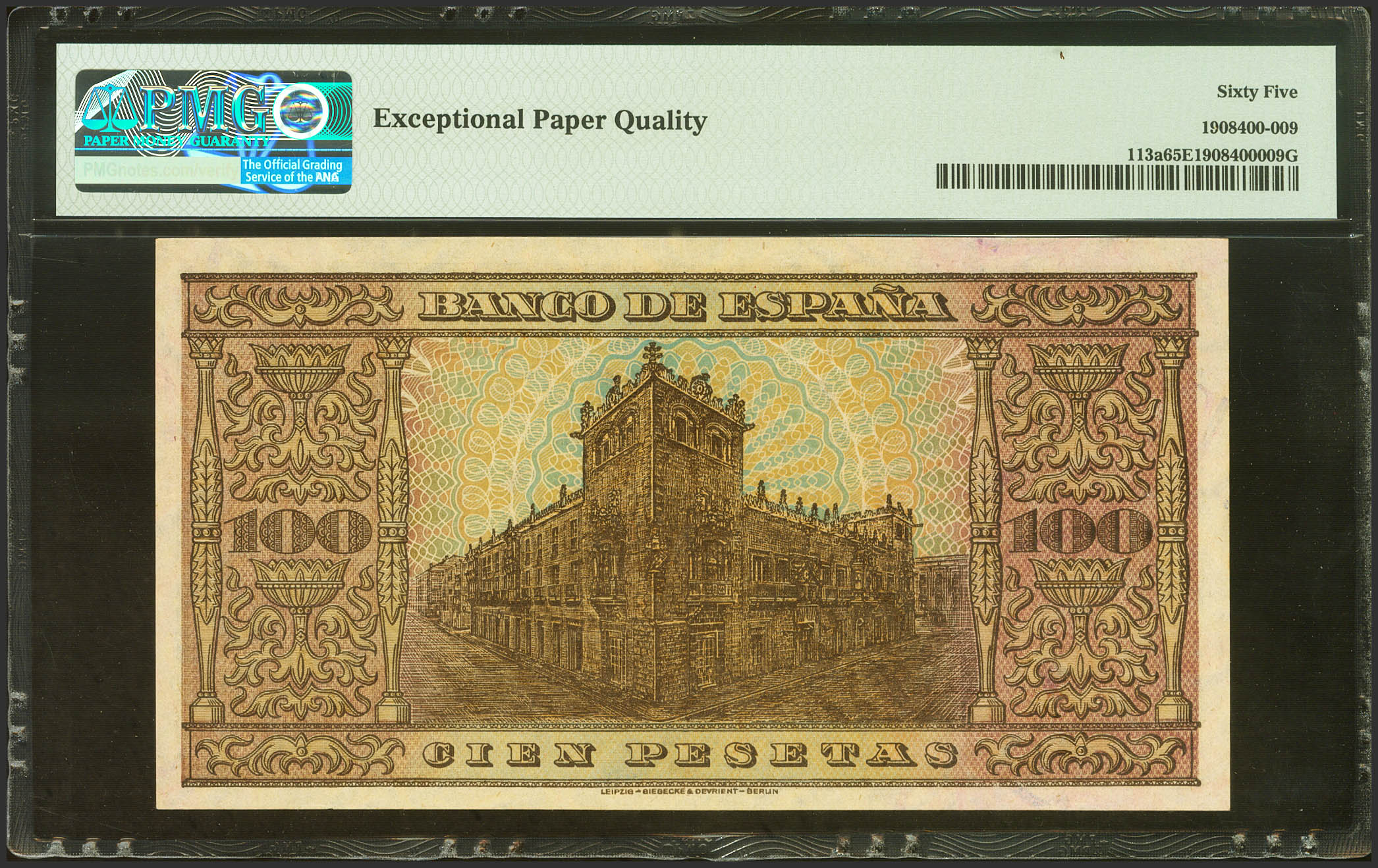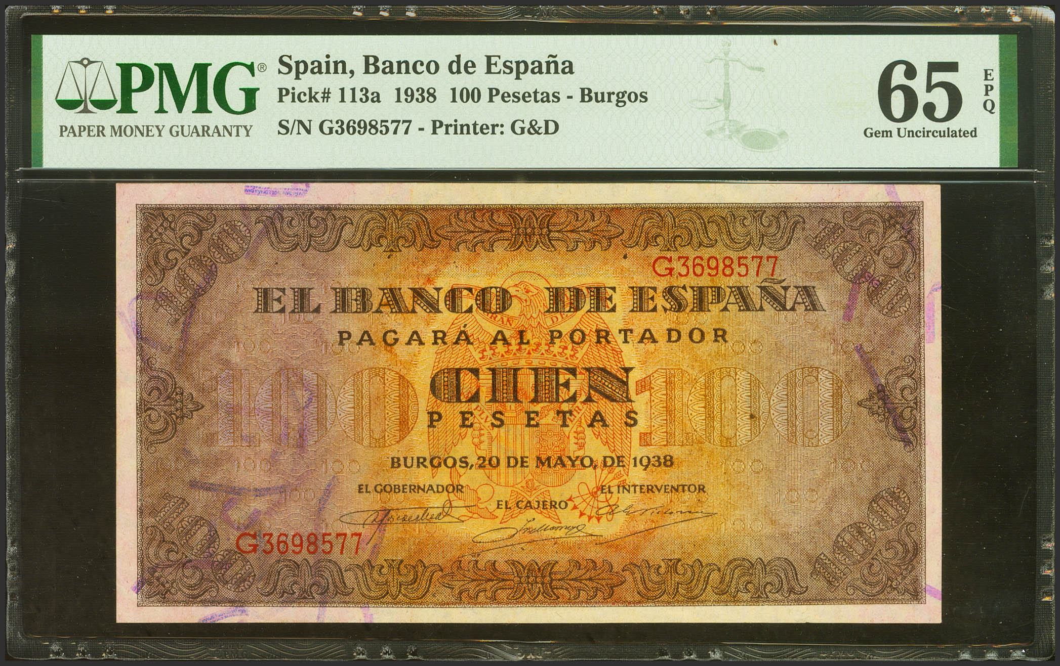 100 Pesetas. 20 de Mayo de 1938. Serie G. (Edifil 2023: 432a, Pick: 113a). Inusual en esta excepcional calidad, apresto original. SC. Encapsulado PMG65EPQ.