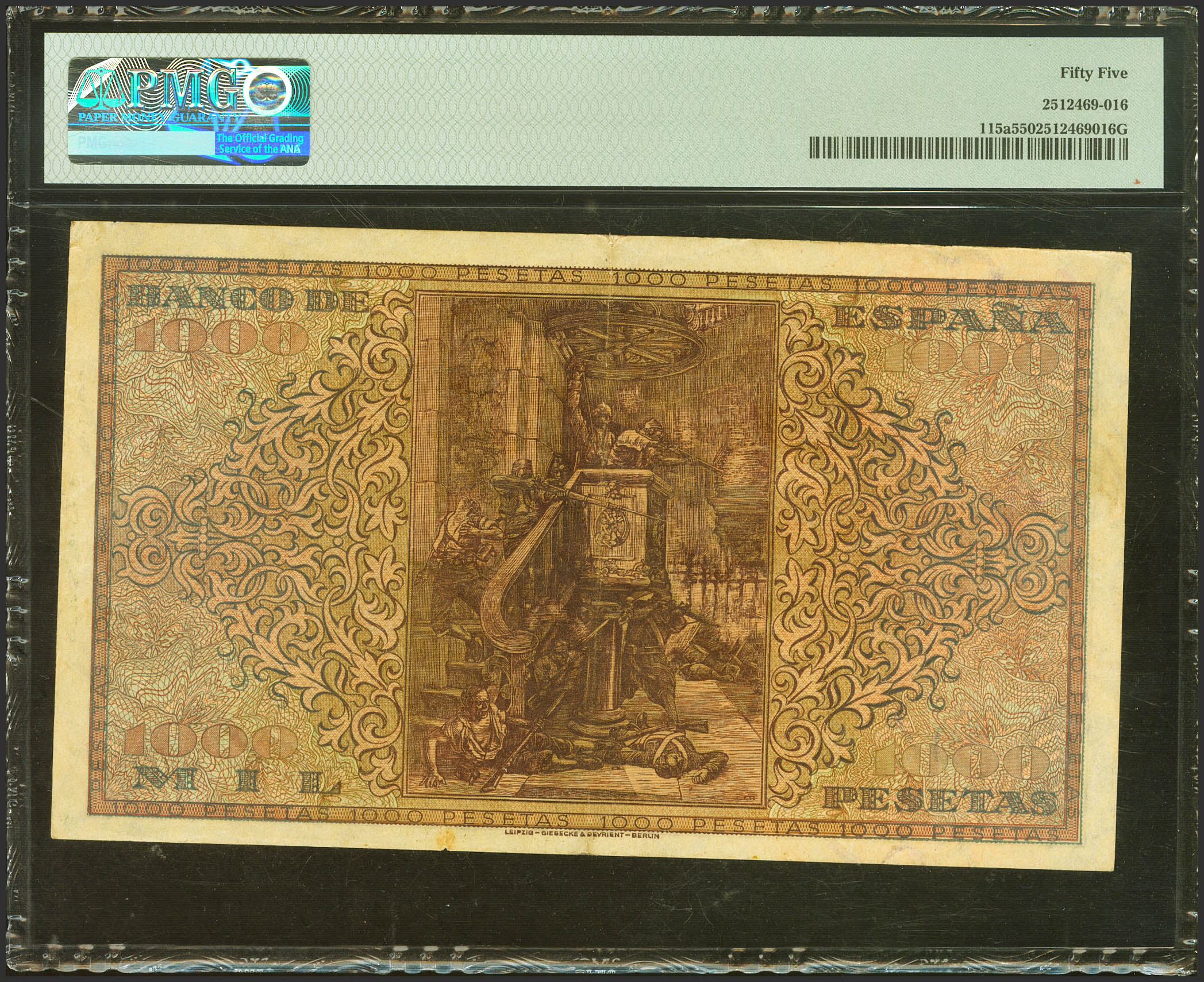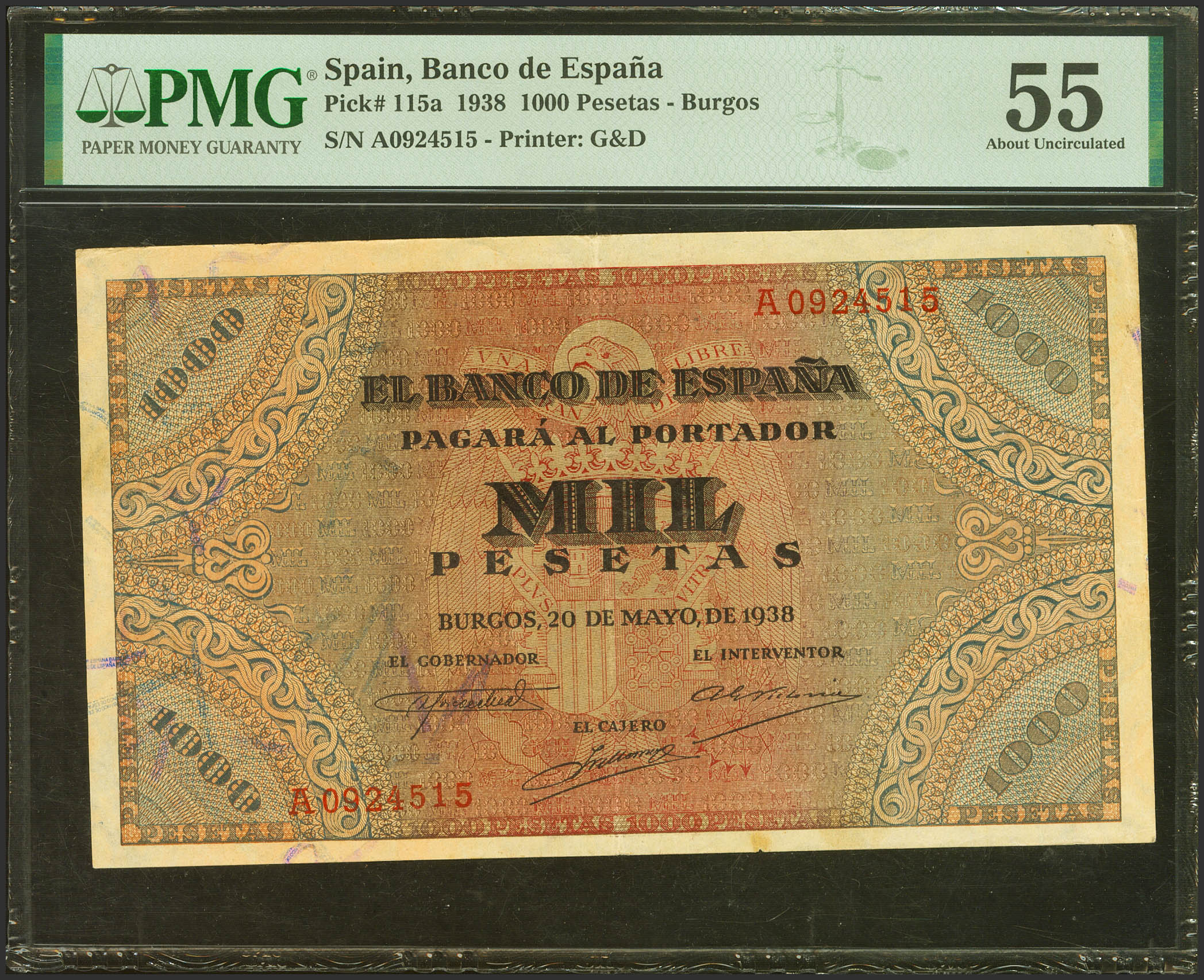 1000 Pesetas. 20 de Mayo de 1938. Serie A. (Edifil 2023: 434, Pick: 115a). Inusual en esta calidad. EBC+. Encapsulado PMG55.