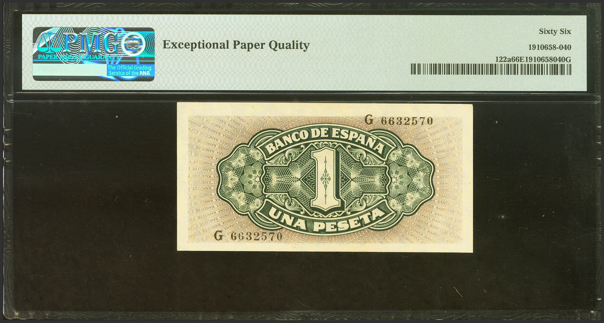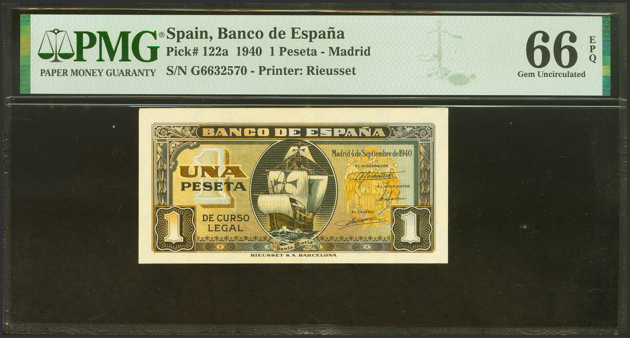 1 Peseta. 4 de Septiembre de 1940. Serie G. (Edifil 2023: 442a, Pick: 122a). Inusual en esta excepcional calidad, apresto original. SC. Encapsulado PMG66EPQ.