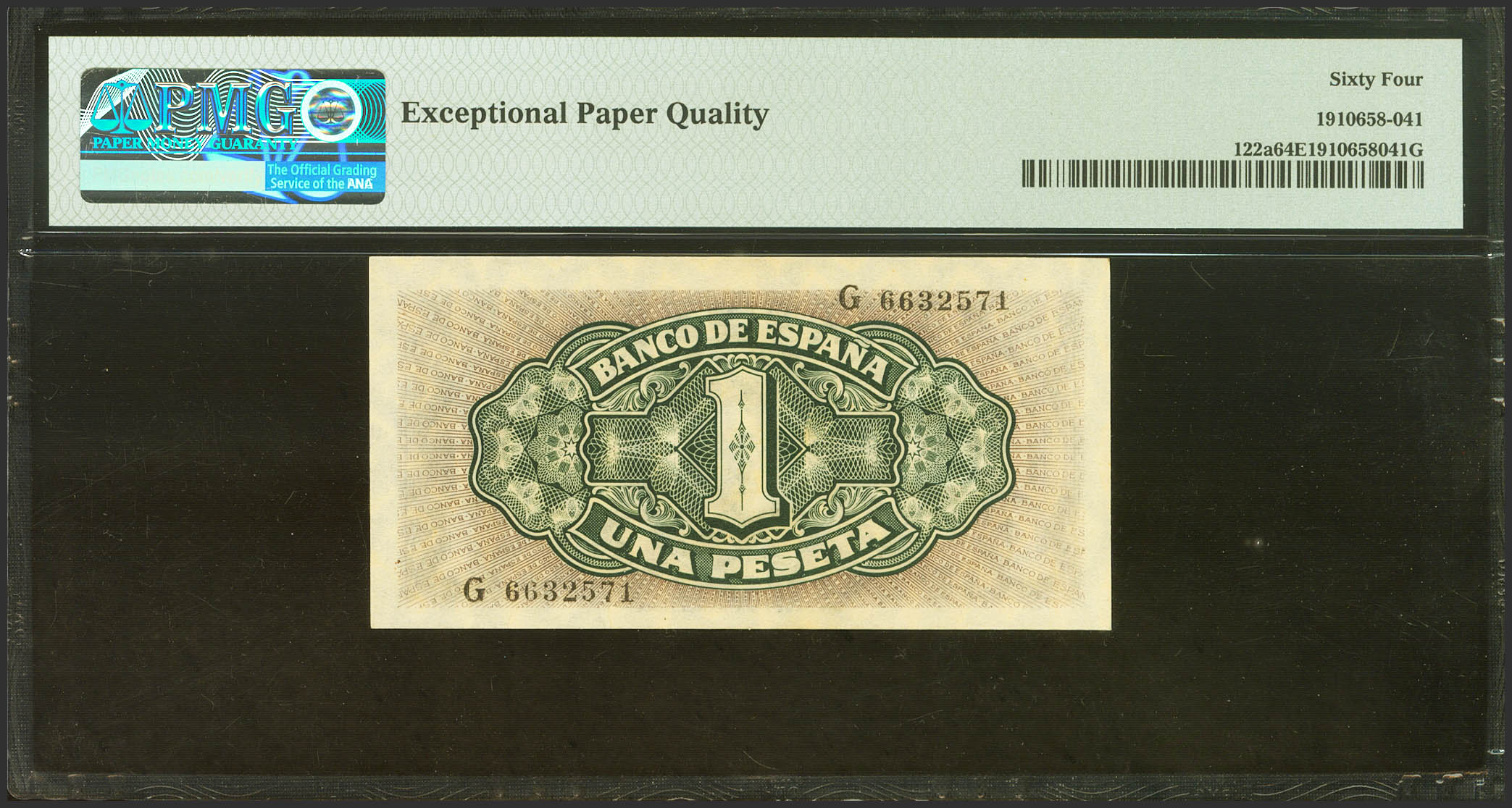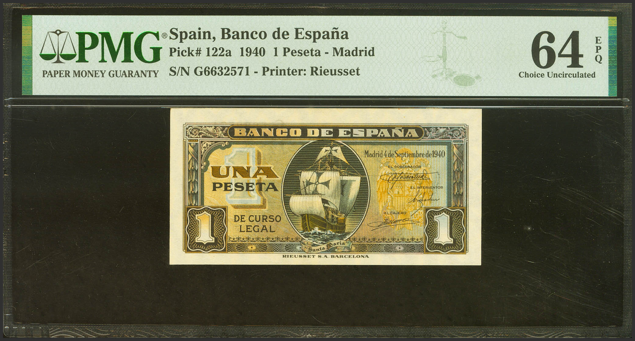 1 Peseta. 4 de Septiembre de 1940. Serie G. (Edifil 2023: 442a, Pick: 122a). Inusual en esta excepcional calidad, apresto original. SC. Encapsulado PMG64EPQ.