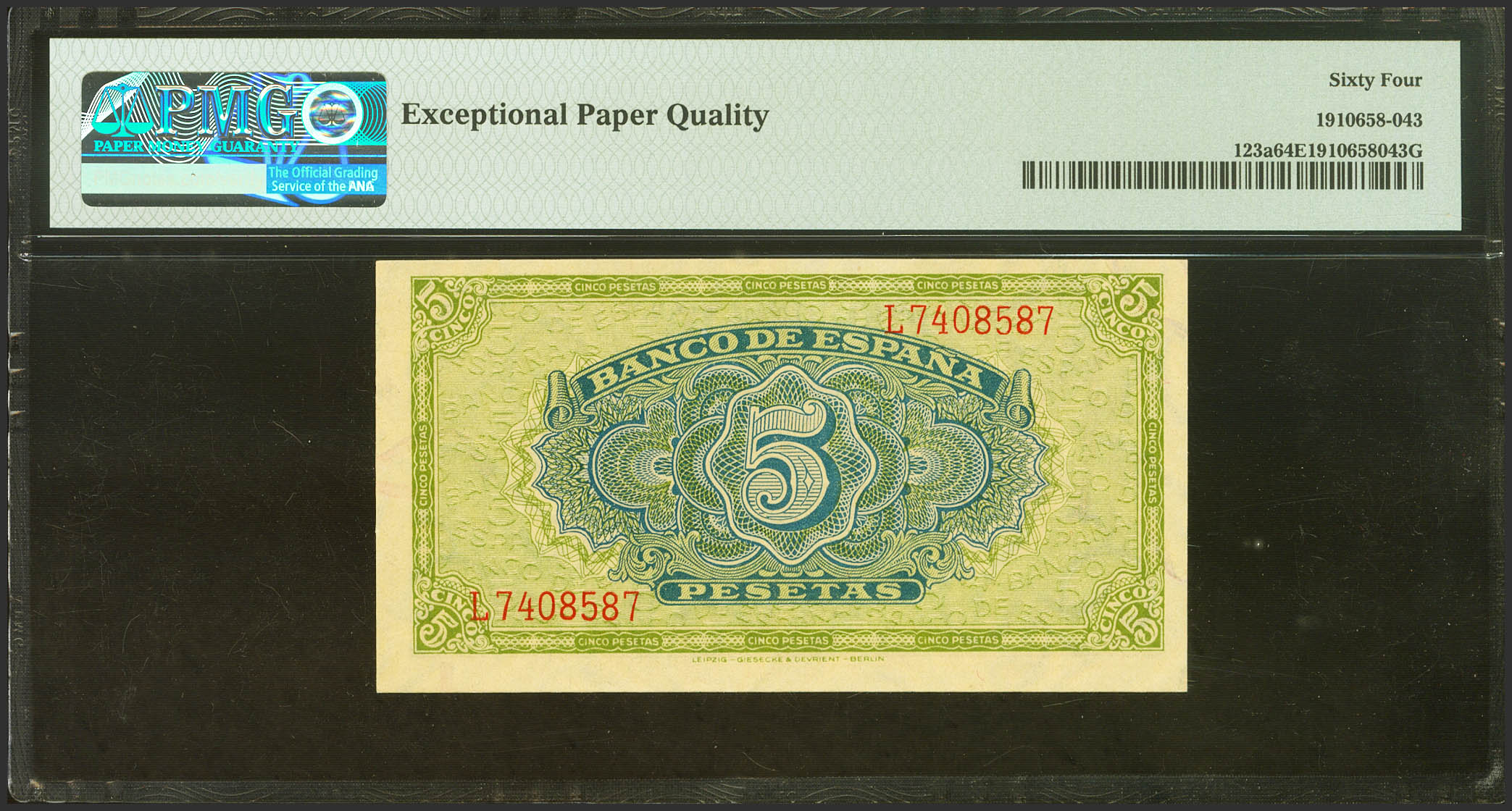 5 Pesetas. 4 de Septiembre de 1940. Serie L. (Edifil 2023: 443a, Pick: 123a). Apresto original. SC. Encapsulado PMG64EPQ.