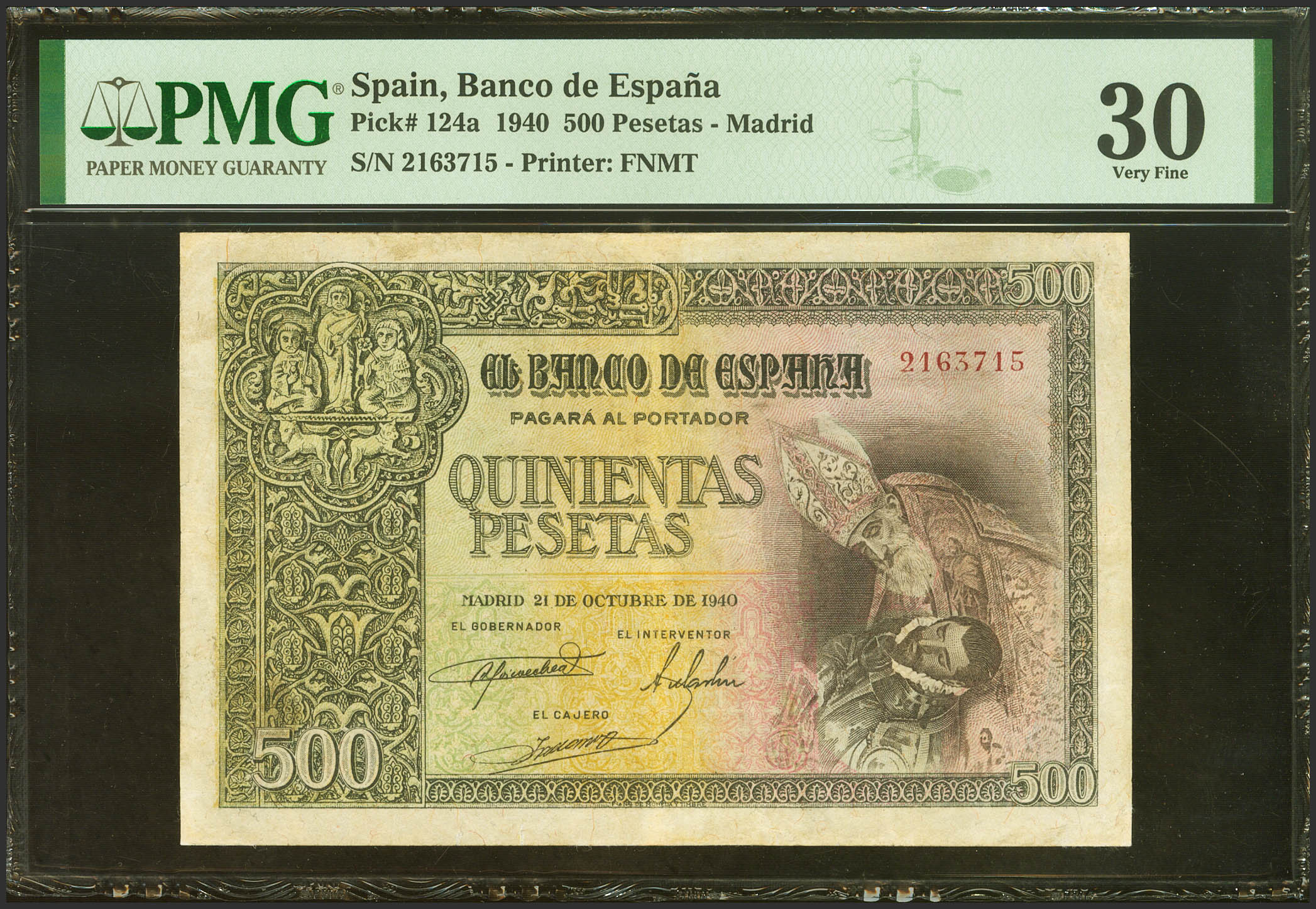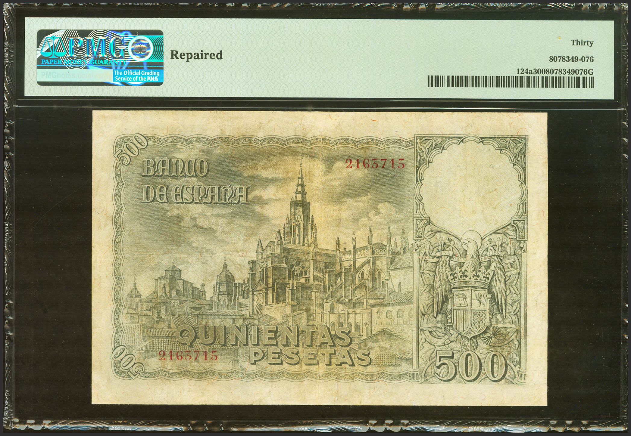 500 Pesetas. 21 de Octubre de 1940. Sin serie. (Edifil 2023: 444, Pick: 124a). EBC-. Encapsulado PMG30 (repaired).